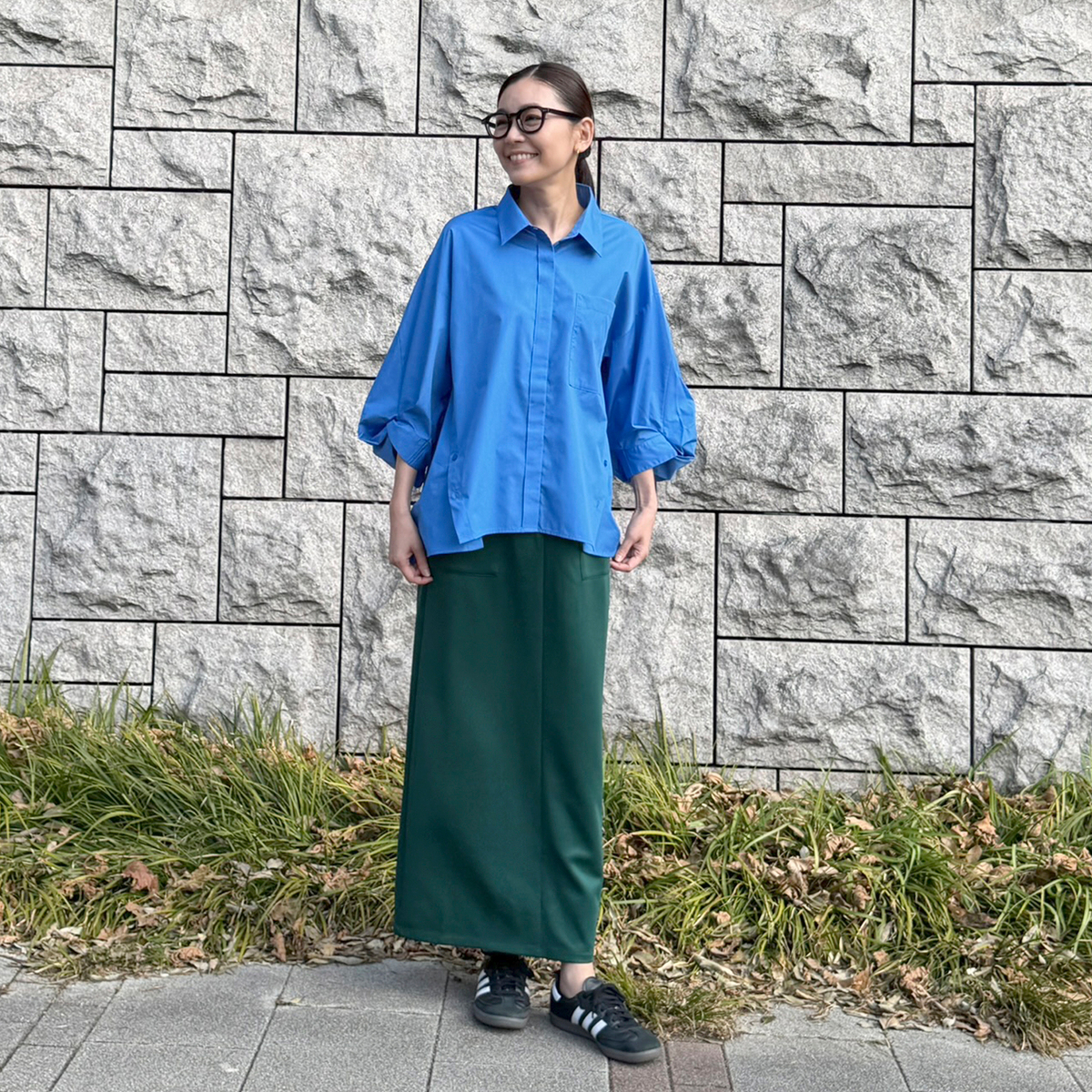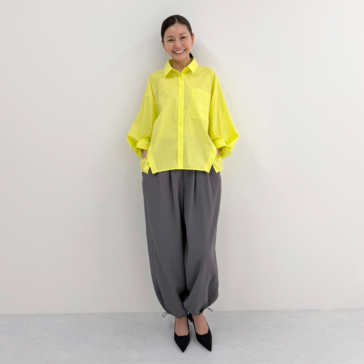 袖口を変形させてアクセントを効かせてデザイン。袖にボリューム感が生まれ、モード感とこなれ感も。フロントはあえて比翼仕立てにすることで、クリーンな印象が際立ちます