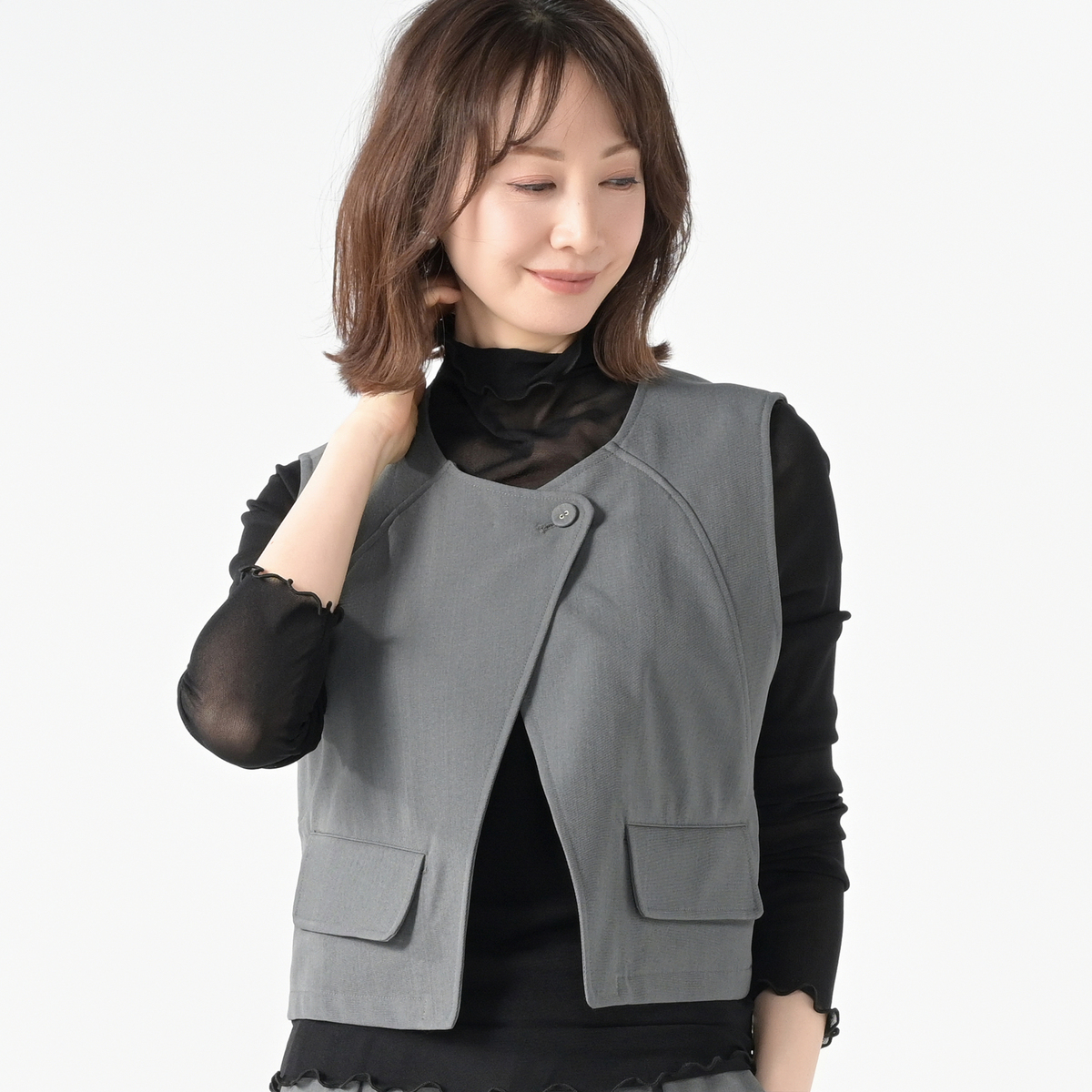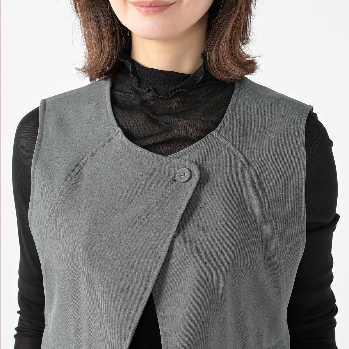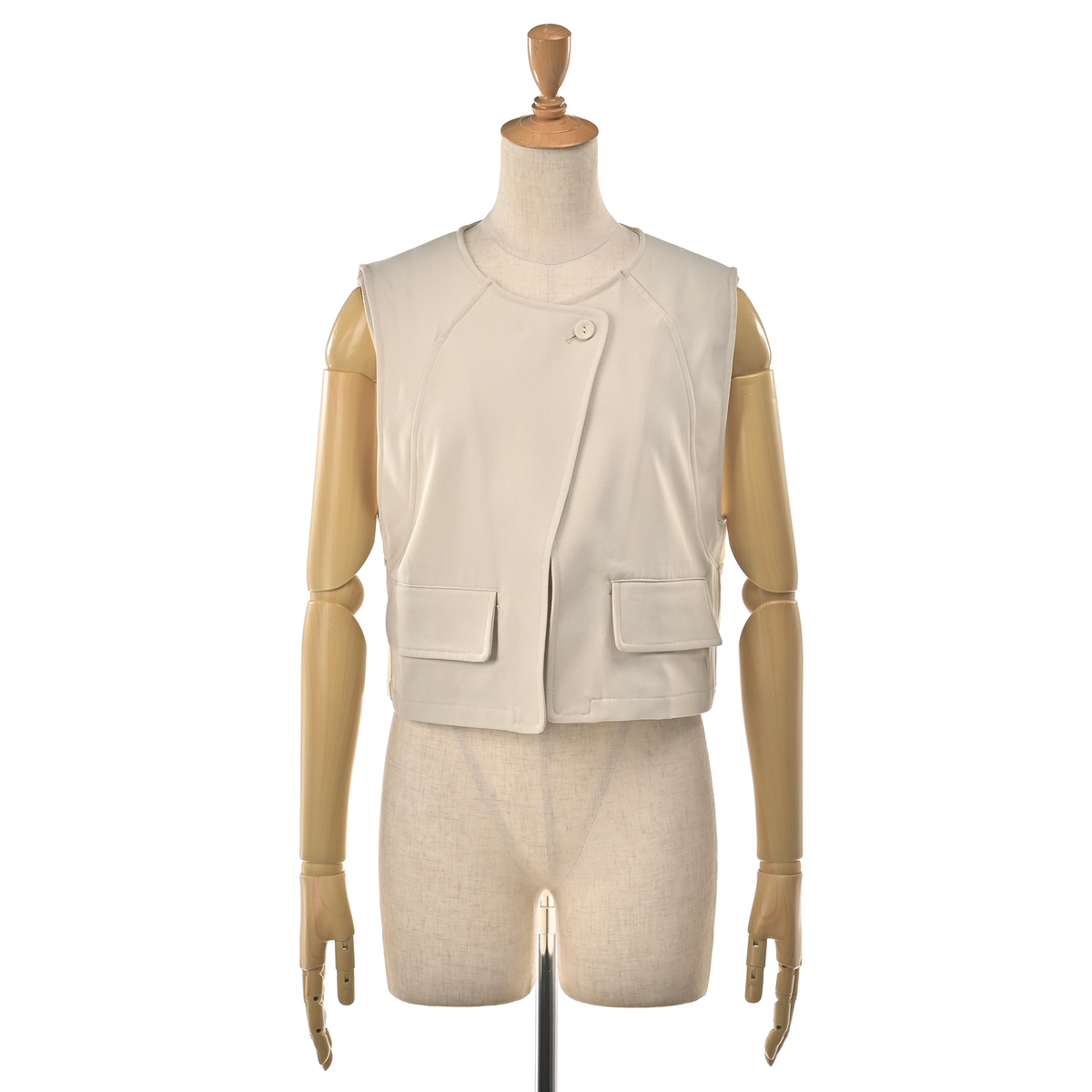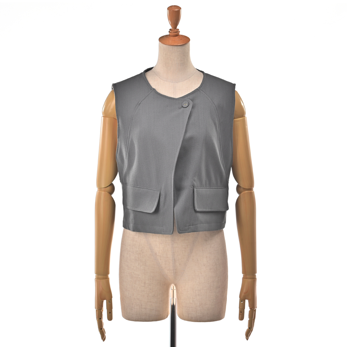 立体的なフォルムが映えるショート丈のジレ。ひとつのボタンがさり気ないアクセントとなり、上品な雰囲気を添えます。ワイドパンツとの組合せはもちろん、ワンピースやTシャツの上に羽織るだけで装いを軽やかに引き締めます。前身頃には便利なポケットもあしらいました