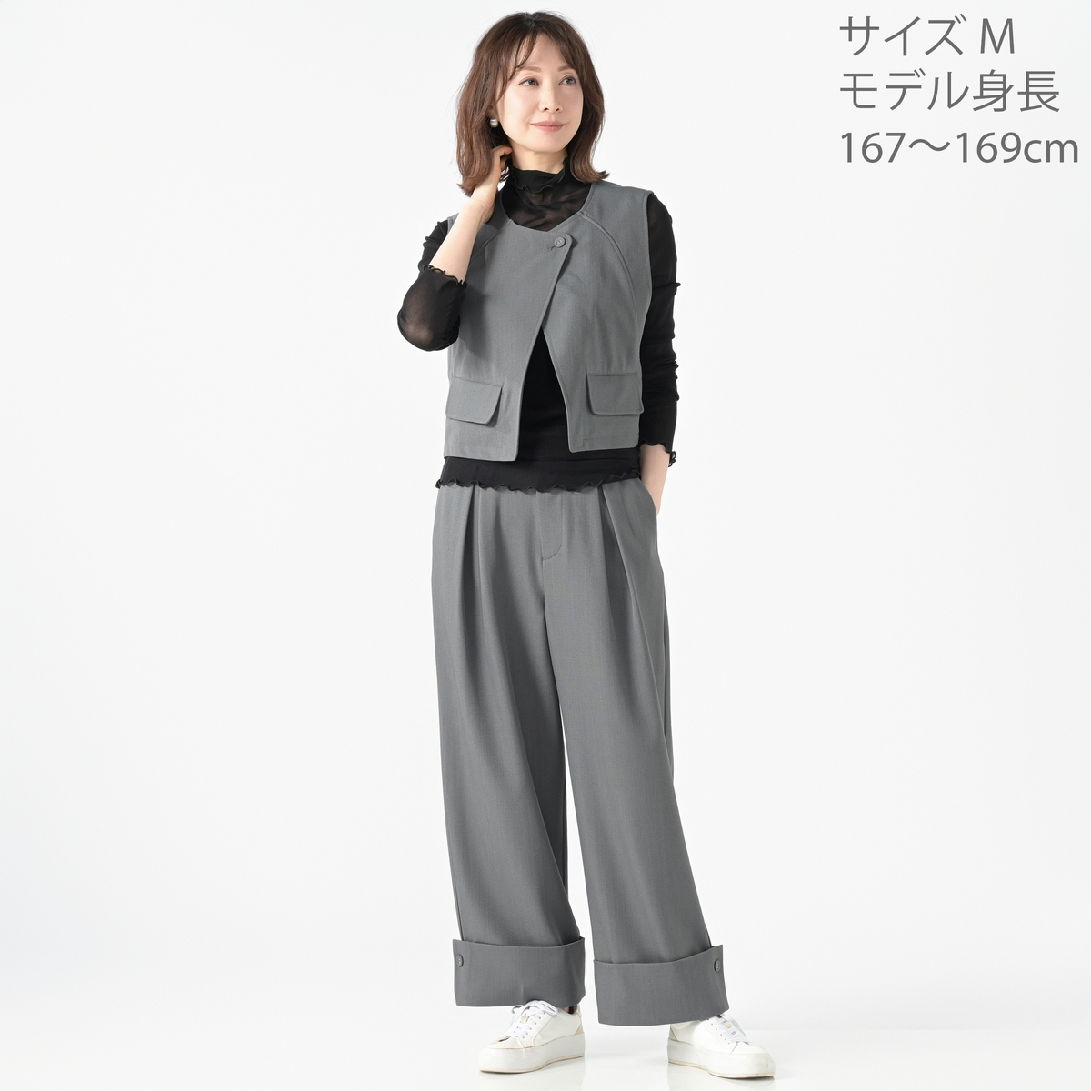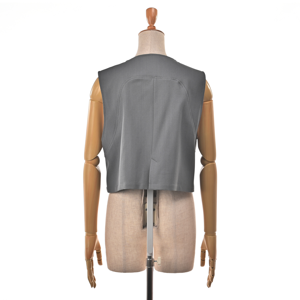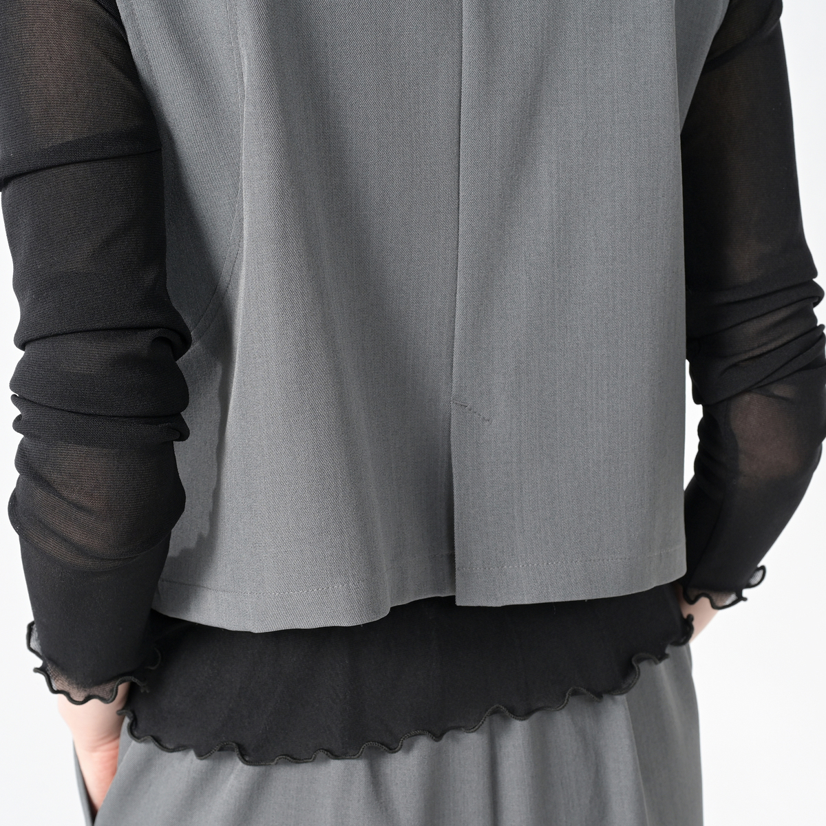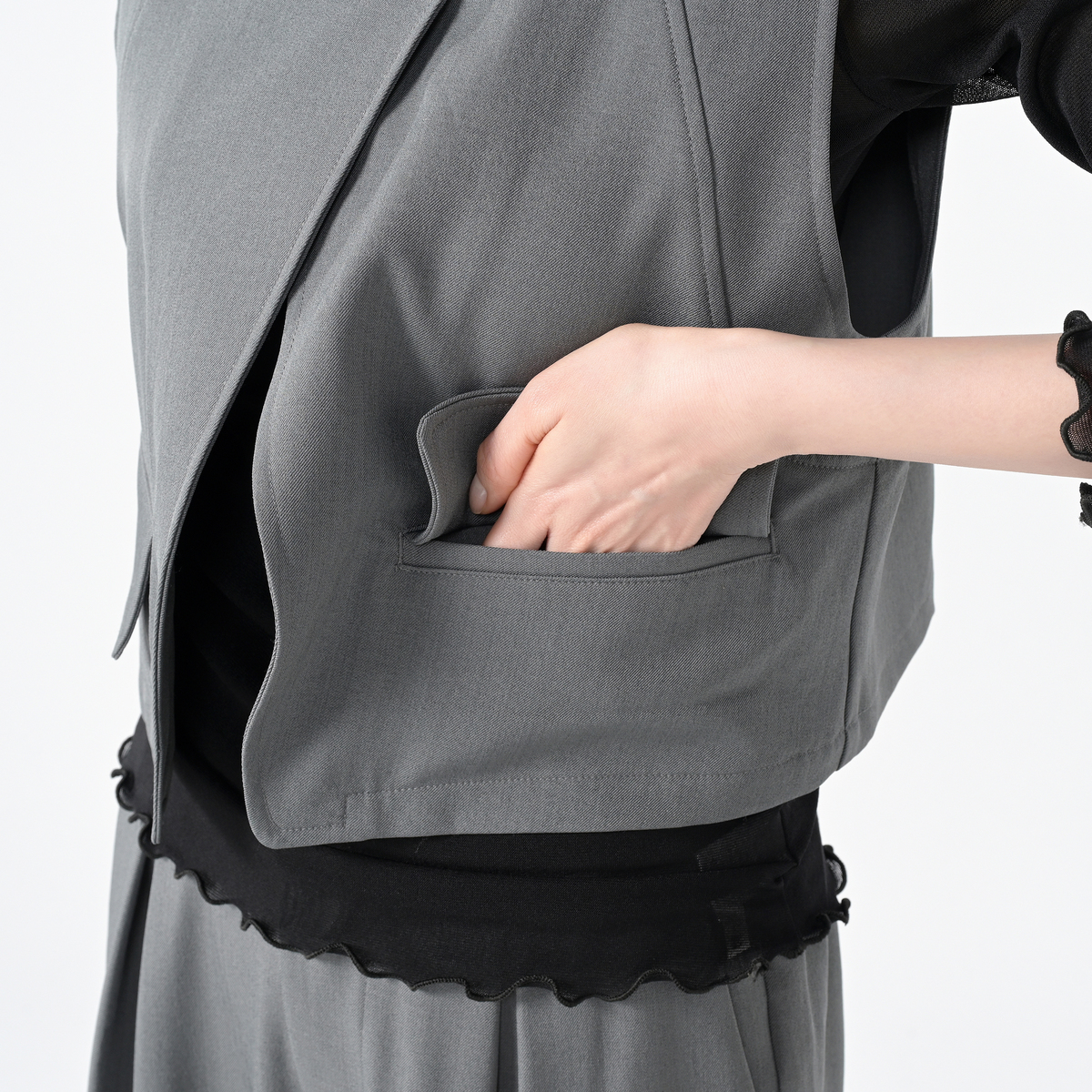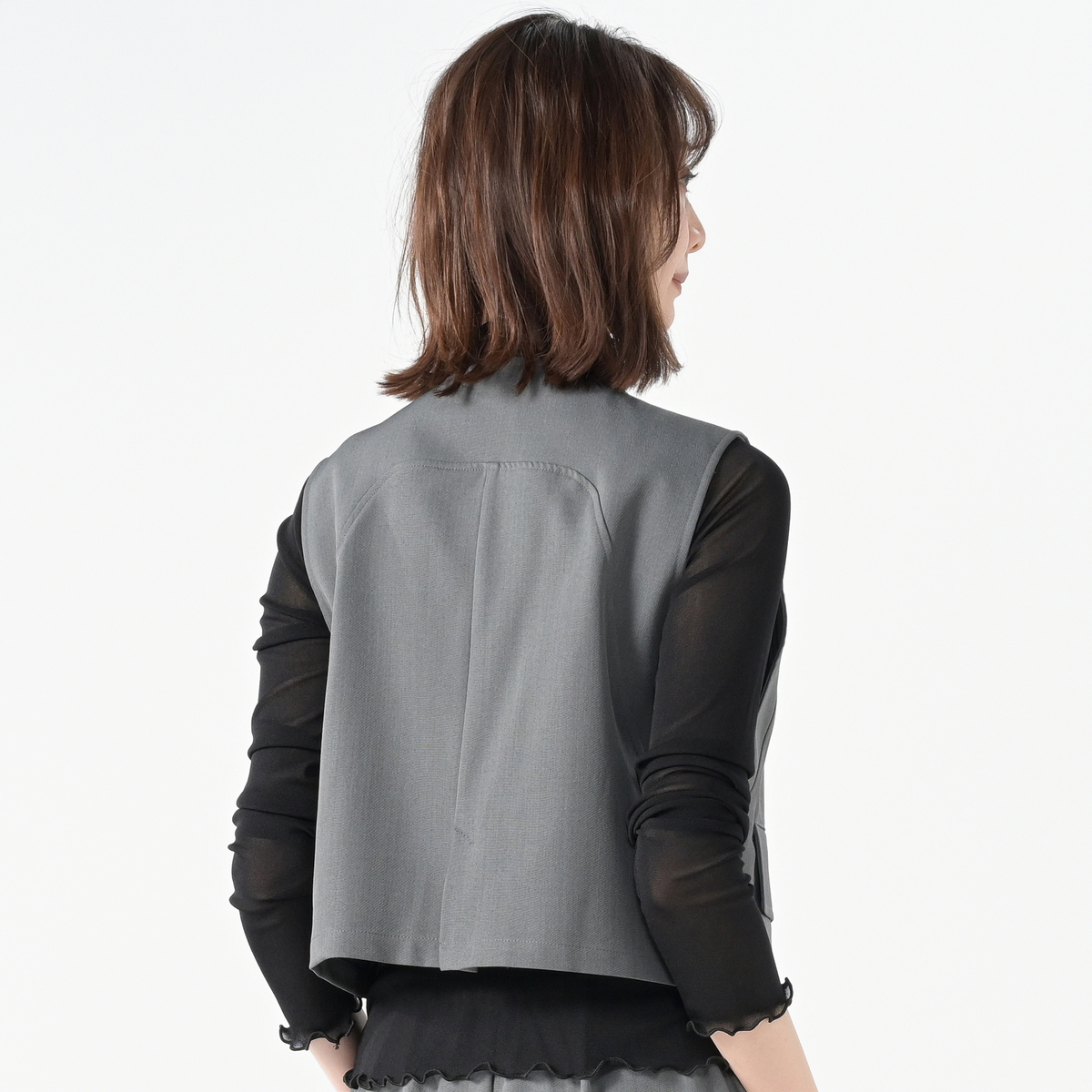 立体的なフォルムが映えるショート丈のジレ。ひとつのボタンがさり気ないアクセントとなり、上品な雰囲気を添えます。ワイドパンツとの組合せはもちろん、ワンピースやTシャツの上に羽織るだけで装いを軽やかに引き締めます。前身頃には便利なポケットもあしらいました
