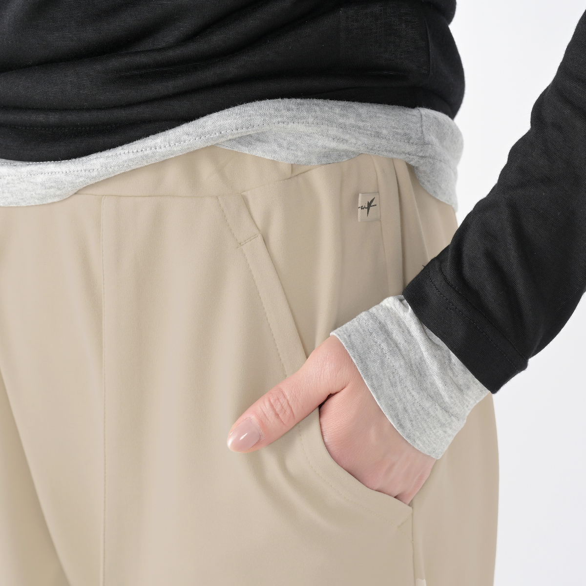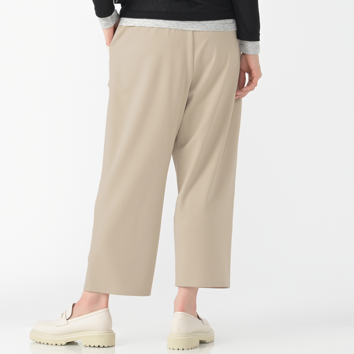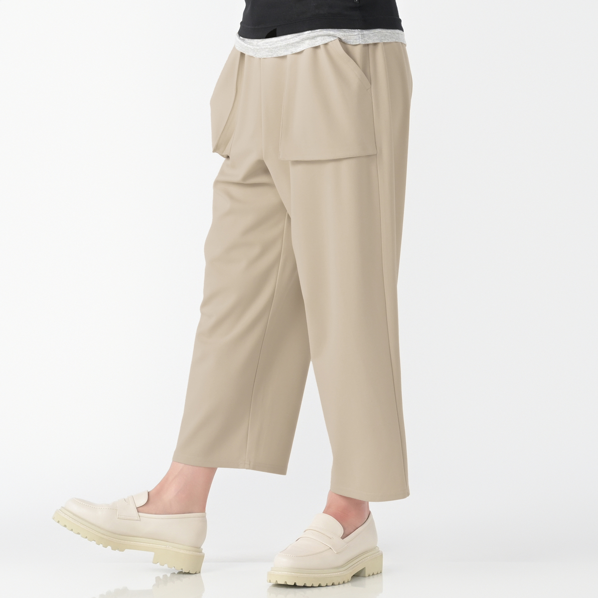 ポンチ素材を使用したワイドシルエットのパンツです。ベーカー風ポケットがアクセントになり、カジュアルさと上品さを両立します