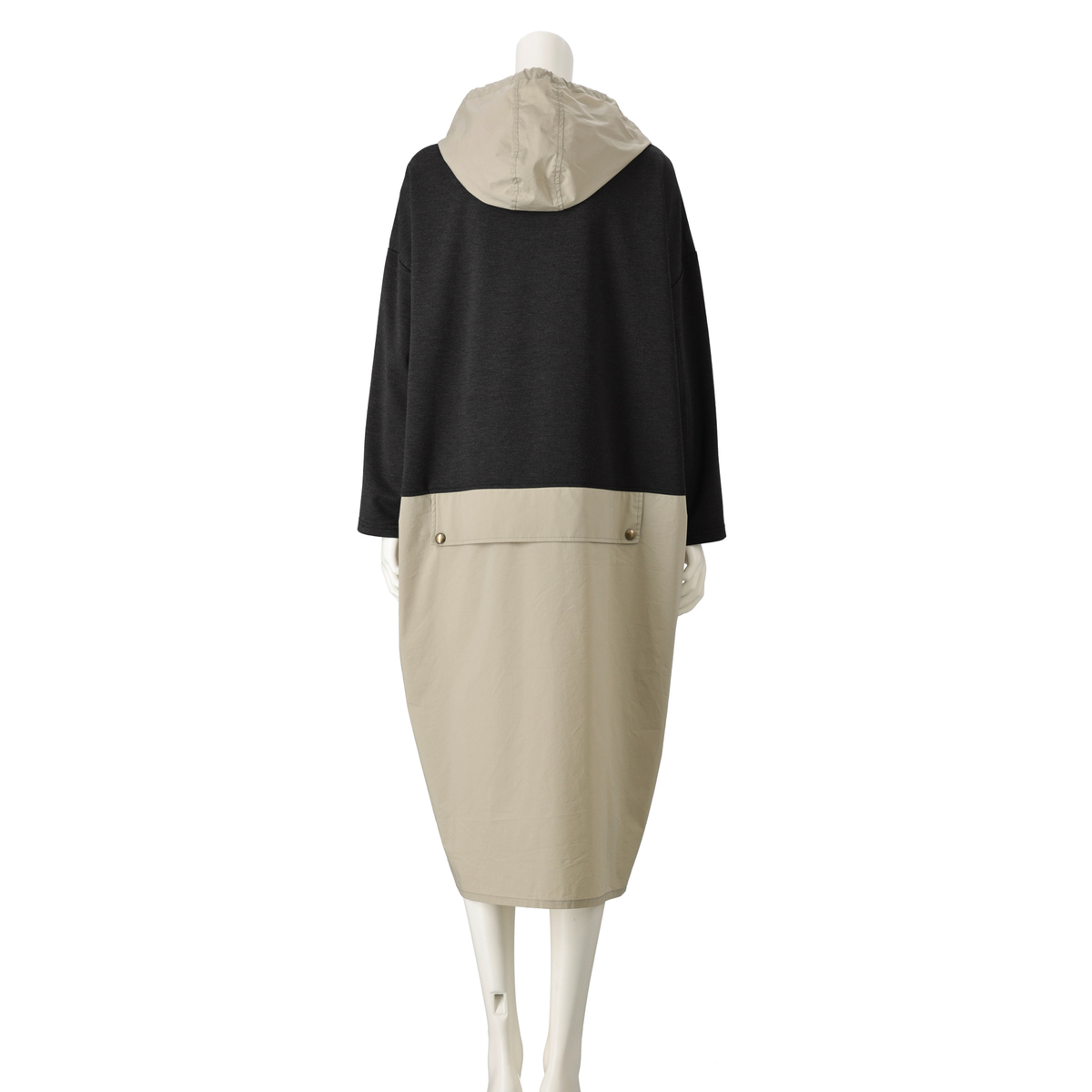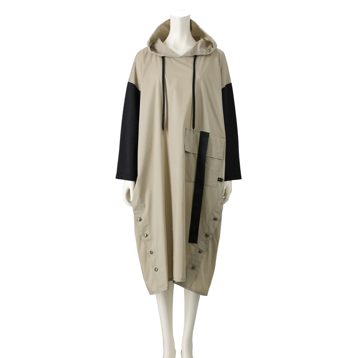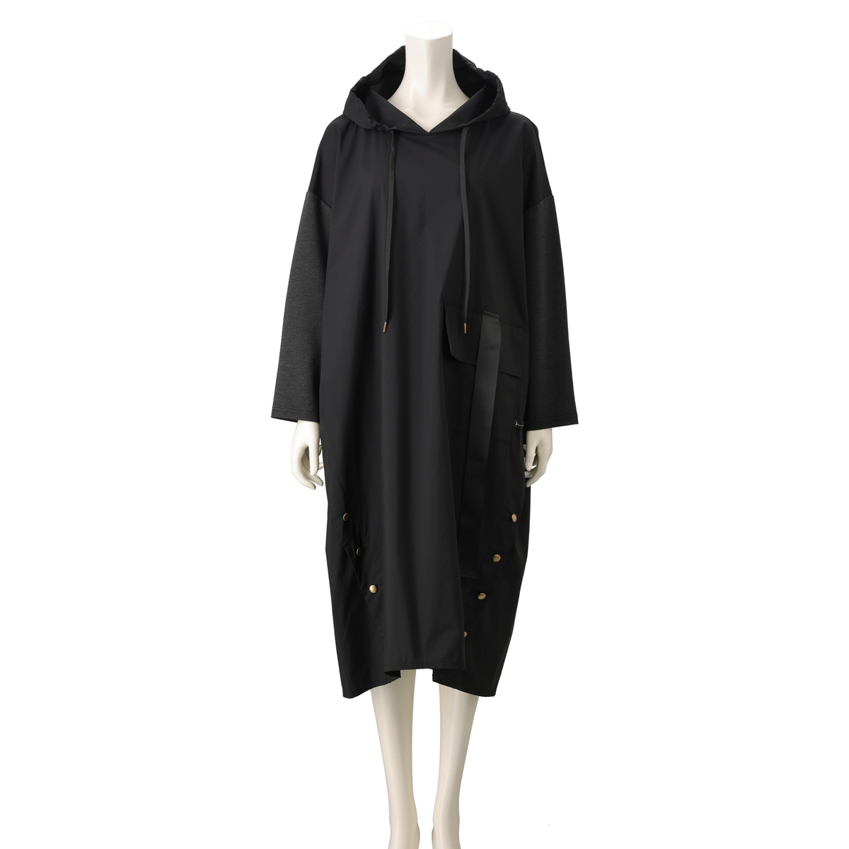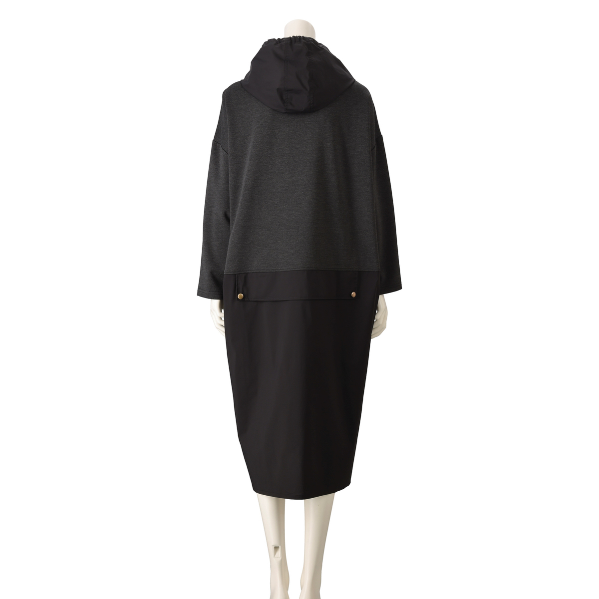 異素材を組合せたフード付きワンピース。分量のあるシルエットでレギンスや細身のパンツとも合わせやすい設計です。左身頃にポケットを配し、実用性とさりげないアクセントを両立。気負わず着られて、組合せ次第で表情が広がります