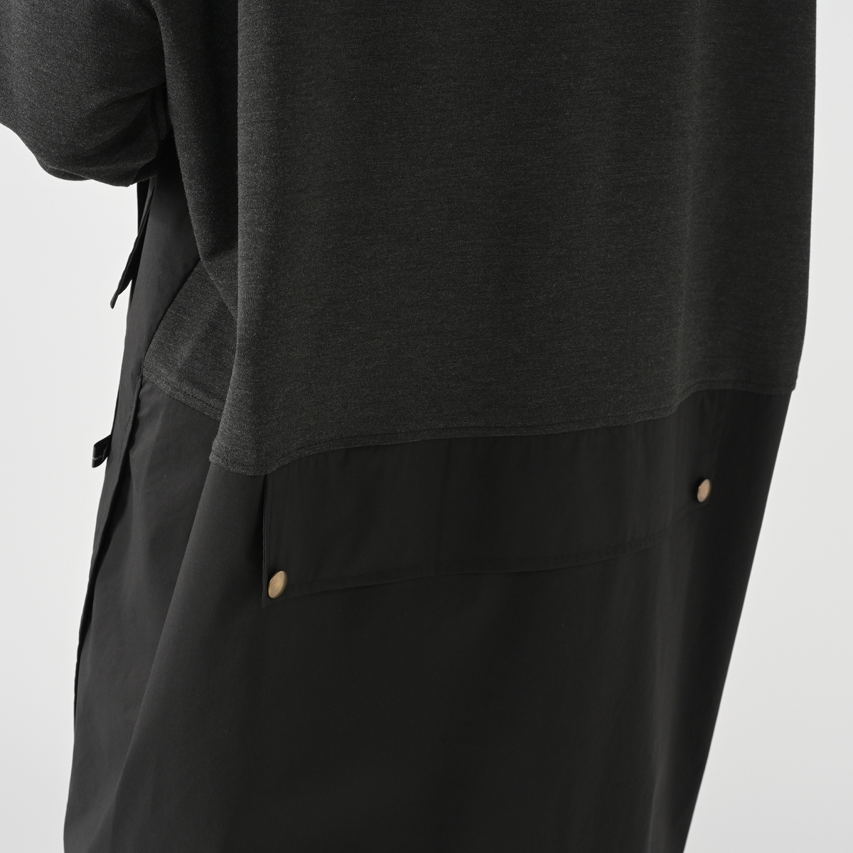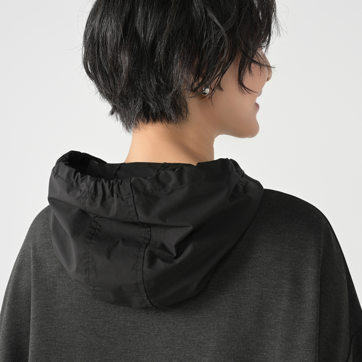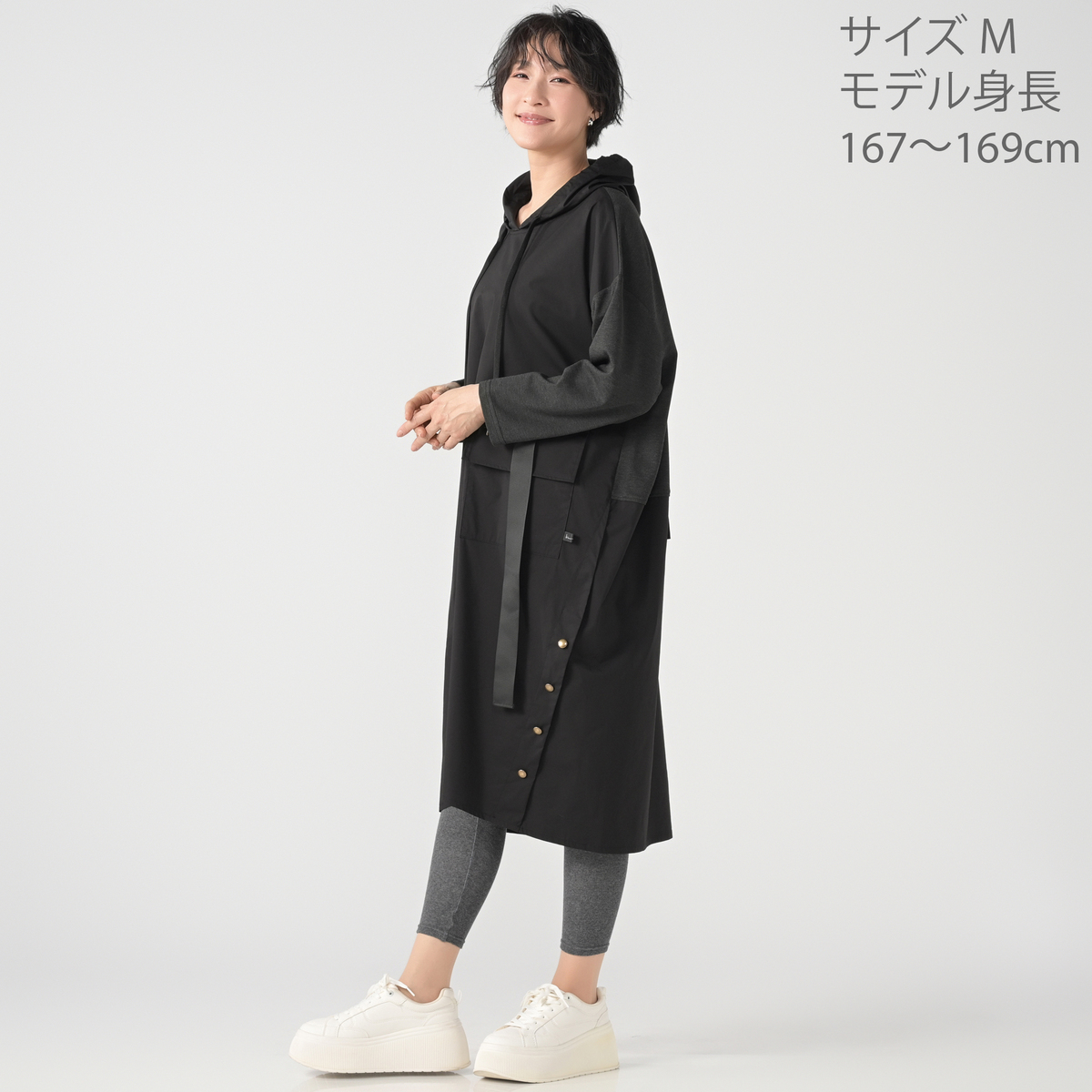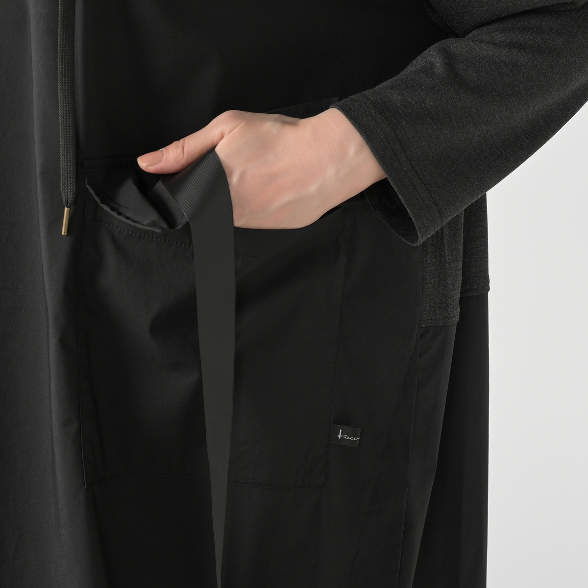 異素材を組合せたフード付きワンピース。分量のあるシルエットでレギンスや細身のパンツとも合わせやすい設計です。左身頃にポケットを配し、実用性とさりげないアクセントを両立。気負わず着られて、組合せ次第で表情が広がります