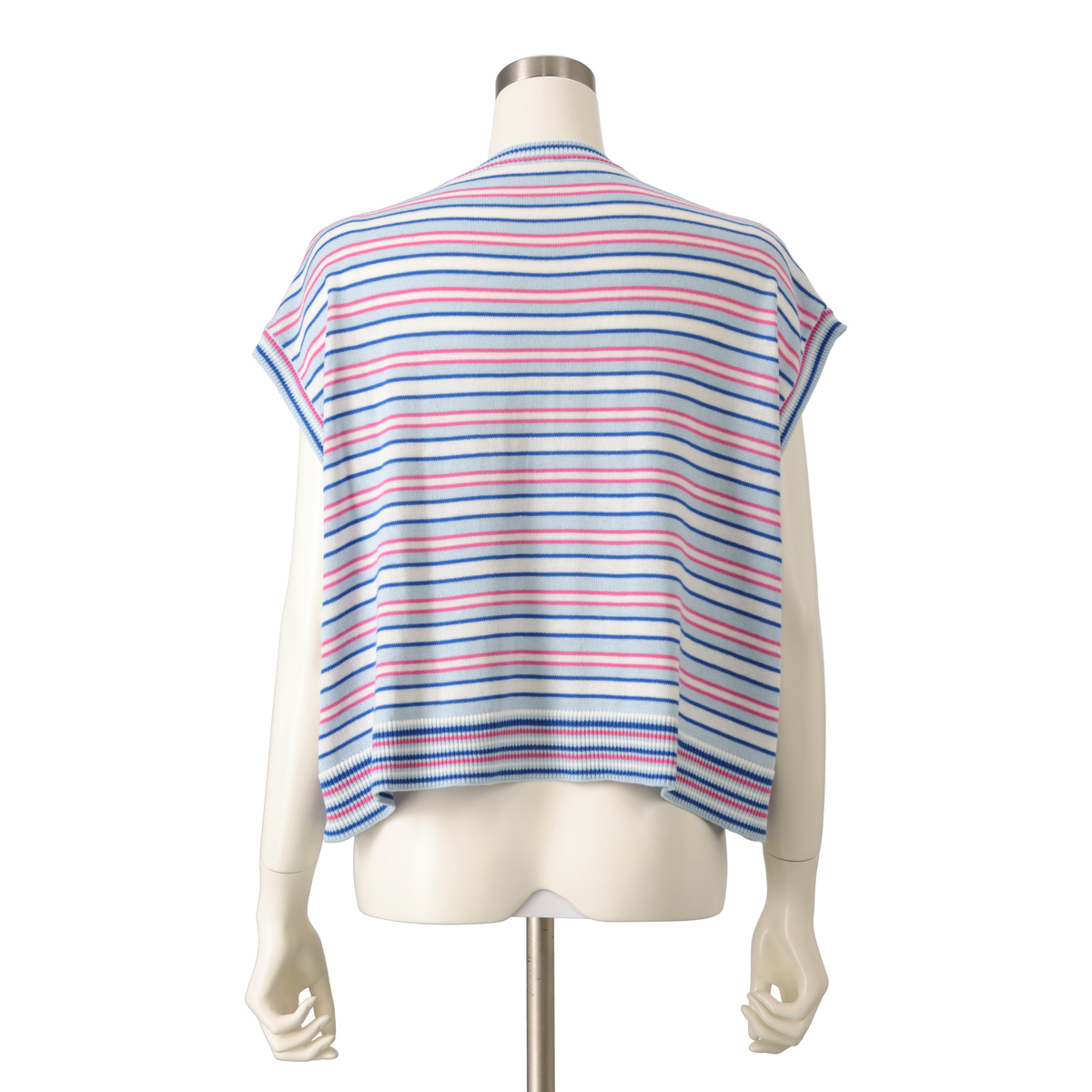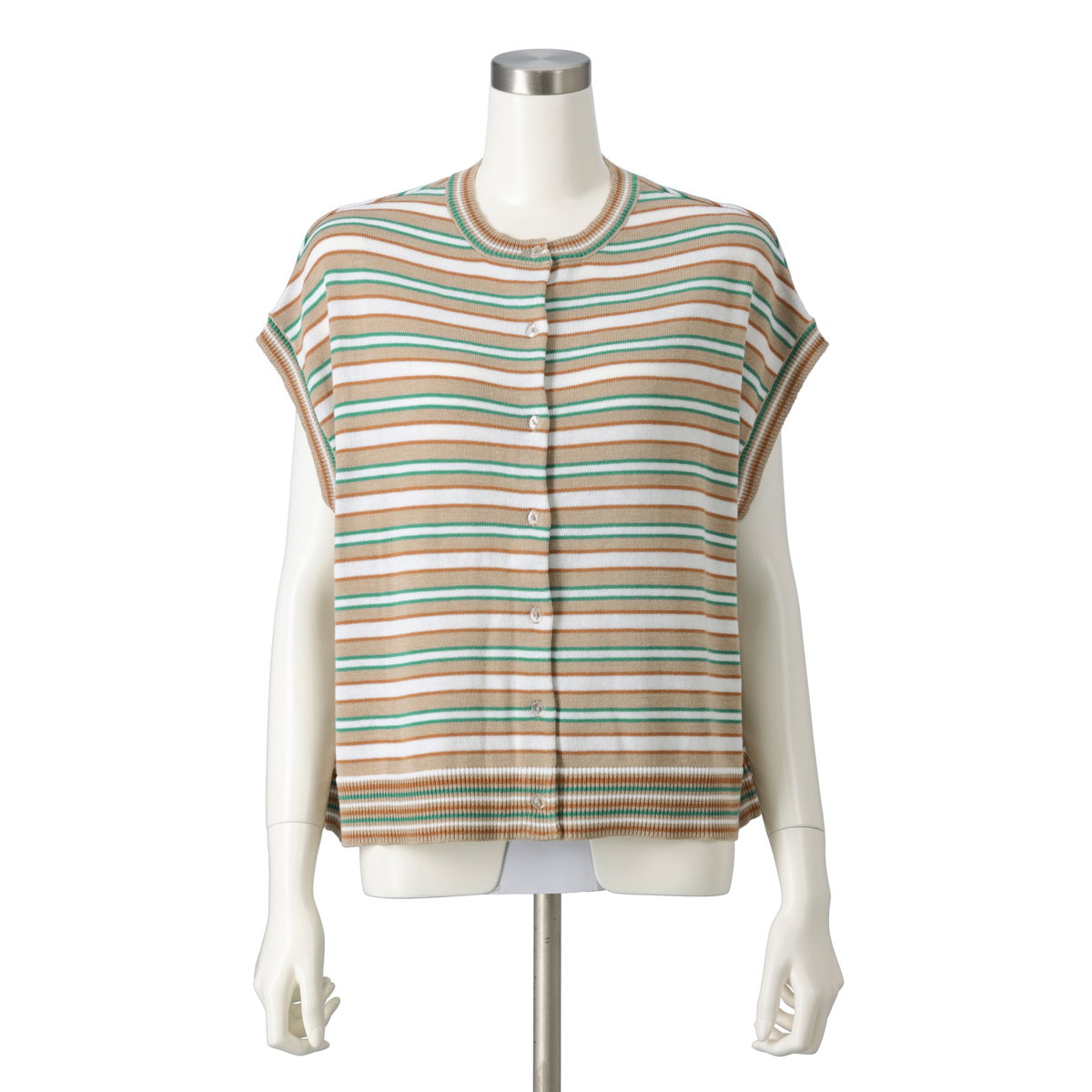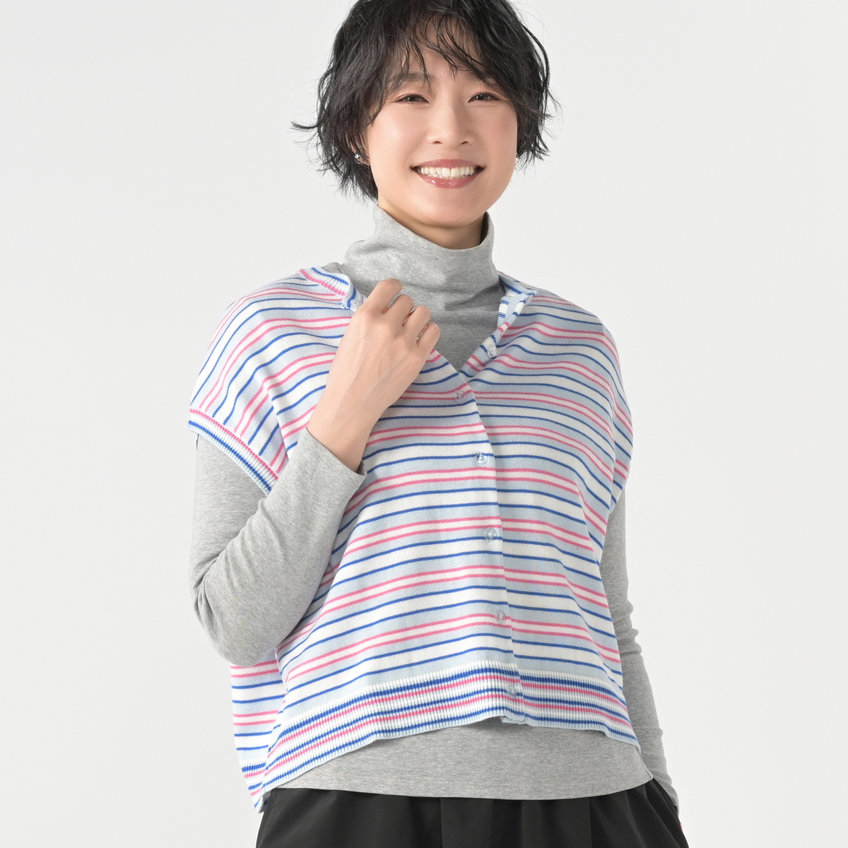 4色のボーダー柄が目を惹くニットベスト。程良い薄さと軽さでレイヤードしやすく、コーデに季節感とメリハリをプラスできます
