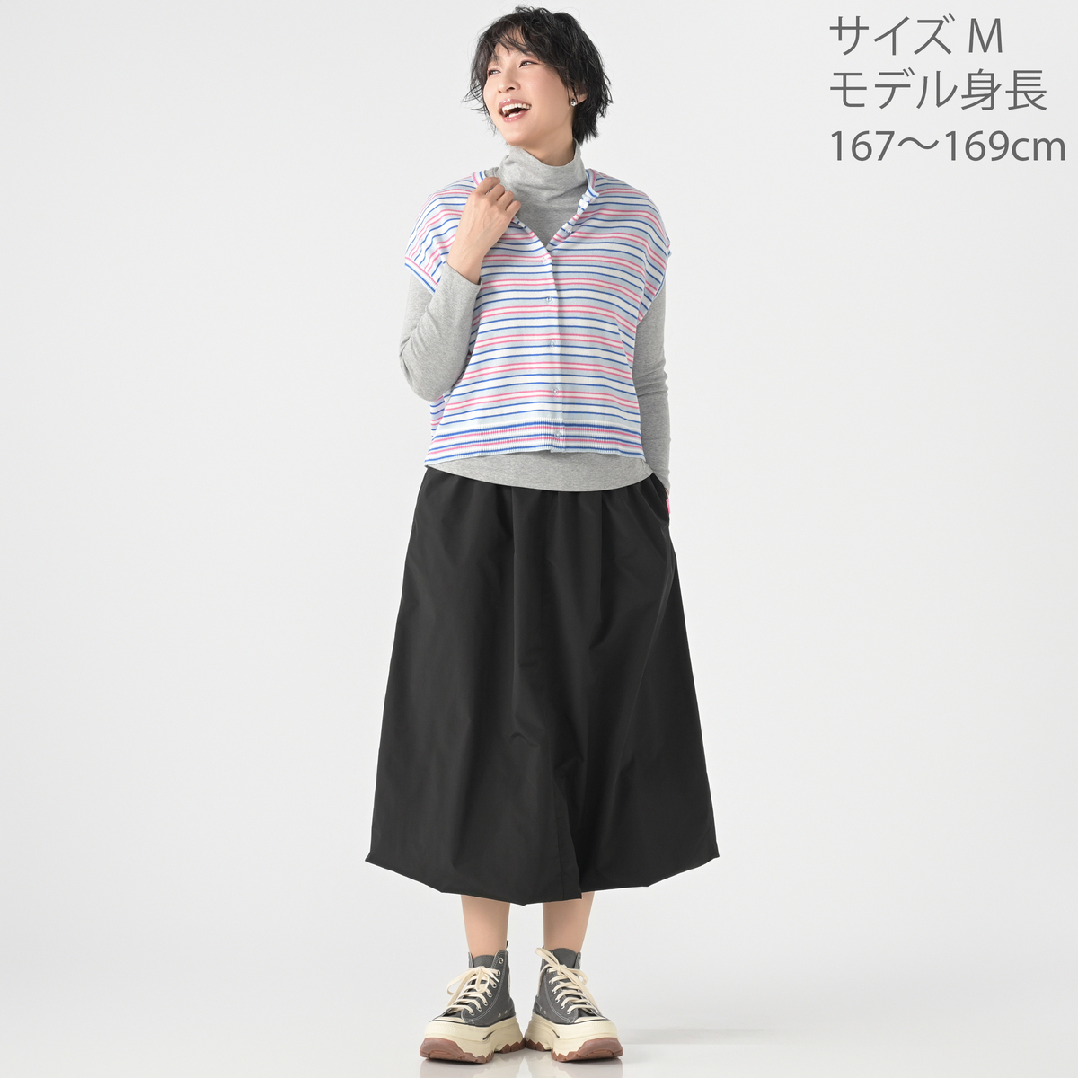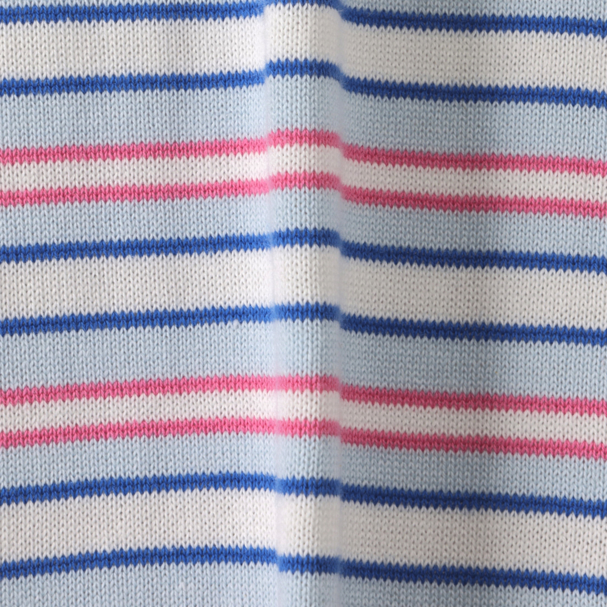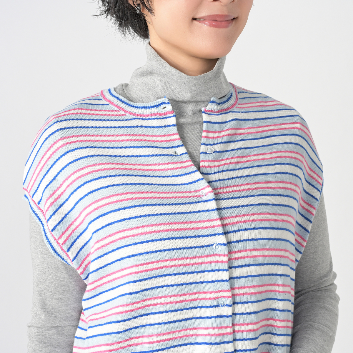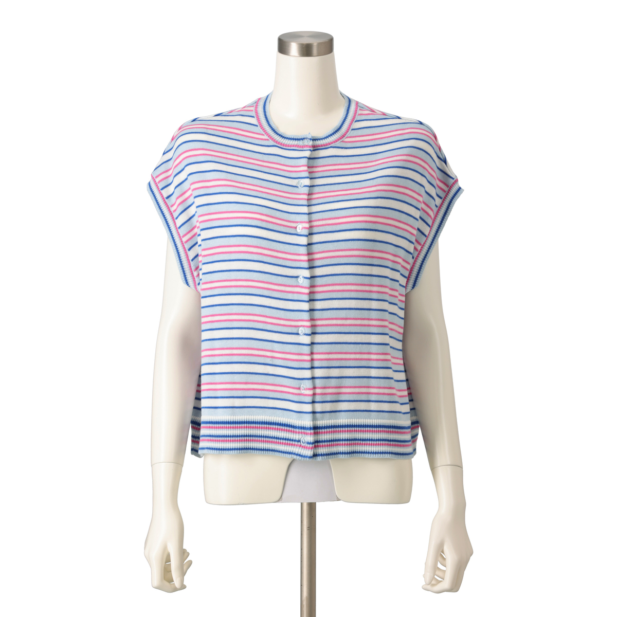 4色のボーダー柄が目を惹くニットベスト。程良い薄さと軽さでレイヤードしやすく、コーデに季節感とメリハリをプラスできます