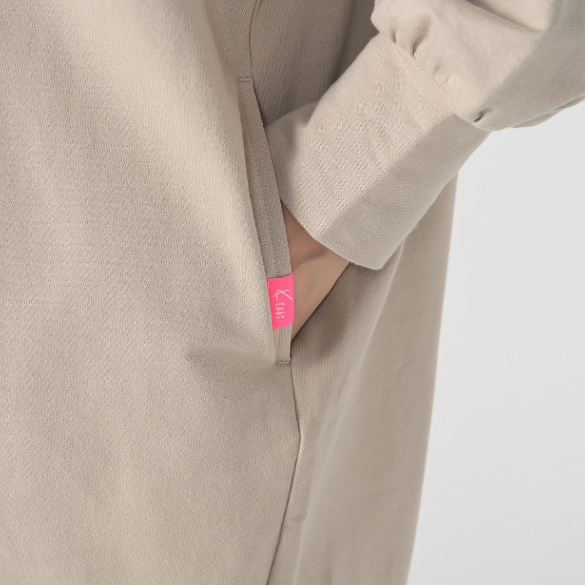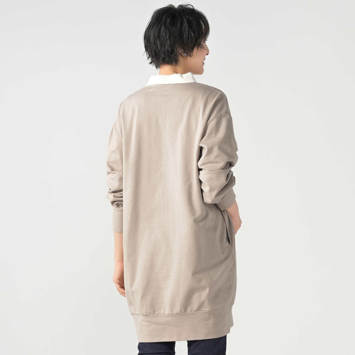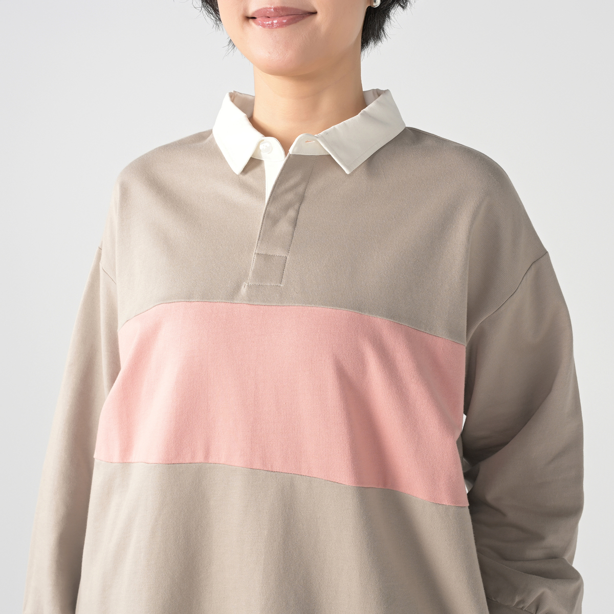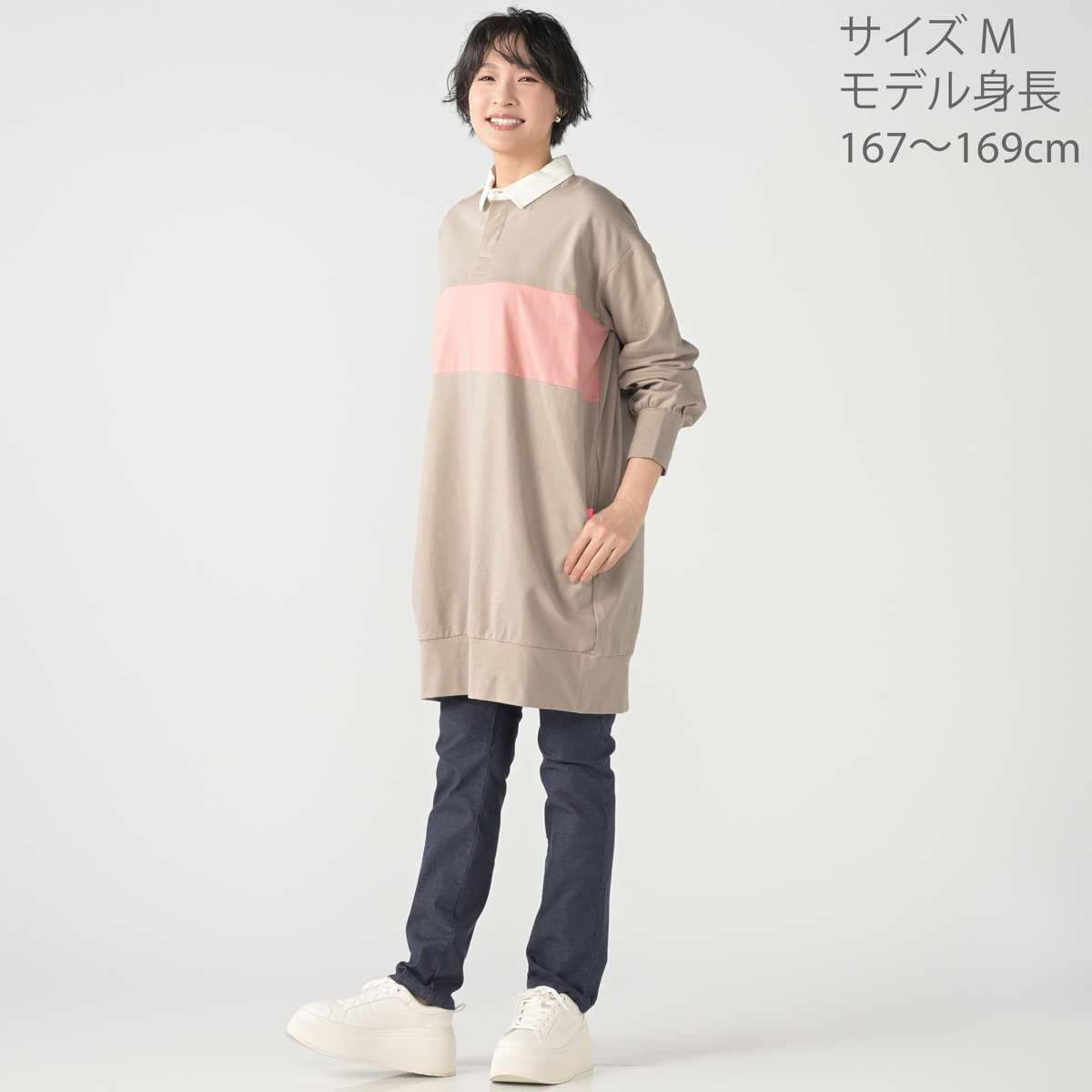 スポーティなラガーシャツデザインを、ワンピースに落とし込んでデザイン。衿にはきれい見えする布帛素材を使用。身頃は柔らかく軽いミニ裏毛で仕立てています