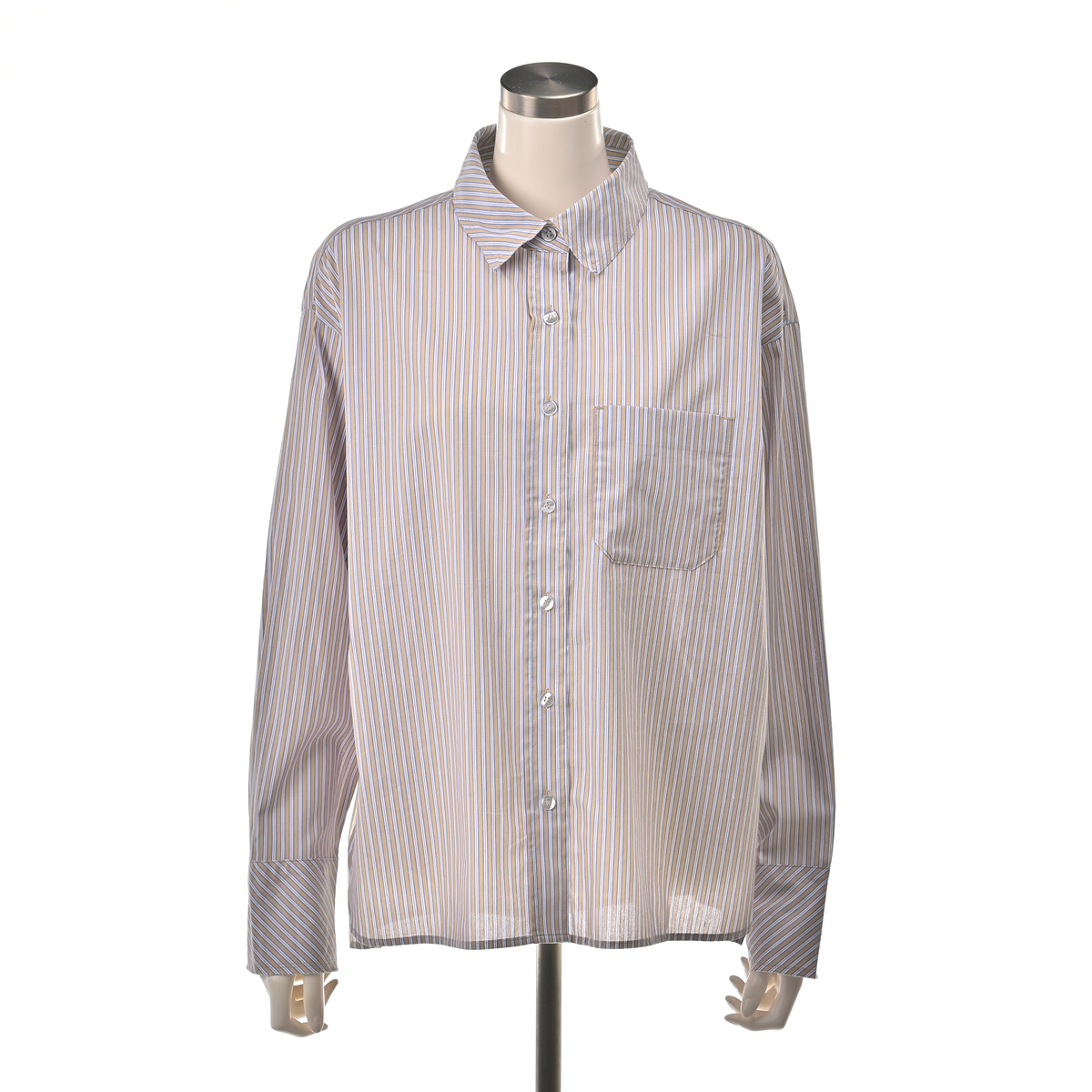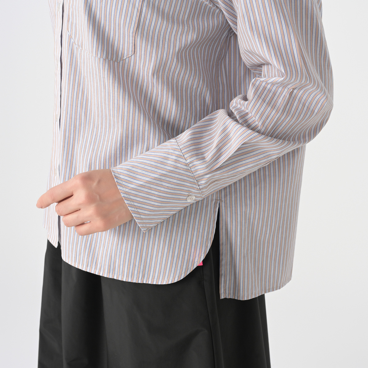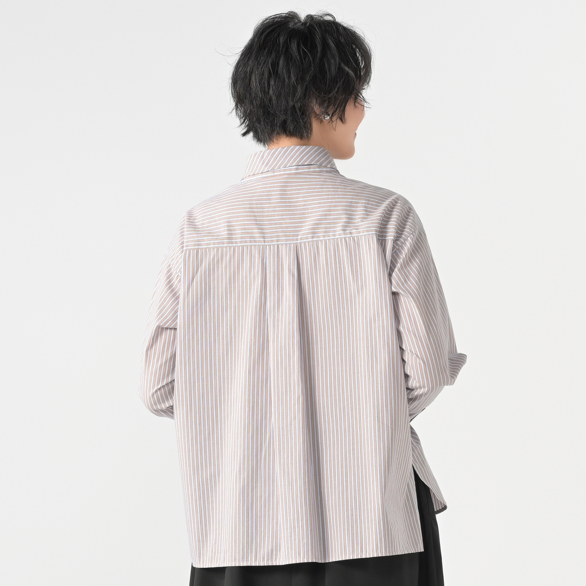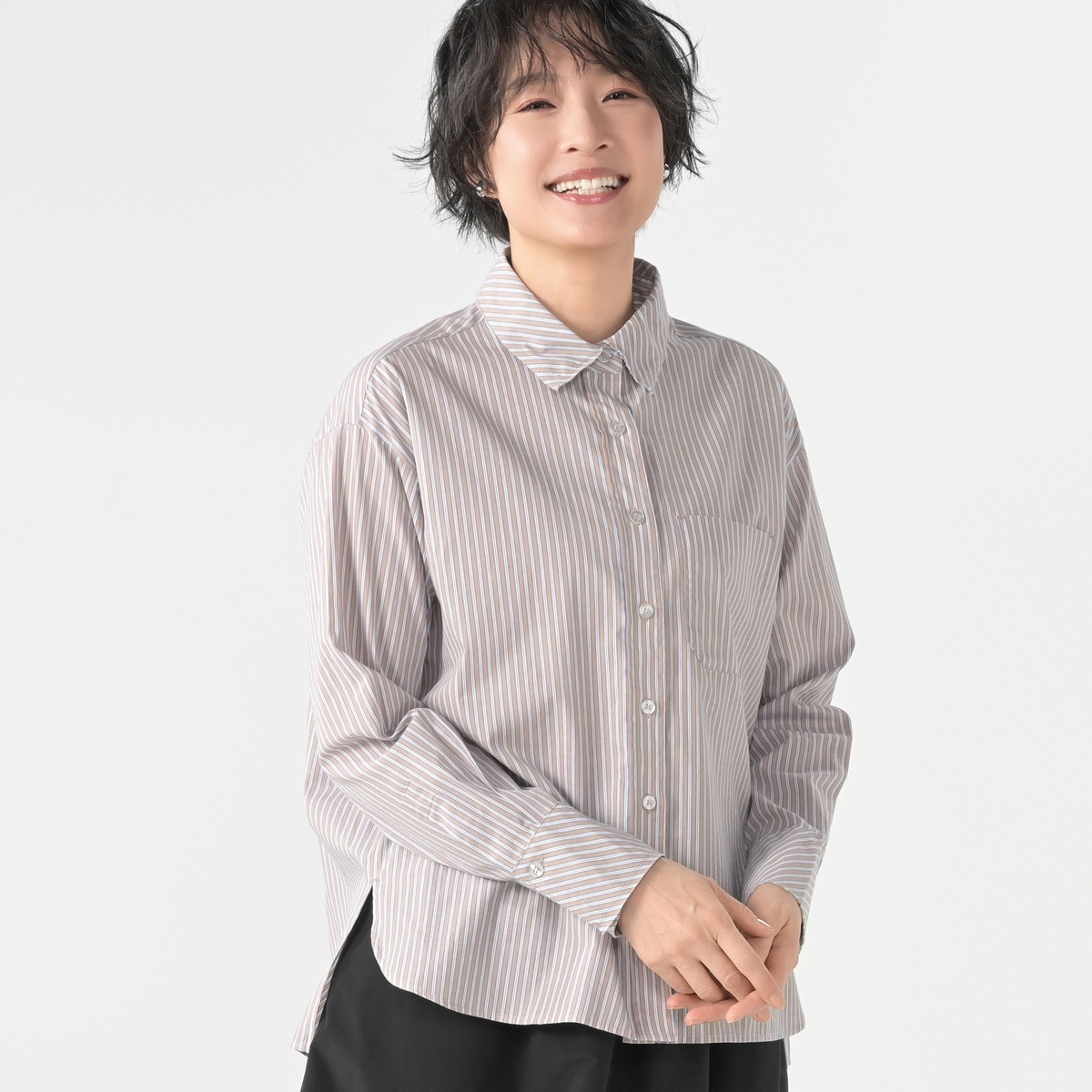 軽やかさをまとうストライプシャツ。綿100%の素材が心地よく、少しオーバーサイズのシルエットでボディラインを拾いにくい仕上がりです。前裾は柔らかなラウンド、後ろ裾はシャープなラインで、前後の違いが着こなしに変化を添えます。一枚で決まり、ベストとのレイヤードにも好相性なデザインです