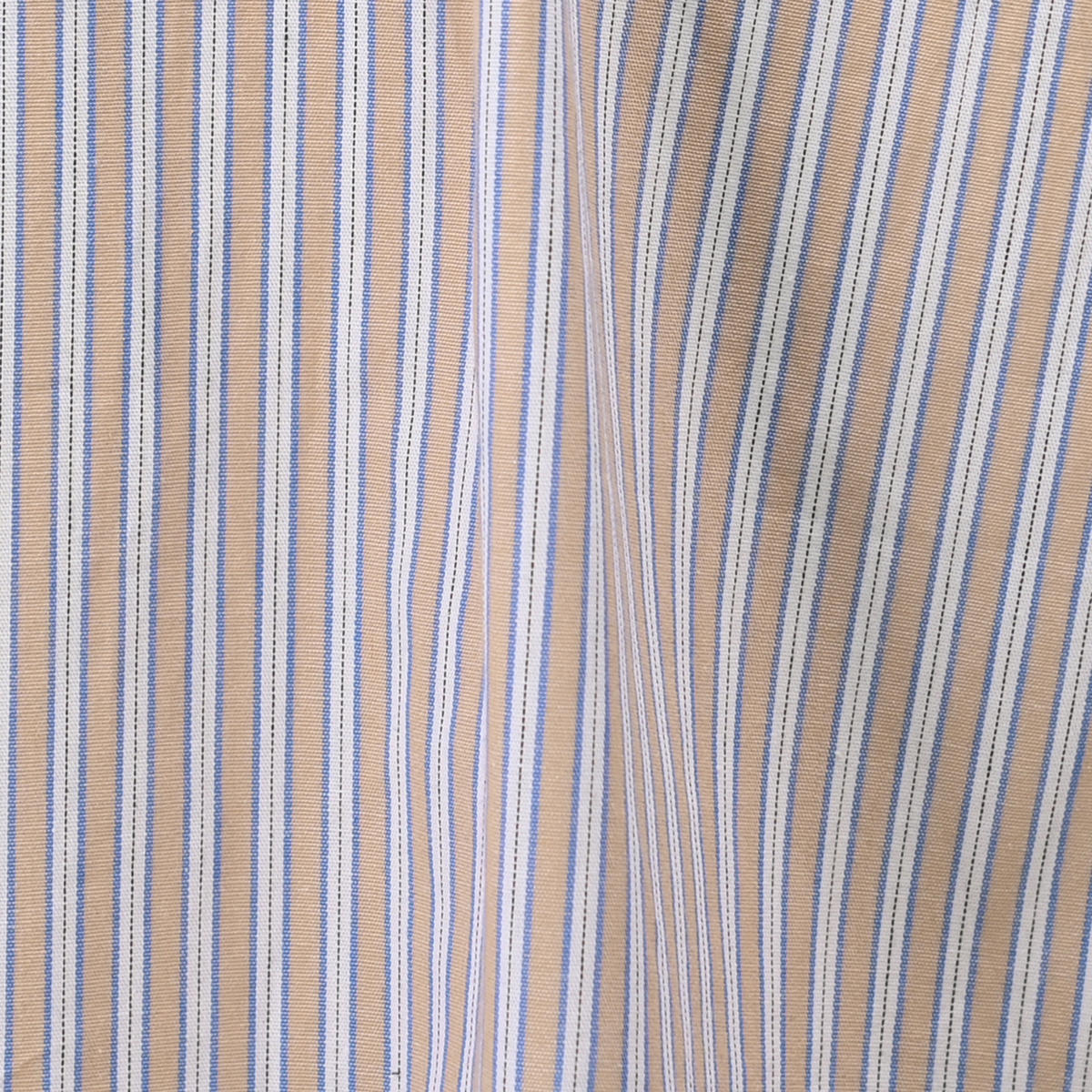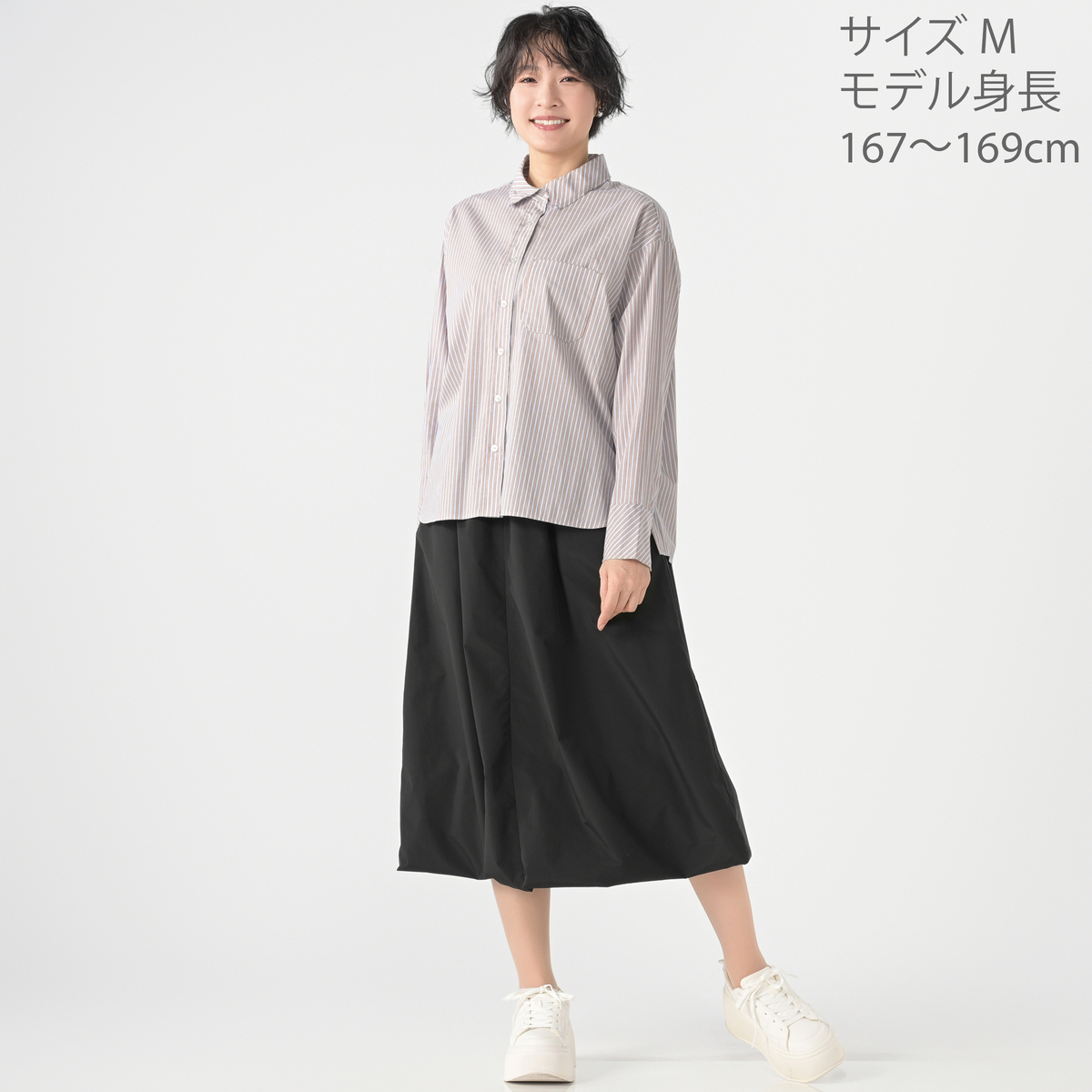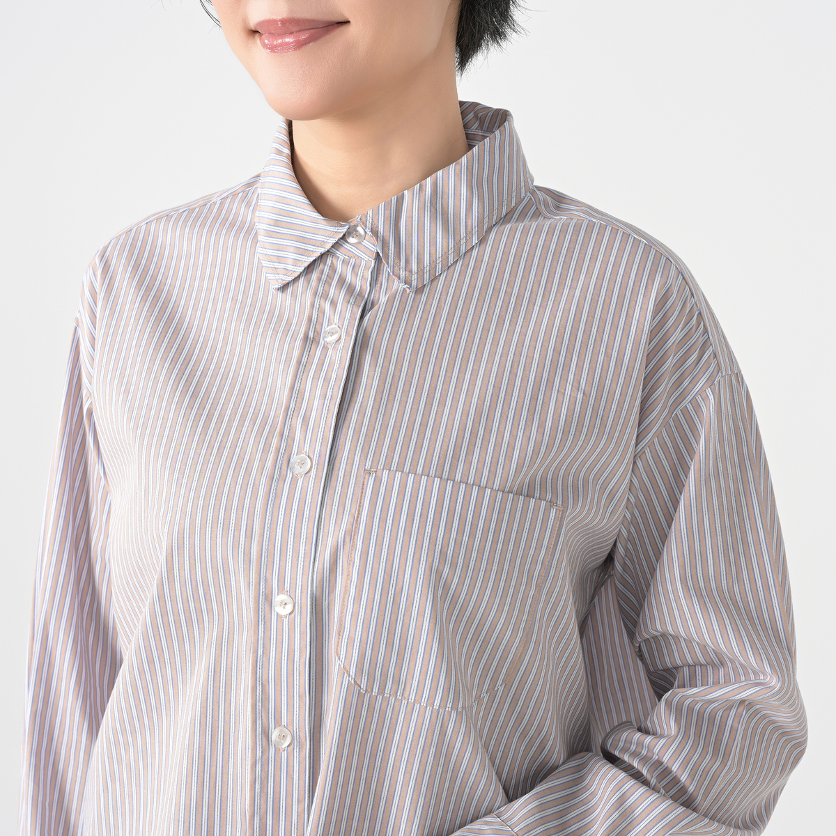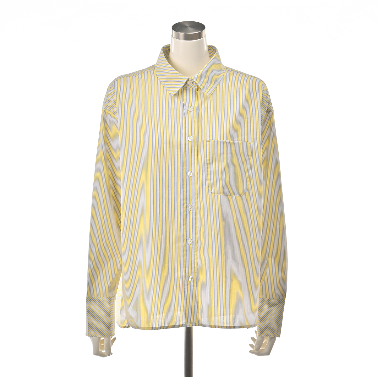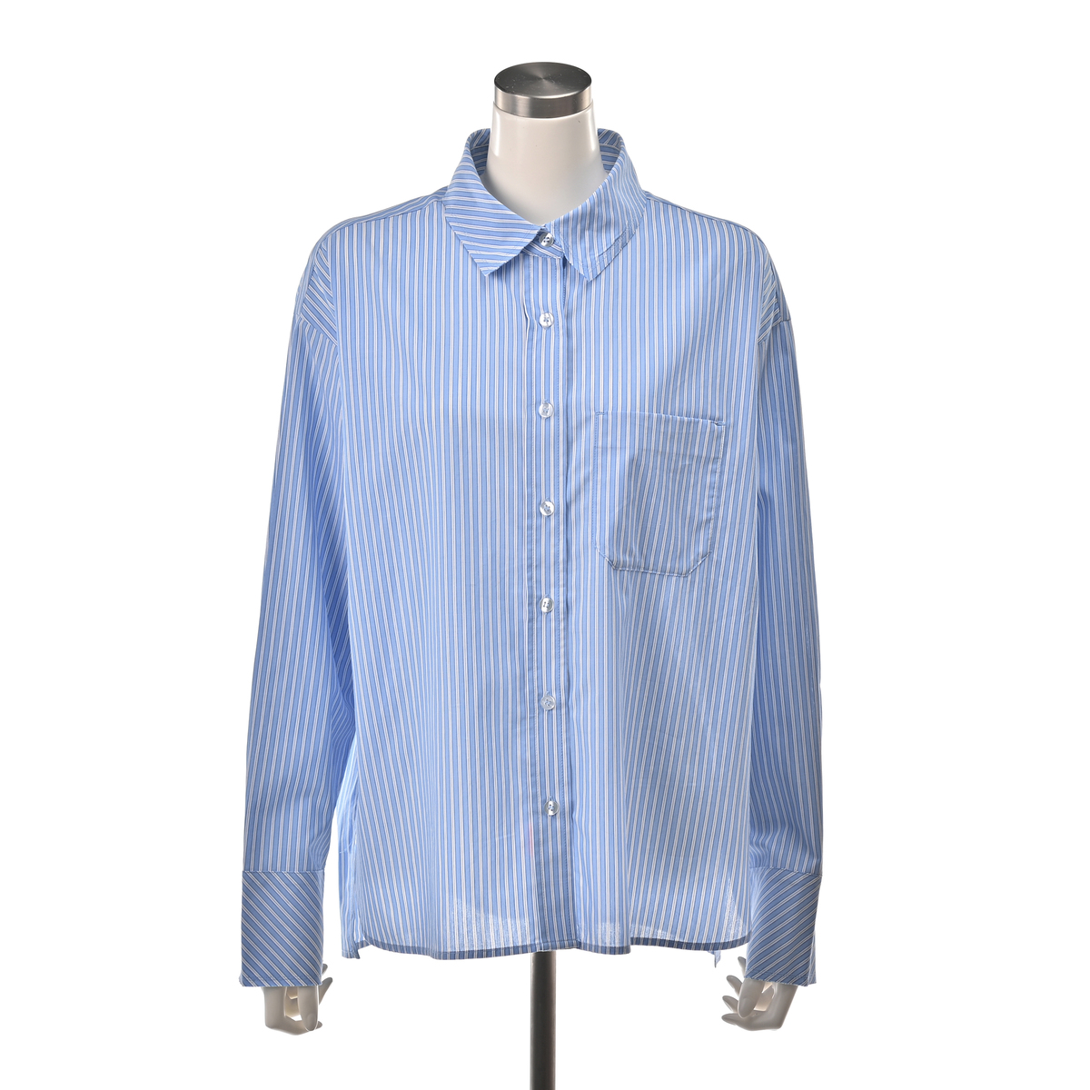 軽やかさをまとうストライプシャツ。綿100%の素材が心地よく、少しオーバーサイズのシルエットでボディラインを拾いにくい仕上がりです。前裾は柔らかなラウンド、後ろ裾はシャープなラインで、前後の違いが着こなしに変化を添えます。一枚で決まり、ベストとのレイヤードにも好相性なデザインです