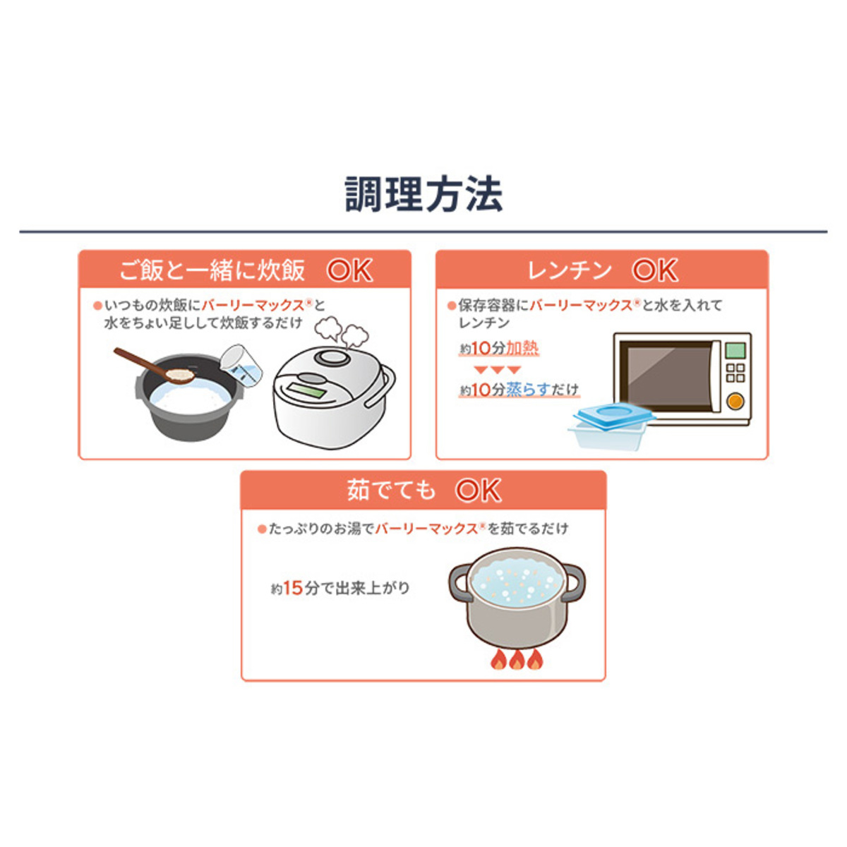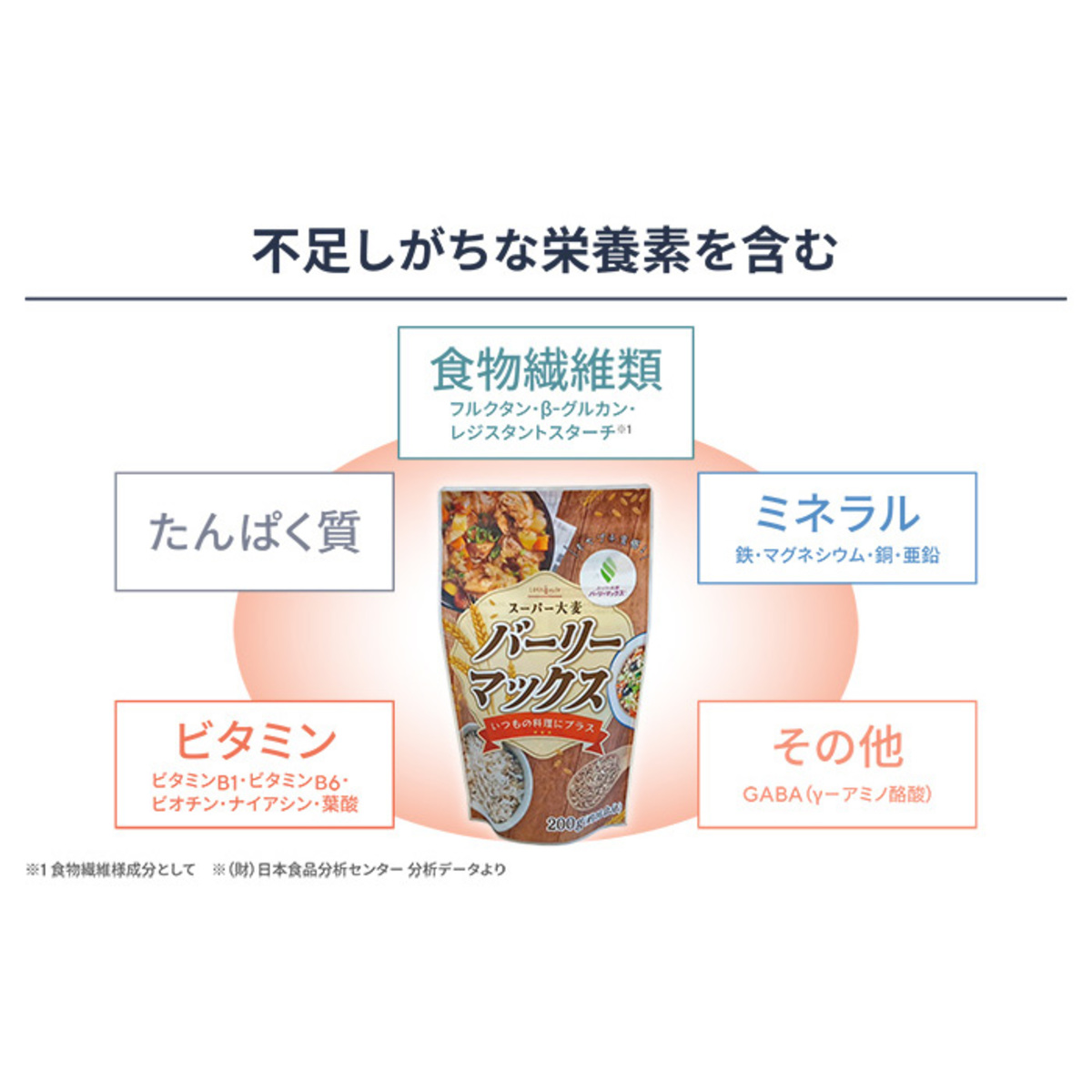 [アレルギー物質特定原材料8品目] なし [保存方法] 直射日光や高温多湿を避けて保存 [栄養成分表示]100gあたり エネルギー 341kcal たんぱく質 14.5g 脂質 7.4g 炭水化物 65.1g 食塩相当量 0.015g [お召し上がり方] 調理方法(100gの場合) [ご飯と炊く] 1.研いだお米1合に通常通りの水の量を入れる 2.本品大さじ1杯(約12g)と水20〜30ccを加える 3.いつも通り炊飯する [茹でる] 1.沸騰したたっぷりのお湯に、本品を入れ、15分茹でる 2.お好みの硬さになったらザルにあげて、粗熱をとる [電子レンジ(100gの場合)] 1.レンジ対応可能な保存容器(700ml程度)等に水250ccと本品を入れ、蓋を軽くのせ(ぴったり閉めず)、500Wで10分加熱する 2.軽く蓋をのせたまま10分蒸らす [注意事項] ※湿気や害虫などをさけるため、密封して保管し、お早めにお召し上がりください ※大麦の原料原産地の貯蔵、輸送設備などは小麦にも使用しています ※本品製造工場では小麦・乳成分・大豆・ゼラチンを含む製品を製造しています <調理したスーパー大麦の保存方法> ※冷凍・冷蔵保存が可能です。お好みの方法でお試しください <例> フリーザーバッグ等に薄く広げていれる 保存容器に入れる ※冷凍では1か月、冷蔵約2日程度を目安にお召し上がりください [原料原産地] 大麦(オーストラリア) [原産国] 日本 [内容量] 200g×6袋 [原材料]大麦 原料原産地:オーストラリア