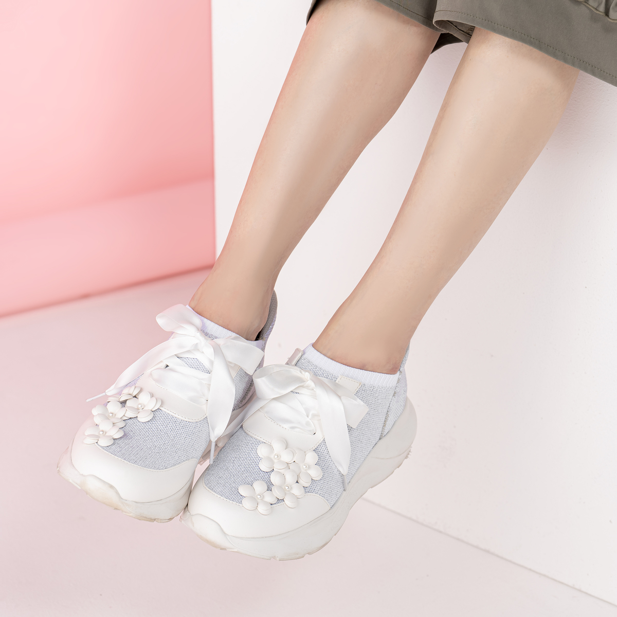 &LOVEらしい立体的なフラワーモチーフに、さりげないパール調ディティールをあしらってデザイン。甘くなりすぎない配色と素材感にこだわり、上品で洗練された印象に。スニーカーでありながらアクセサリーのような華やかさを足元に演出します