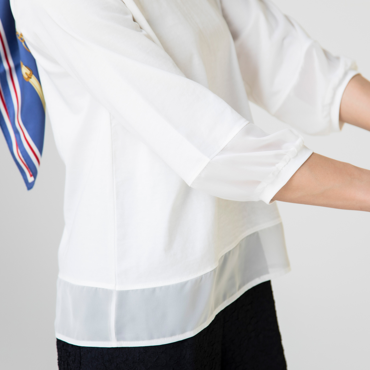 裾と袖をシアー素材で切替えたプルオーバー。1枚でも着映えするきれいめアイテムです