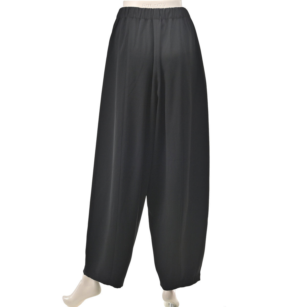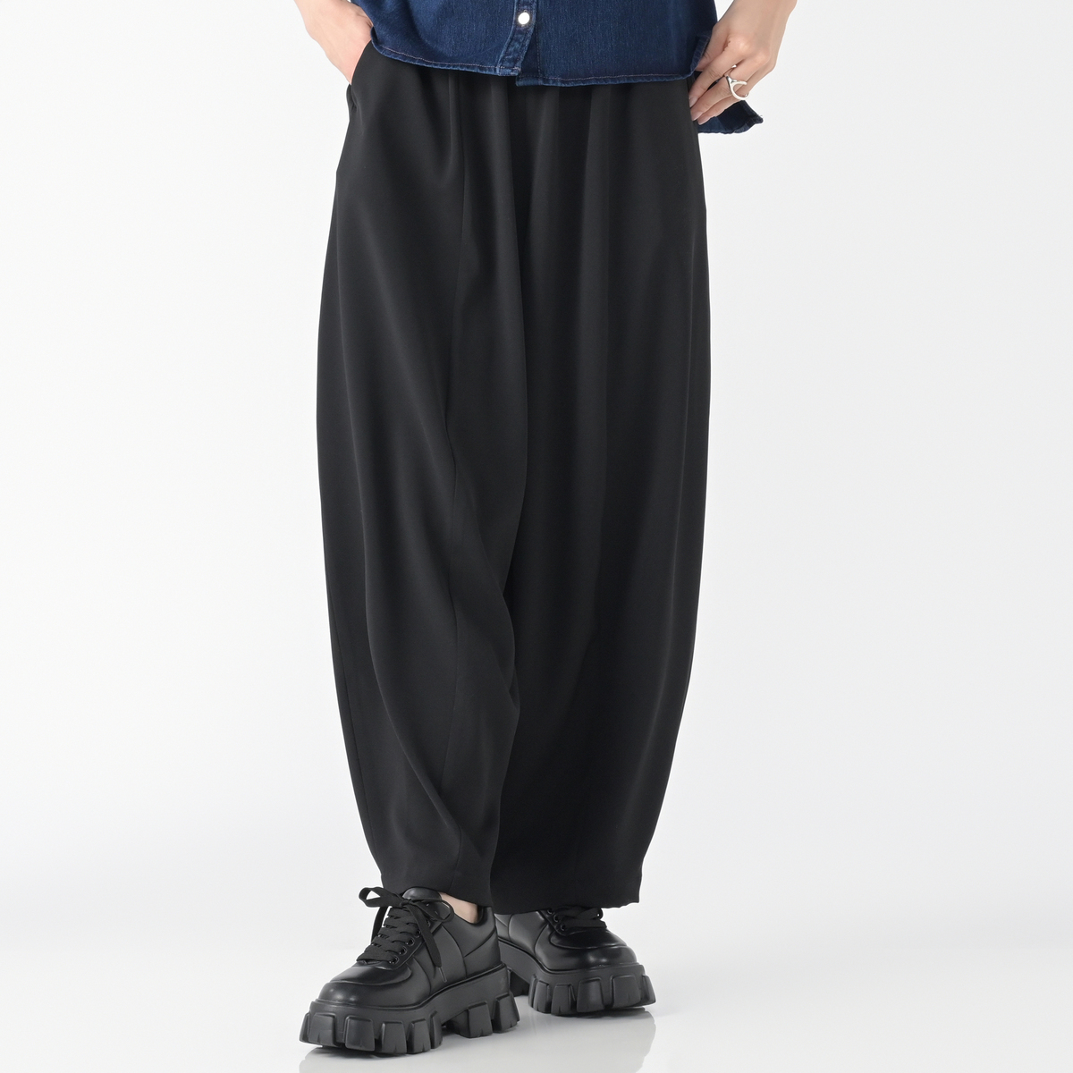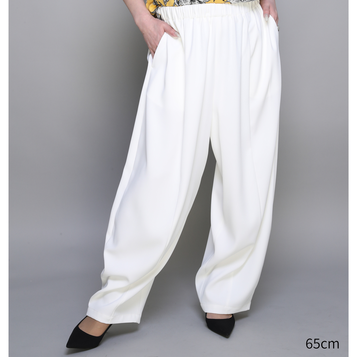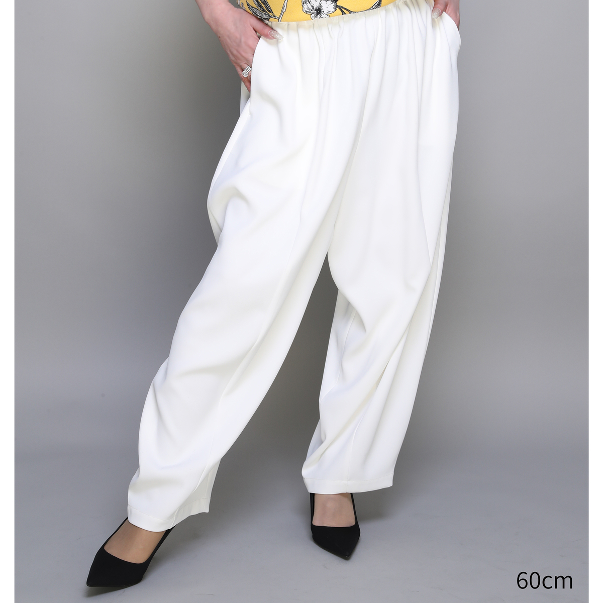 カーヴィーラインが新鮮なバレルパンツ。ツイル素材で、たっぷり入れたギャザーがウエストまわりを軽やかに見せ、総ゴム仕様で穿き心地も快適。前両脇にポケット付きで、股下は選べる2レングス展開です
