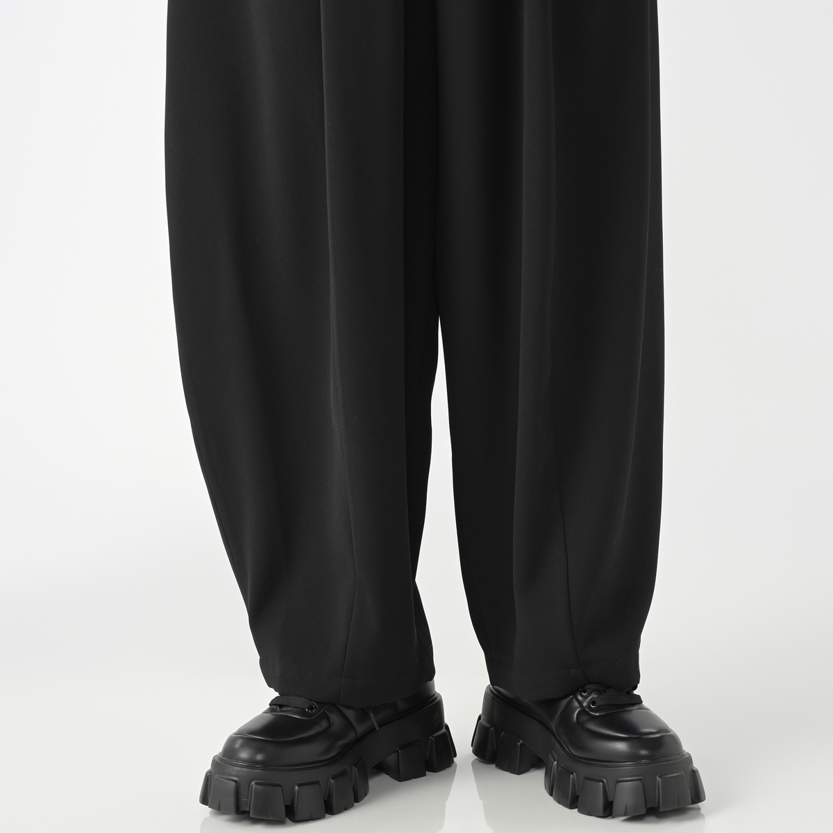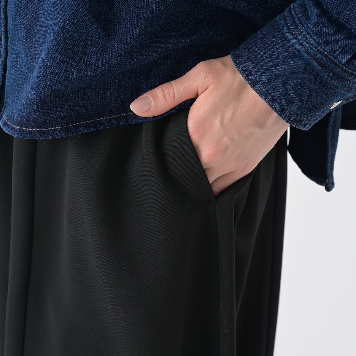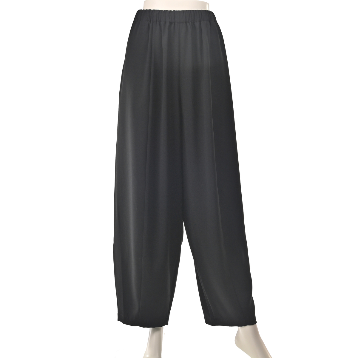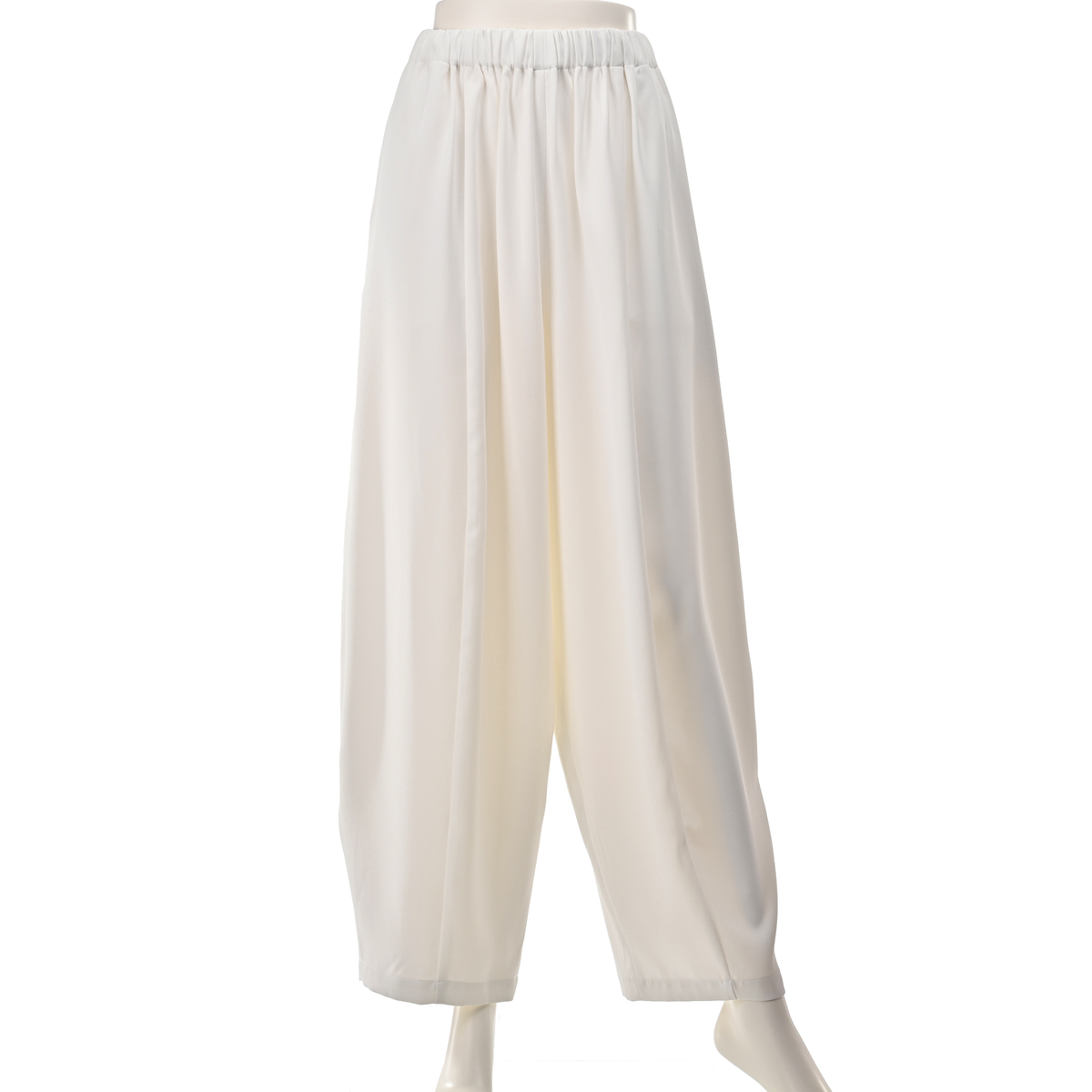 カーヴィーラインが新鮮なバレルパンツ。ツイル素材で、たっぷり入れたギャザーがウエストまわりを軽やかに見せ、総ゴム仕様で穿き心地も快適。前両脇にポケット付きで、股下は選べる2レングス展開です