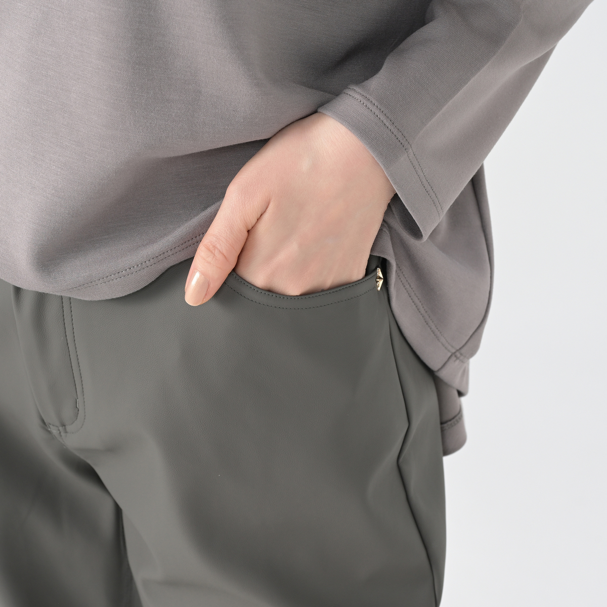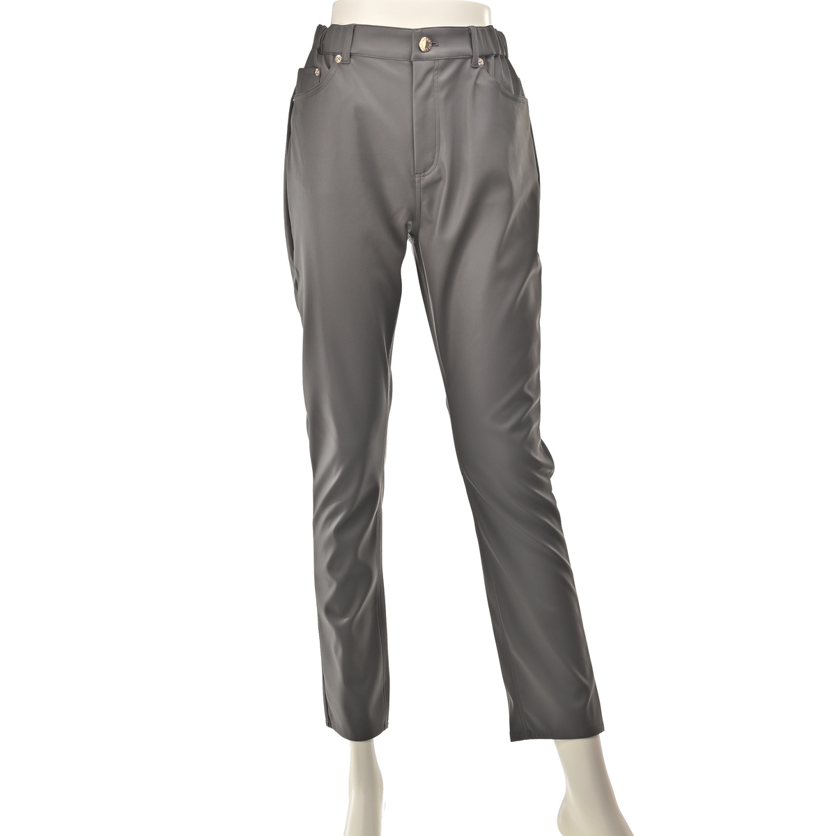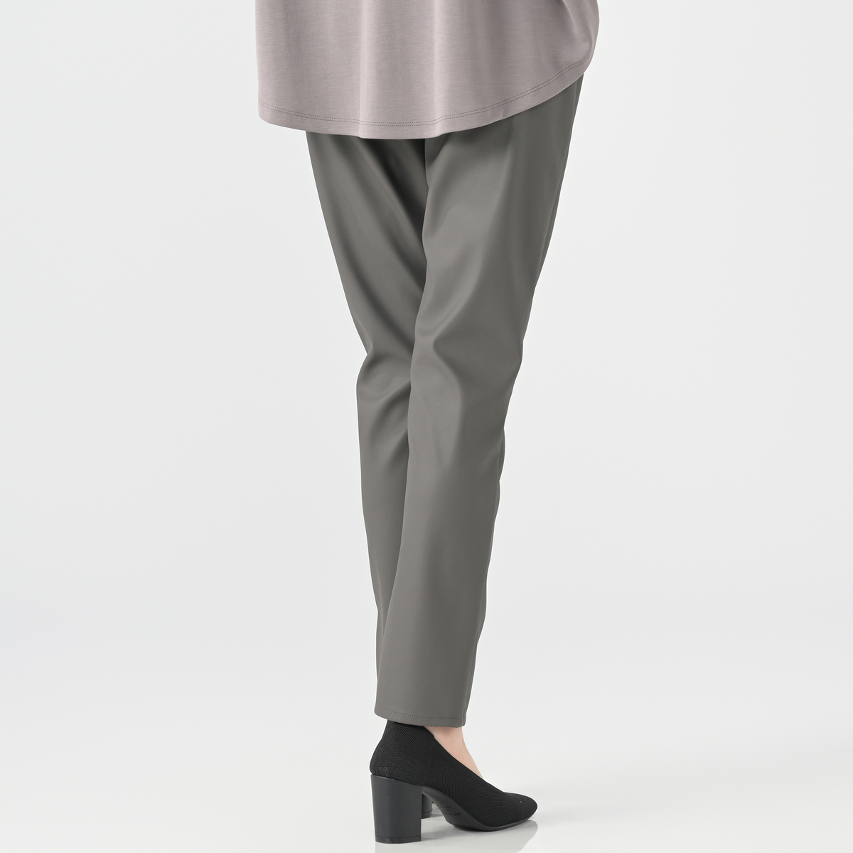柔らかく伸びの良いフェイクレザー素材を使用したパンツ。脚のラインを拾いにくいスリムシルエットで、幅広いスタイリングに活躍します