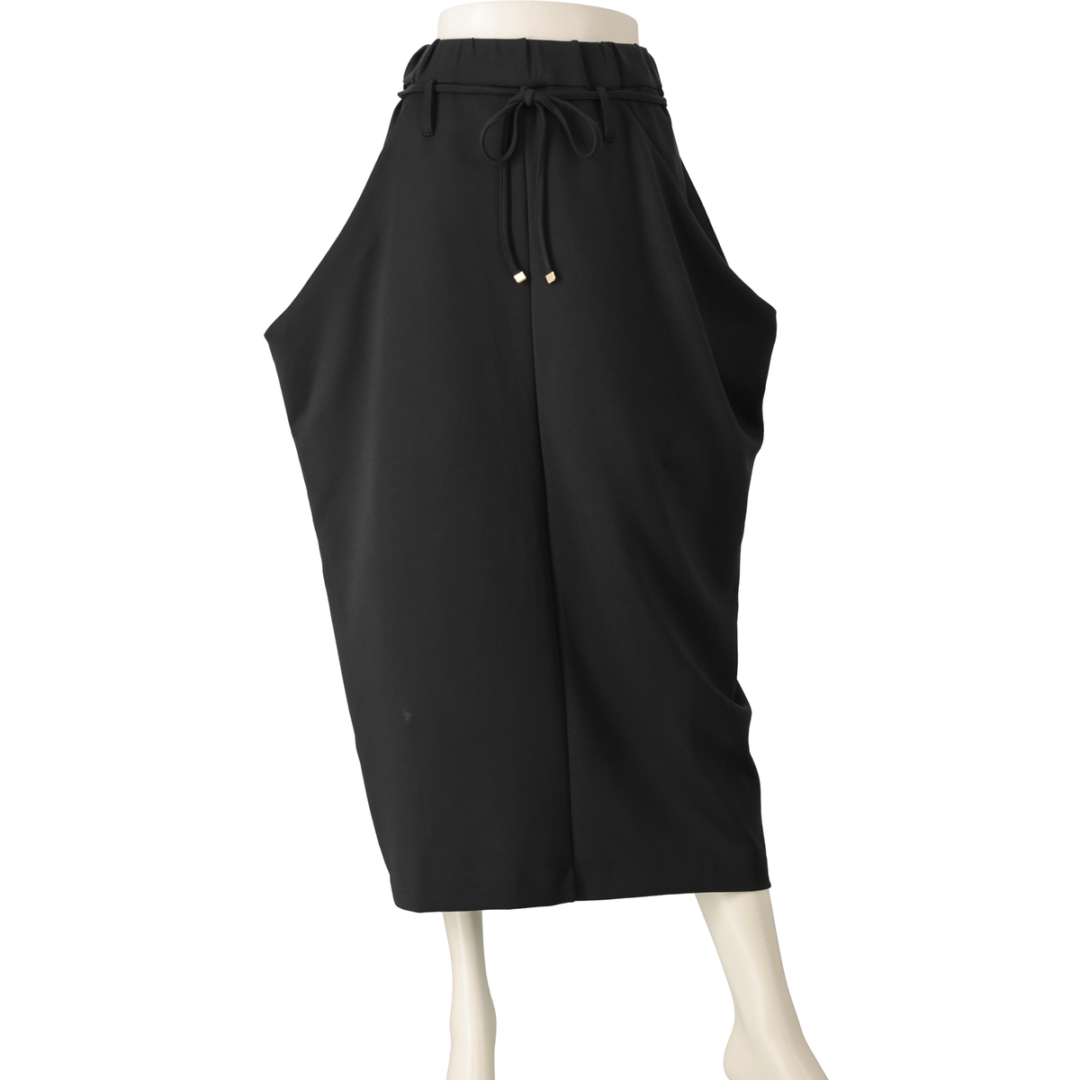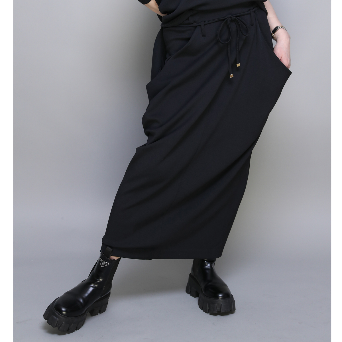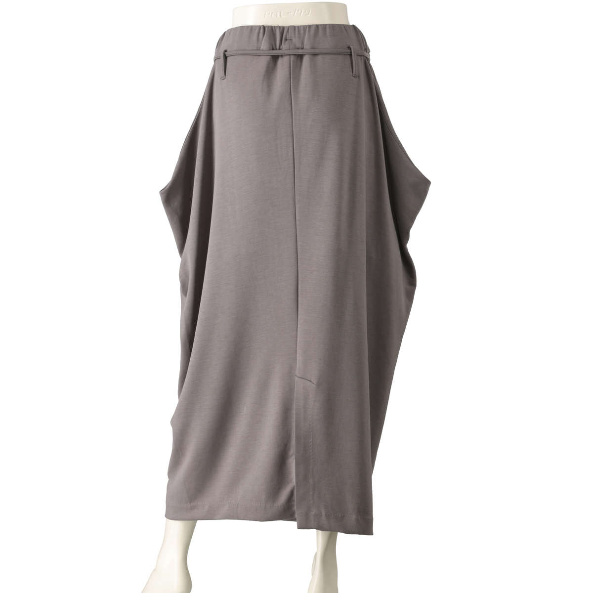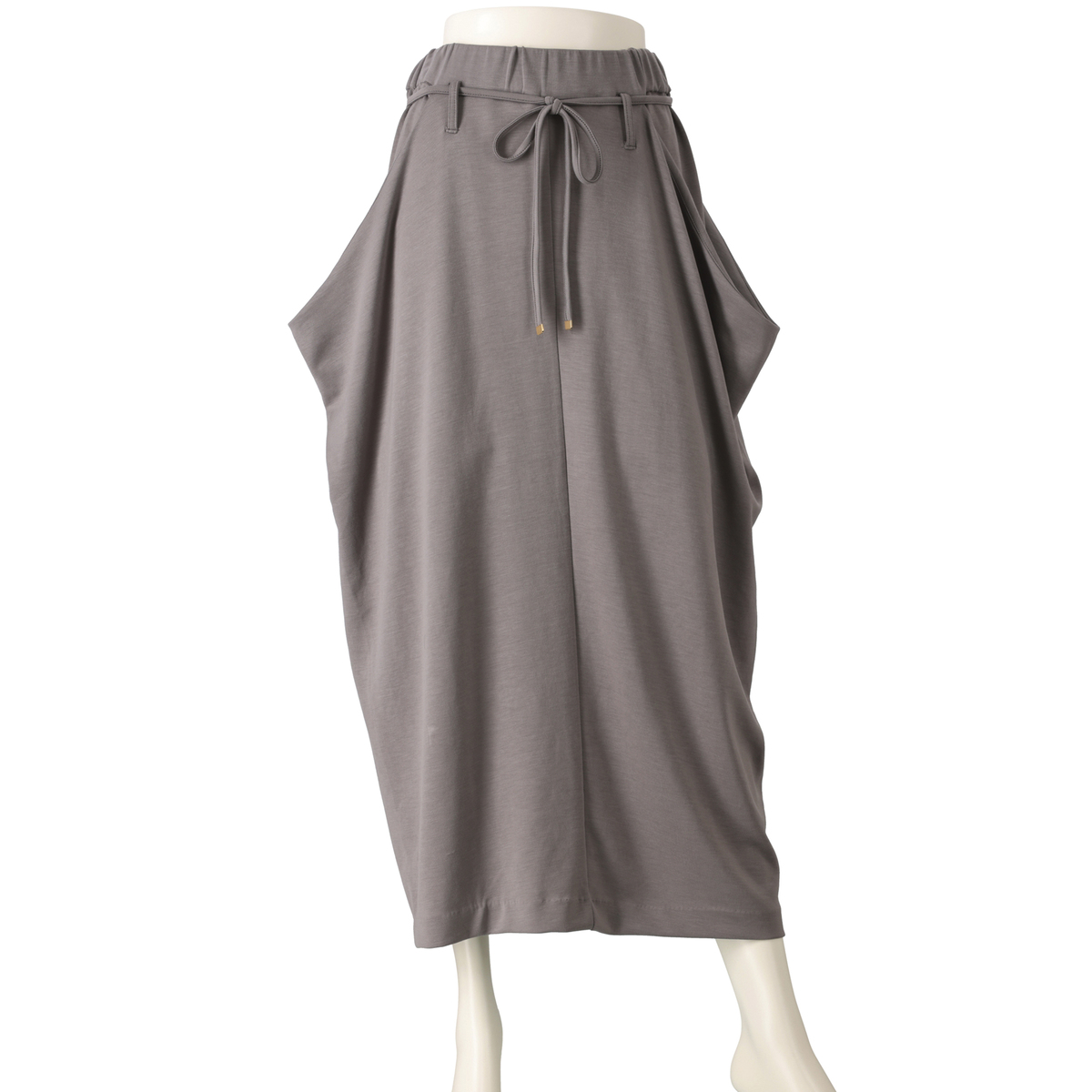 とろみ感のあるダンボールニット素材を使ったドレープスカートです。総ゴムのウエストでプルオン仕様。両脇のドレープ部分は深いポケットで、後ろ中心のベント仕様が足さばきを良くします