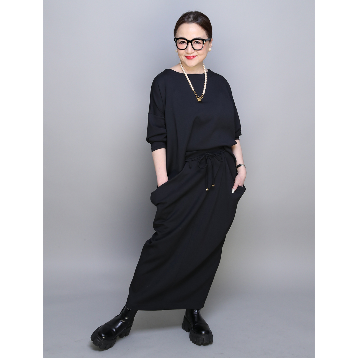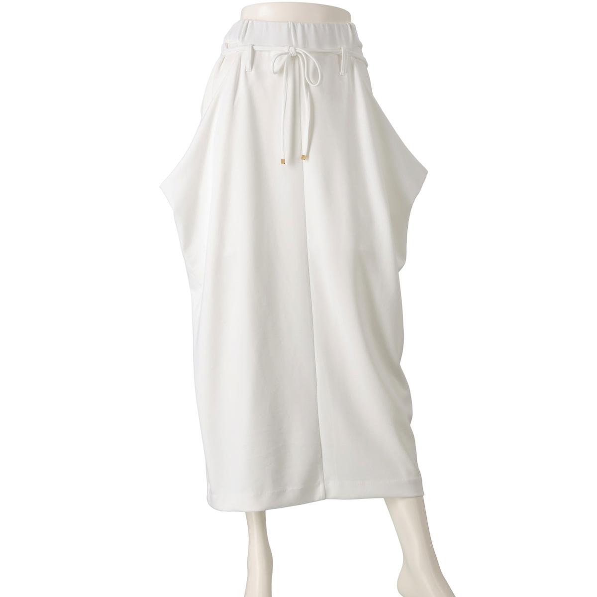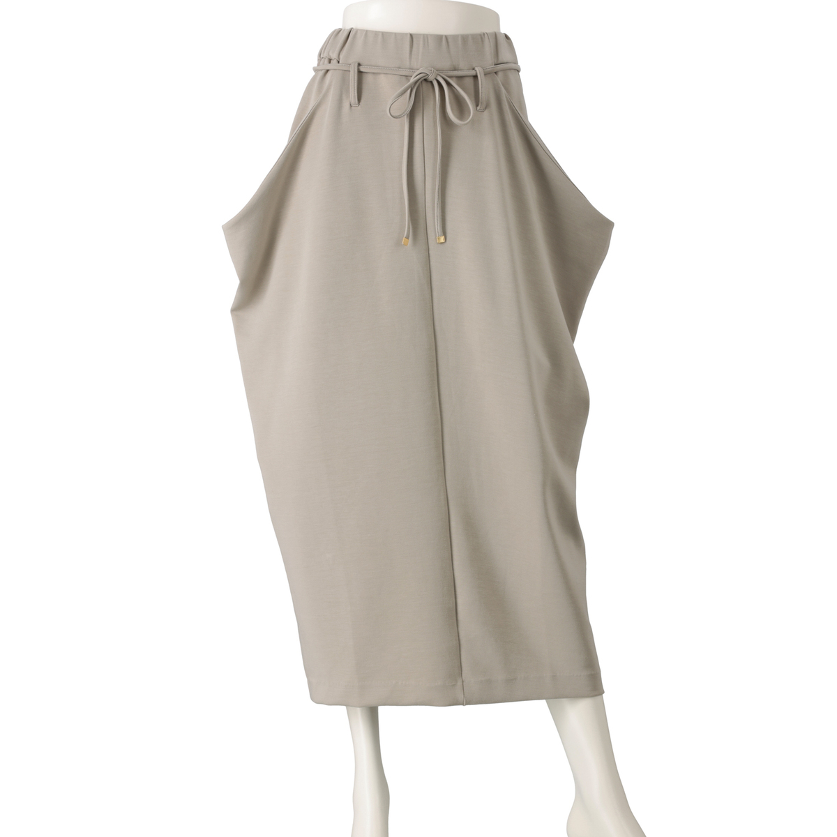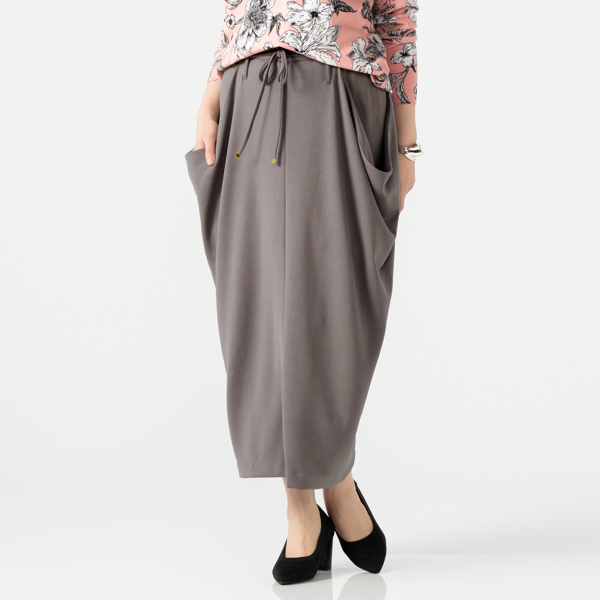 とろみ感のあるダンボールニット素材を使ったドレープスカートです。総ゴムのウエストでプルオン仕様。両脇のドレープ部分は深いポケットで、後ろ中心のベント仕様が足さばきを良くします