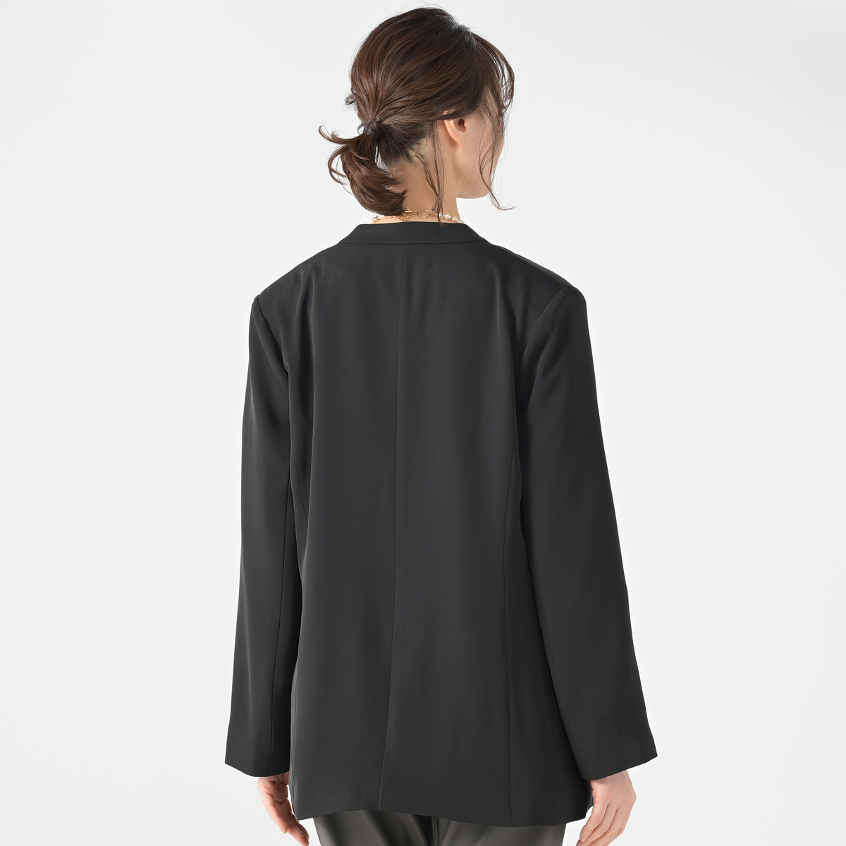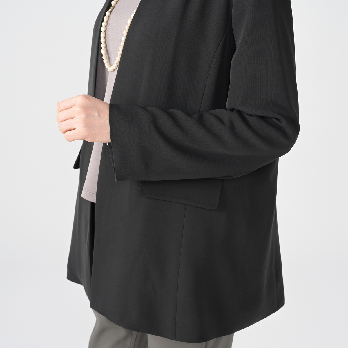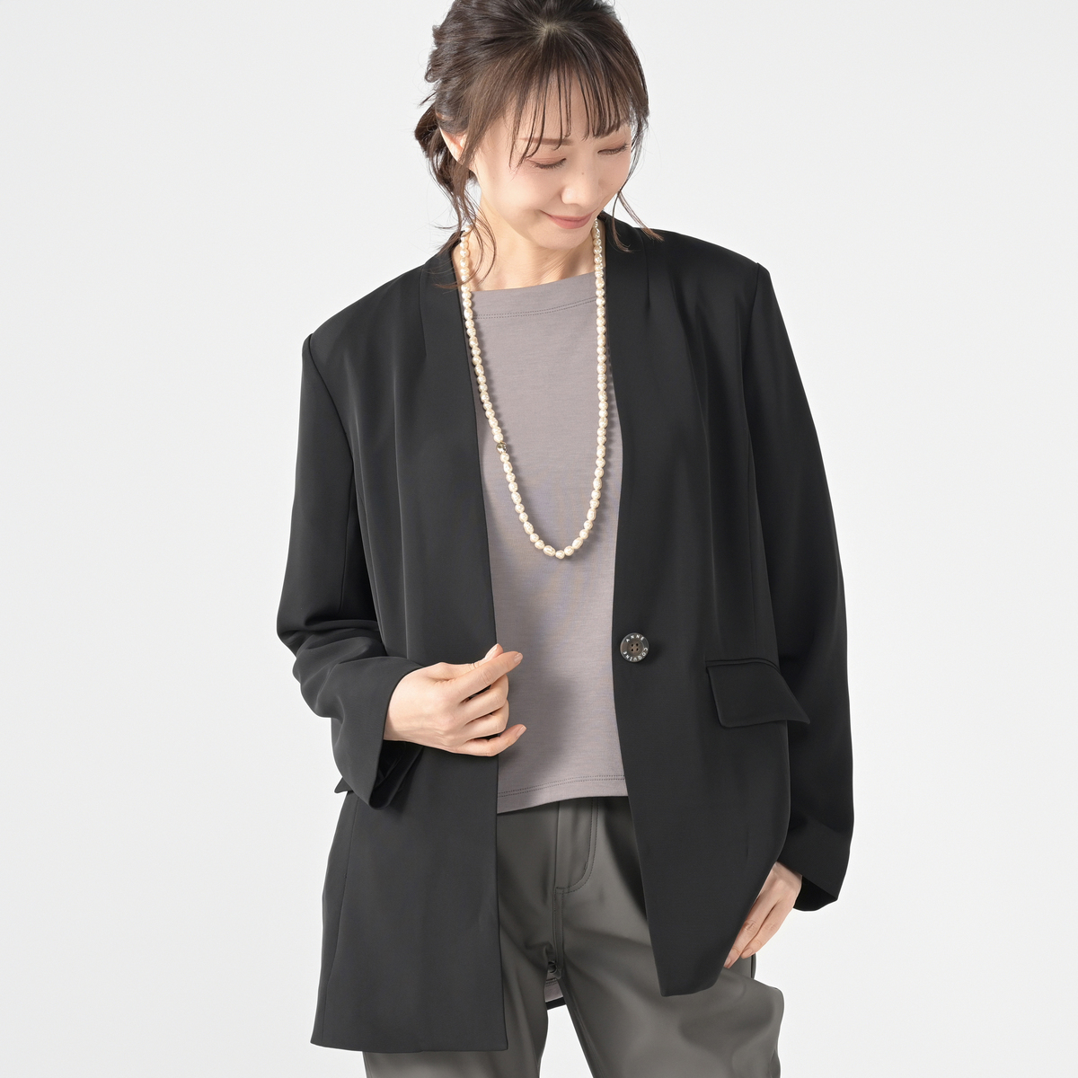 ストレッチ素材を使用したノーカラーのシングルテーラードジャケット。やや長めの丈感がポイントです