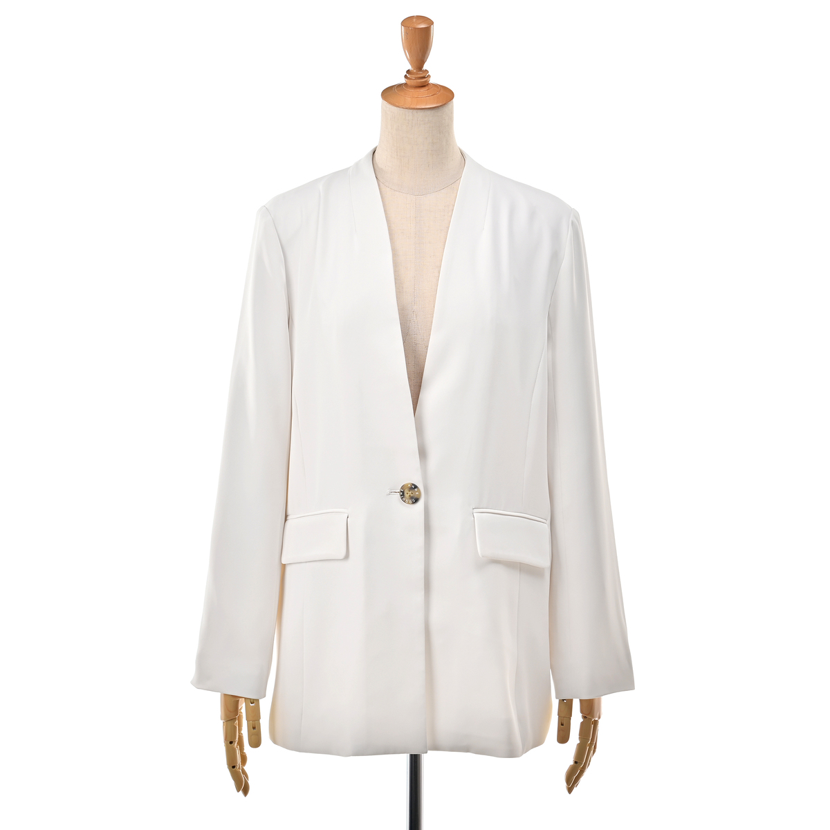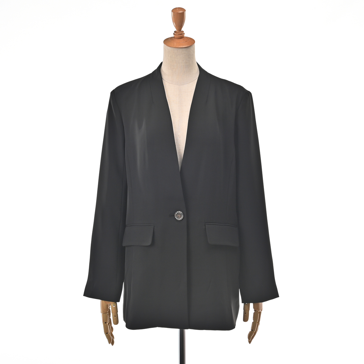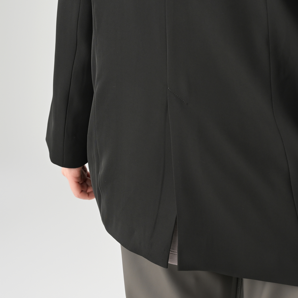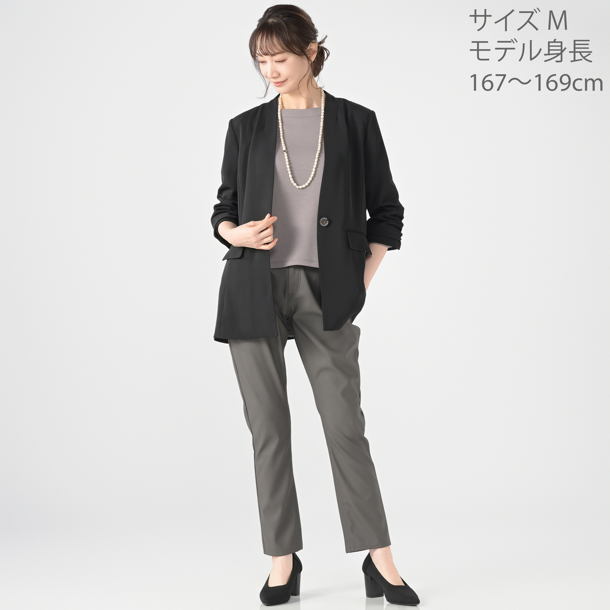 ストレッチ素材を使用したノーカラーのシングルテーラードジャケット。やや長めの丈感がポイントです