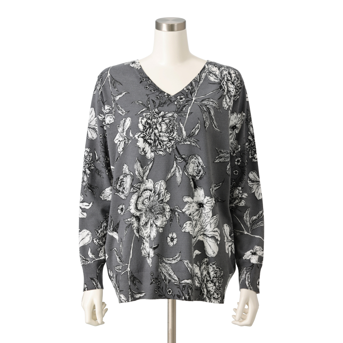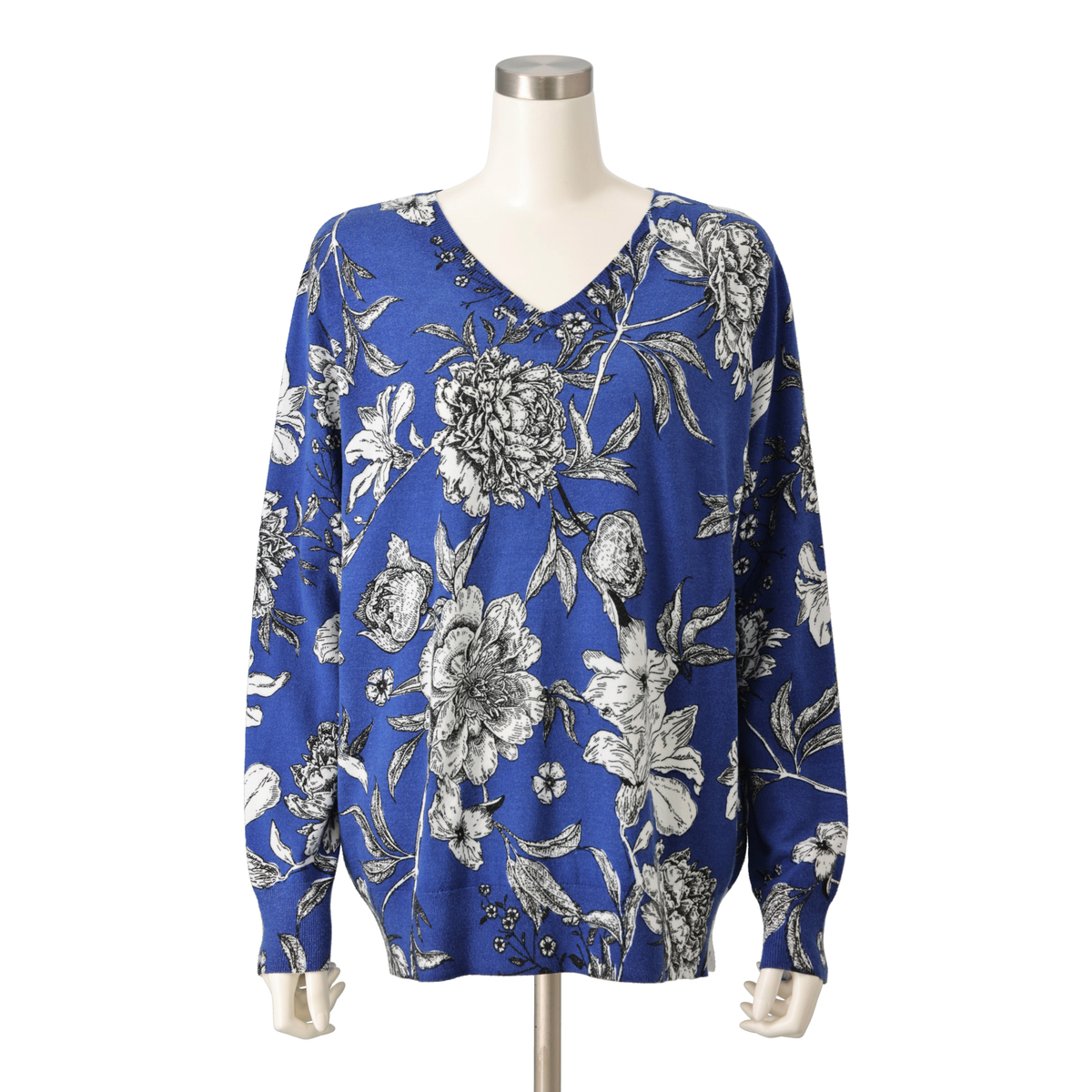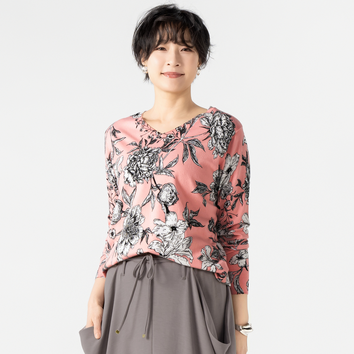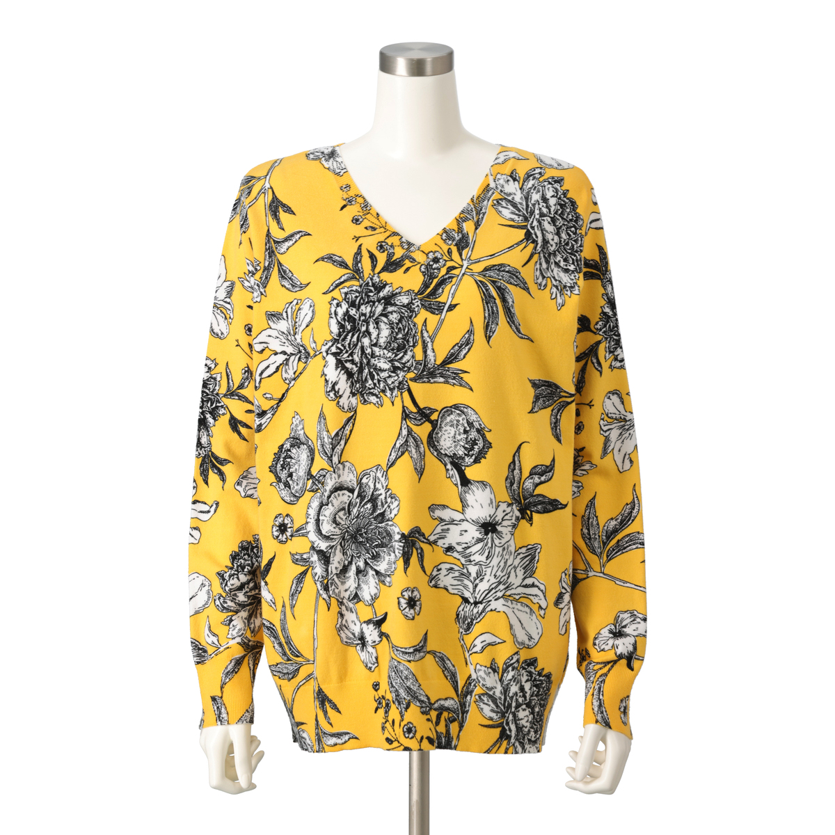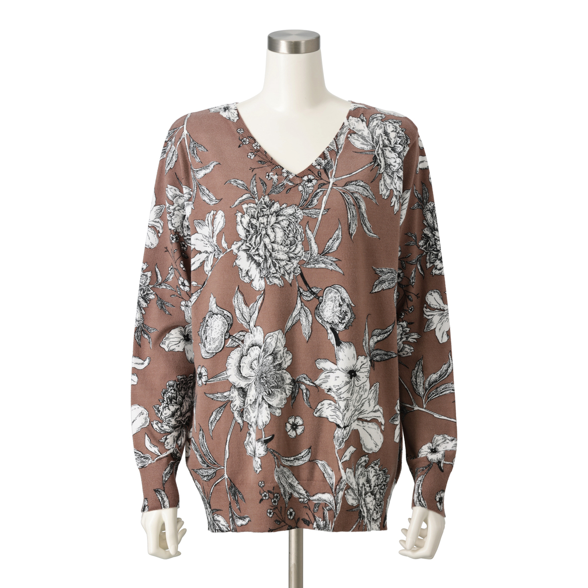 コアスパンヤーンの糸を使ったニットプルオーバーです。オリジナルのフラワープリントとVネックが上品な印象を引き立て、ゆとりのあるシルエットが日常に心地よさを添えます