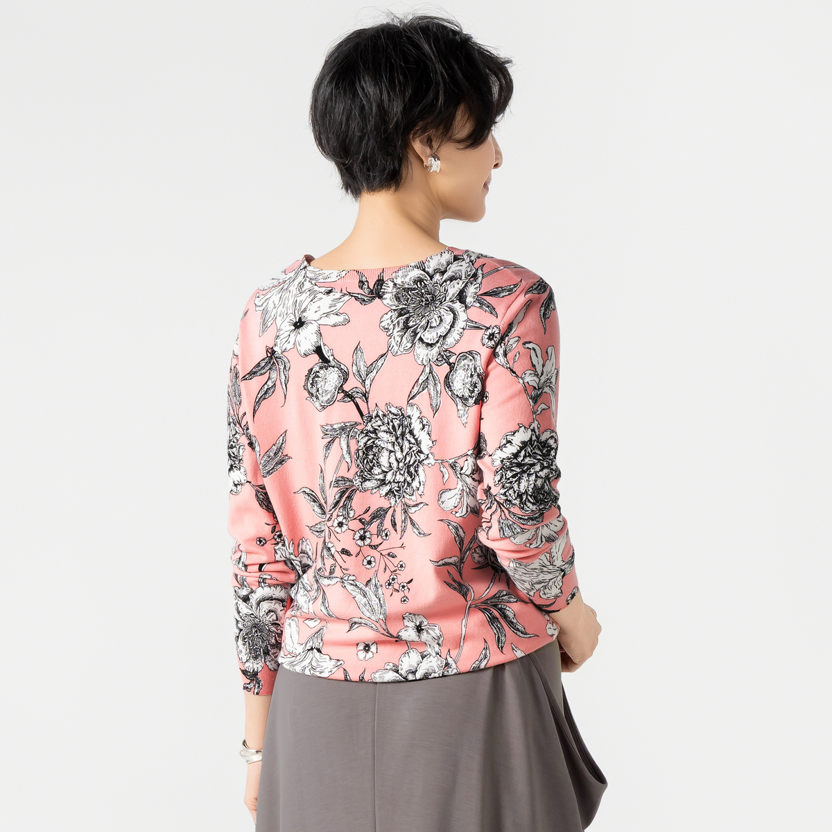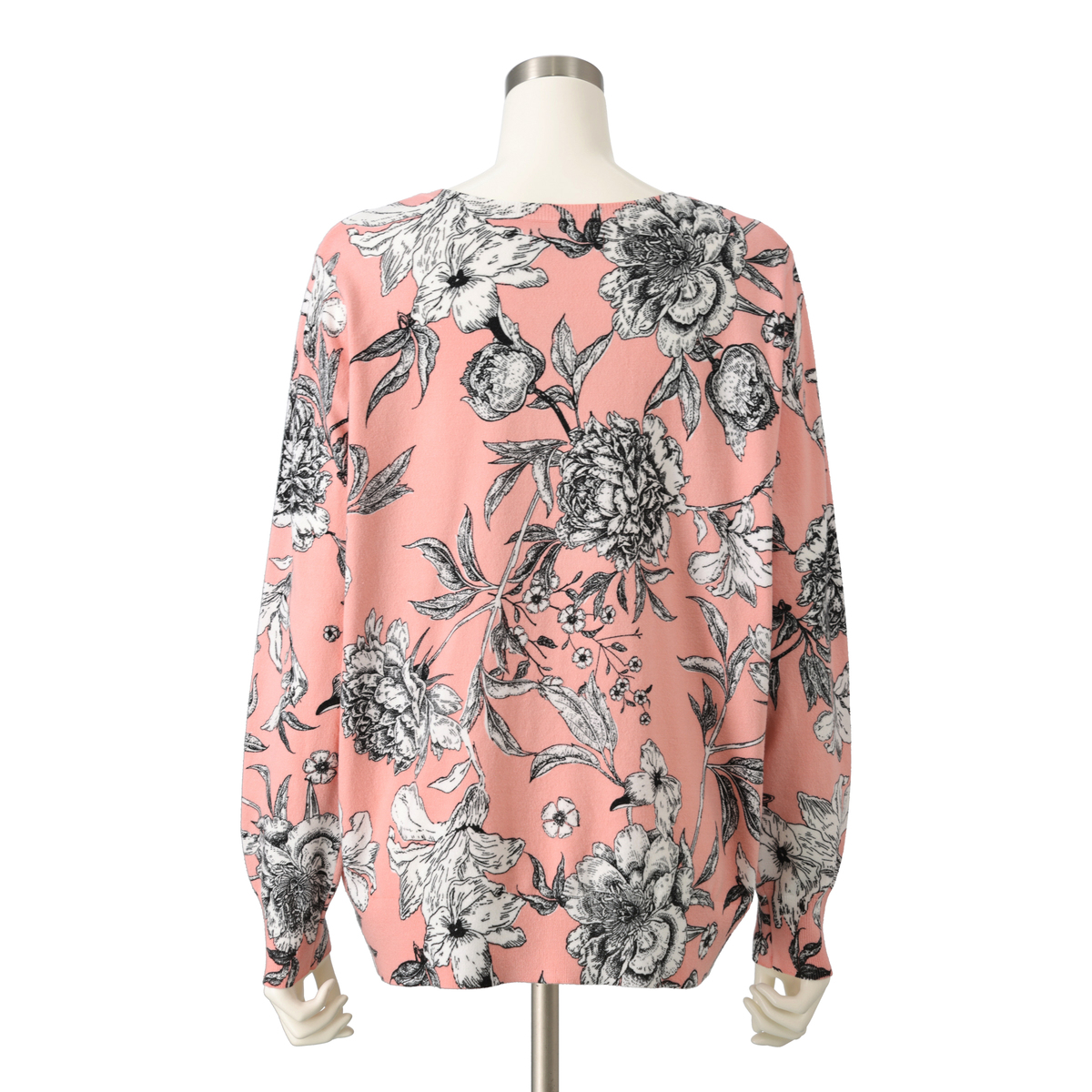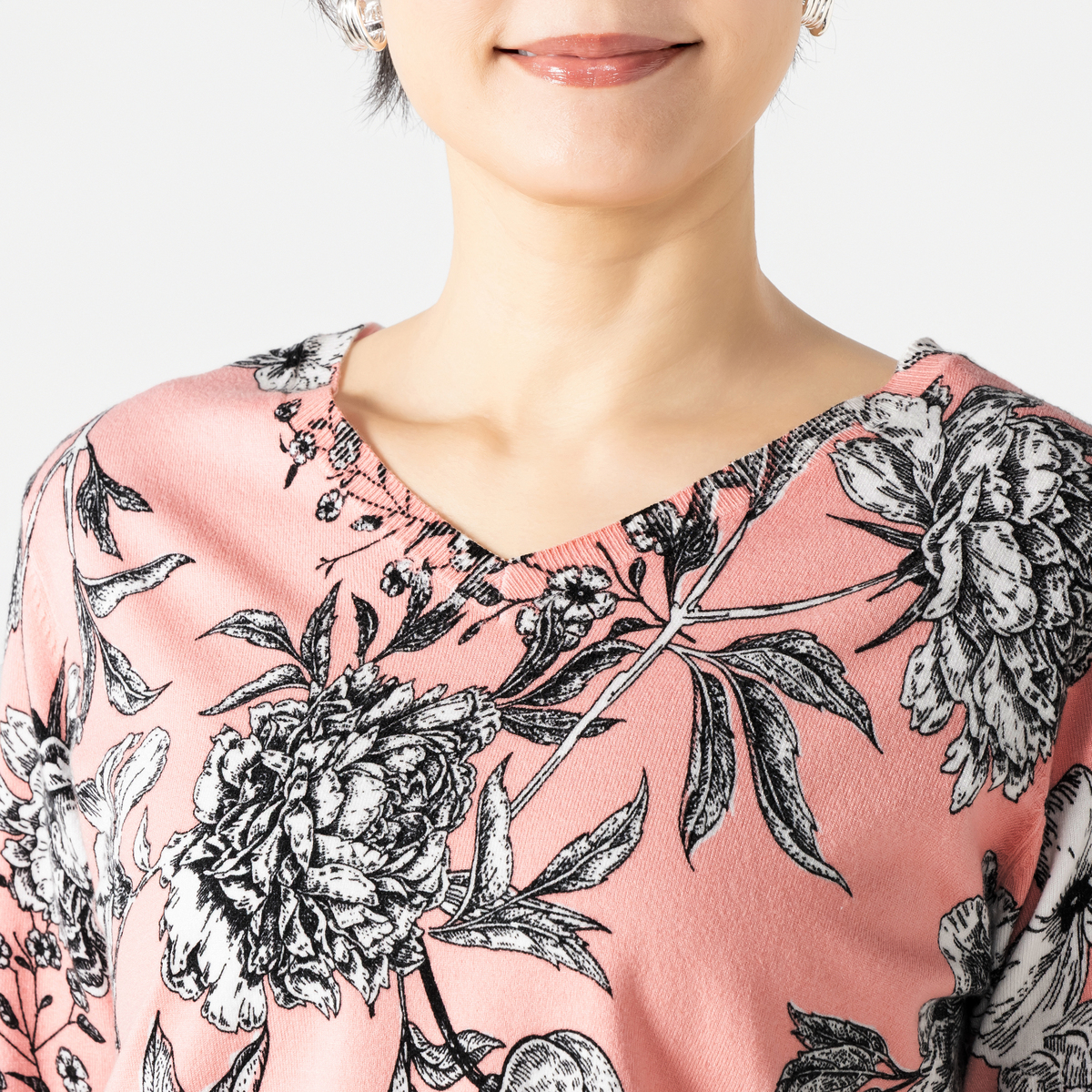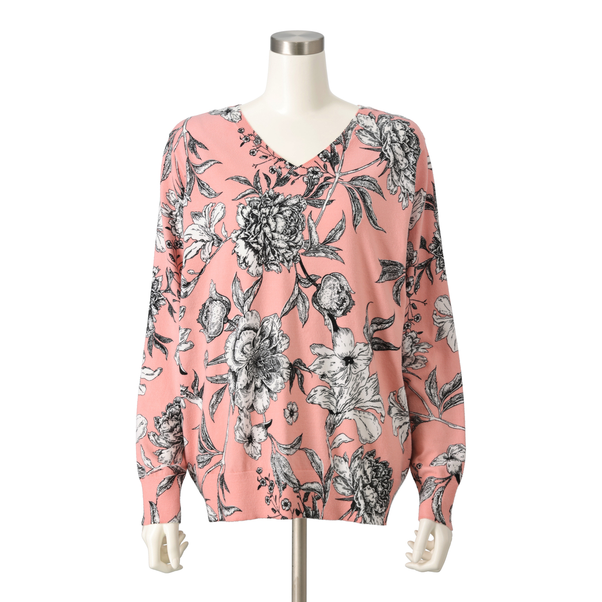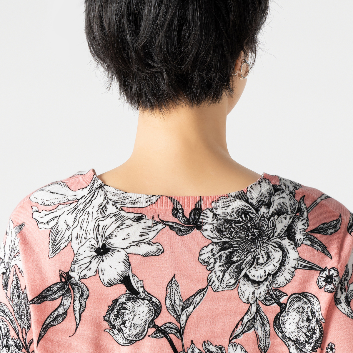 コアスパンヤーンの糸を使ったニットプルオーバーです。オリジナルのフラワープリントとVネックが上品な印象を引き立て、ゆとりのあるシルエットが日常に心地よさを添えます
