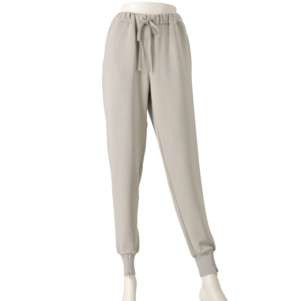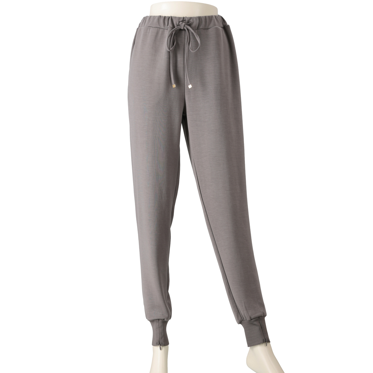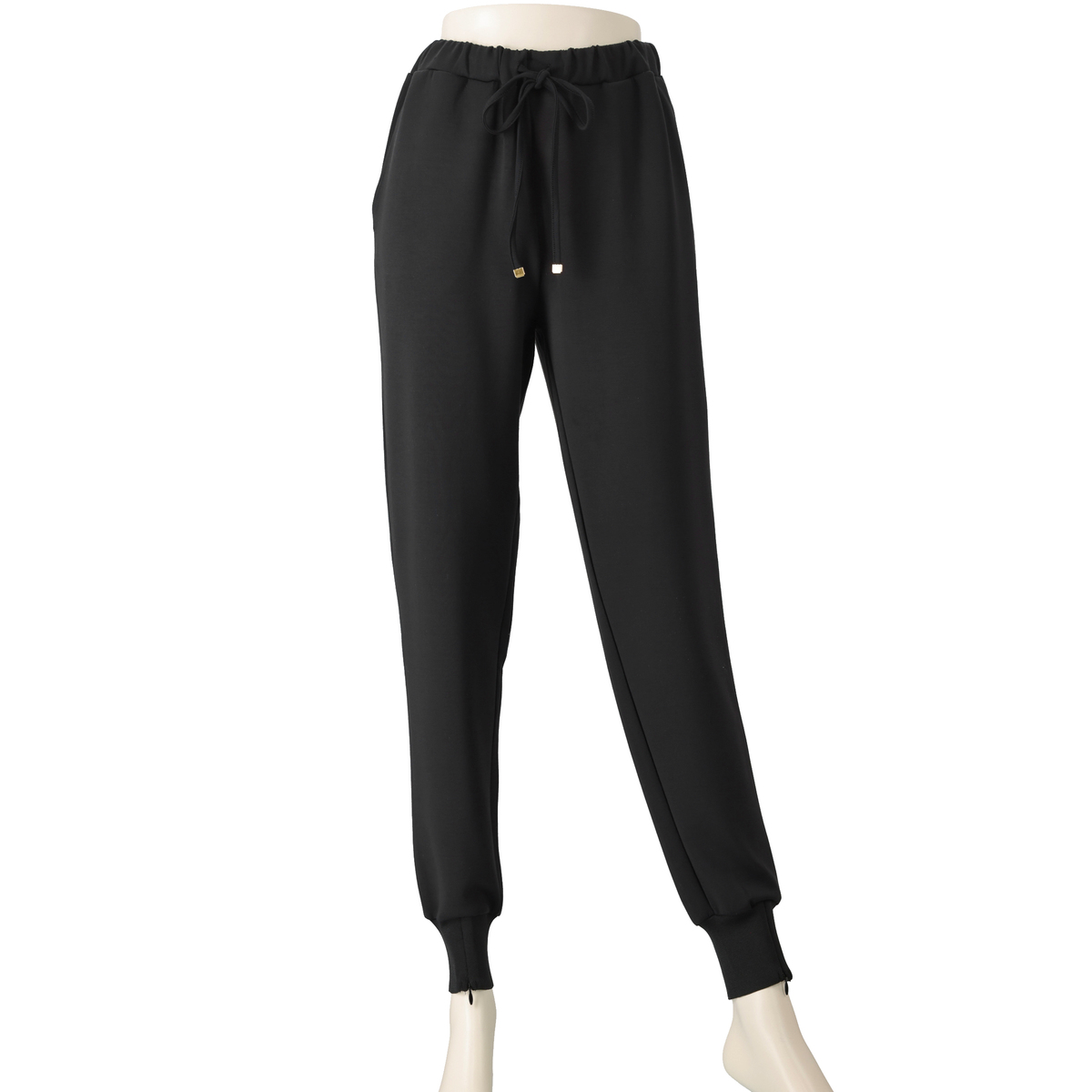 軽やかなダンボールニット素材のジョガーパンツです。ウエストは総ゴムのプルオン仕様で、紐先に金色のループエンドをあしらい、上品なアクセントに。裾リブのファスナーを開け閉めして、シルエットを変えることもできます