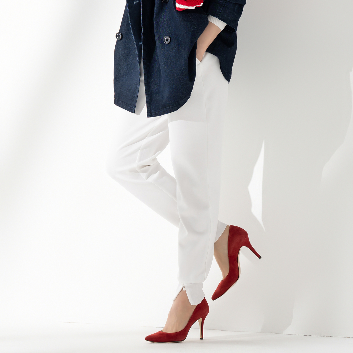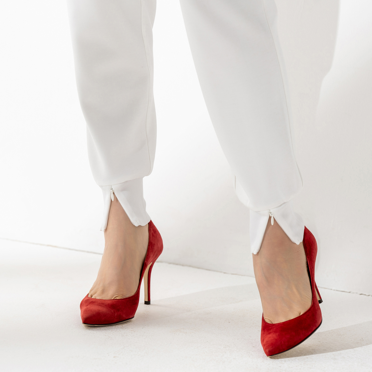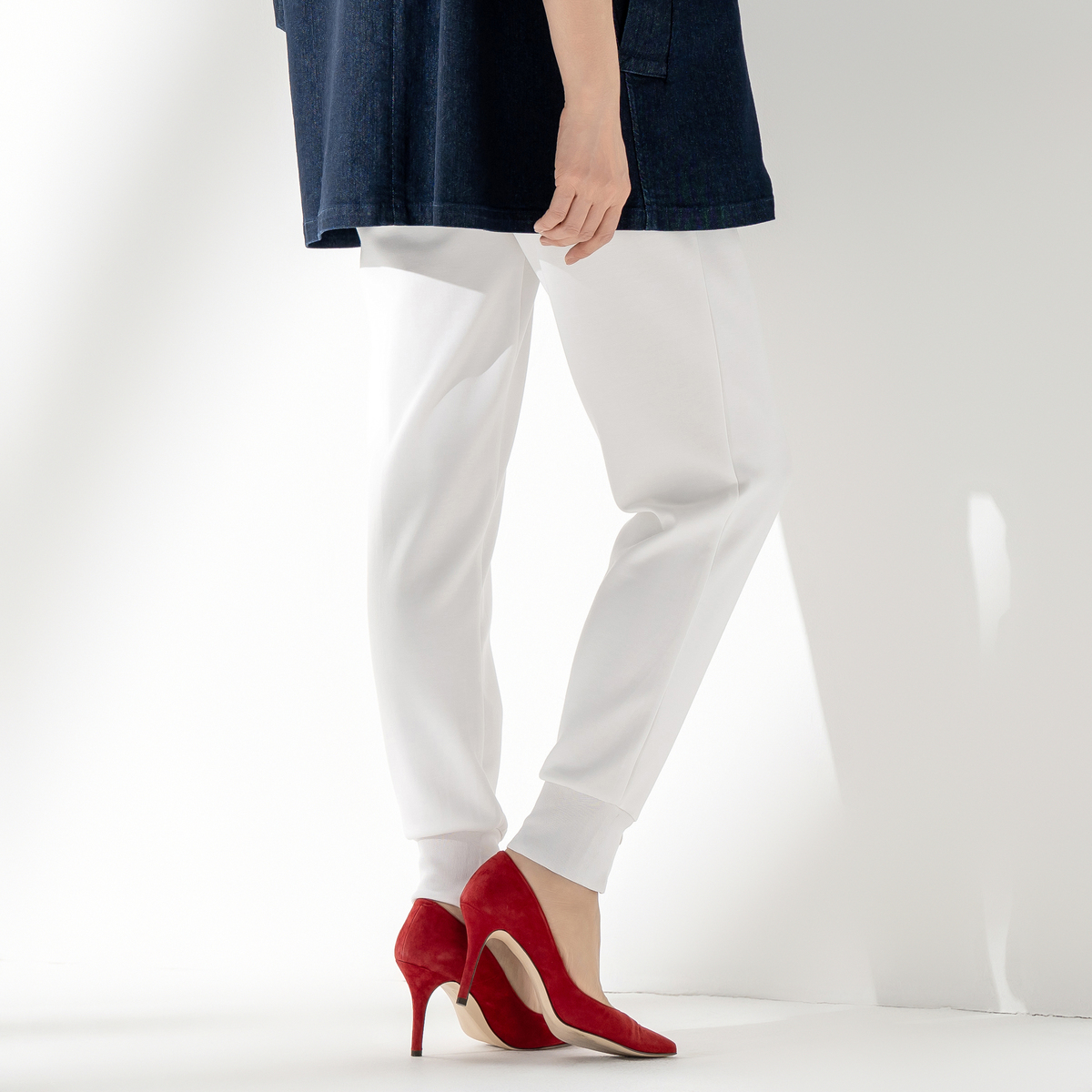 軽やかなダンボールニット素材のジョガーパンツです。ウエストは総ゴムのプルオン仕様で、紐先に金色のループエンドをあしらい、上品なアクセントに。裾リブのファスナーを開け閉めして、シルエットを変えることもできます