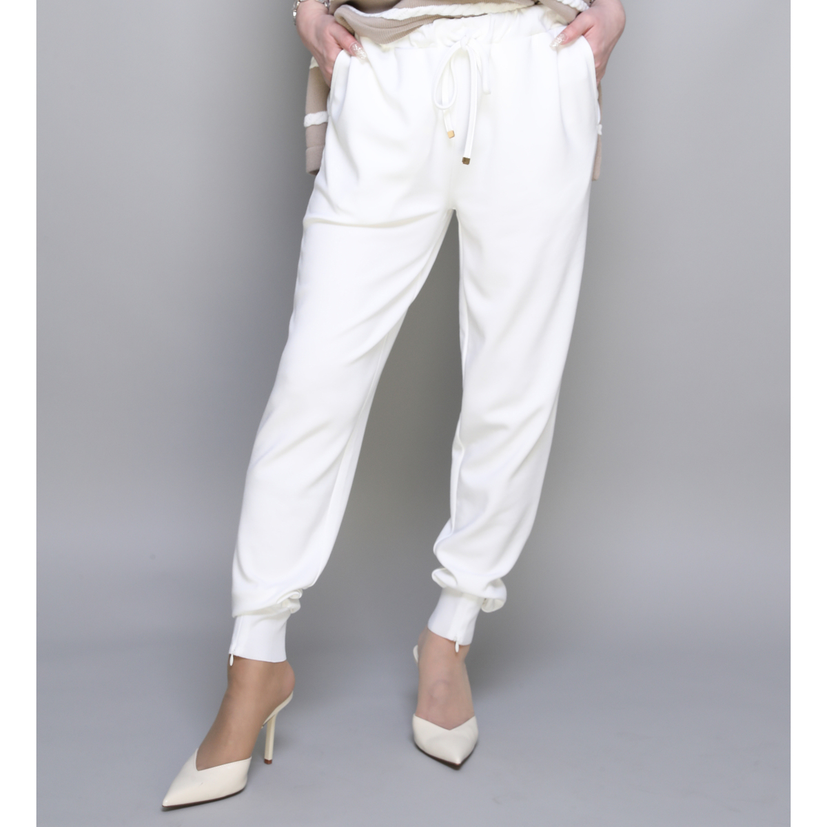 軽やかなダンボールニット素材のジョガーパンツです。ウエストは総ゴムのプルオン仕様で、紐先に金色のループエンドをあしらい、上品なアクセントに。裾リブのファスナーを開け閉めして、シルエットを変えることもできます