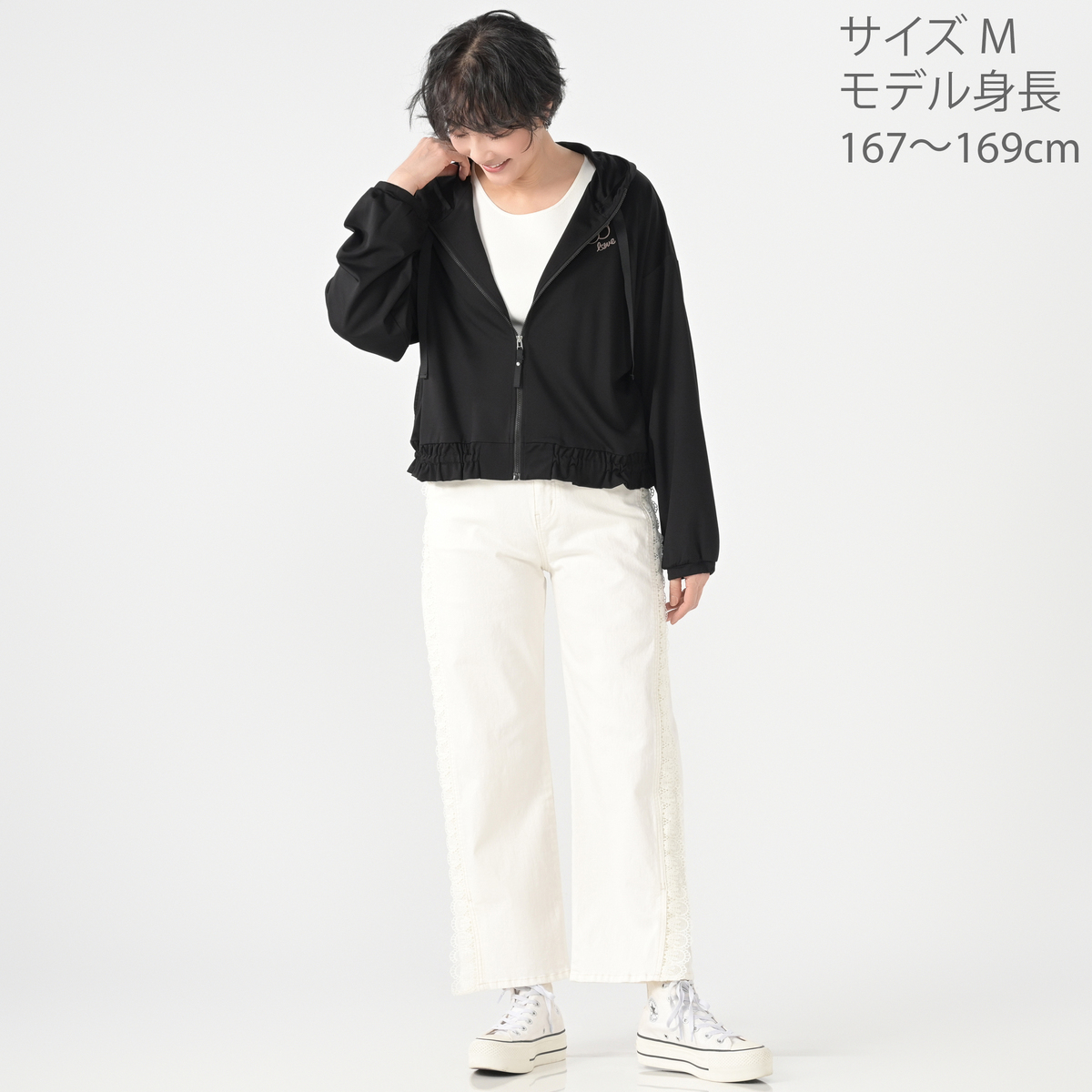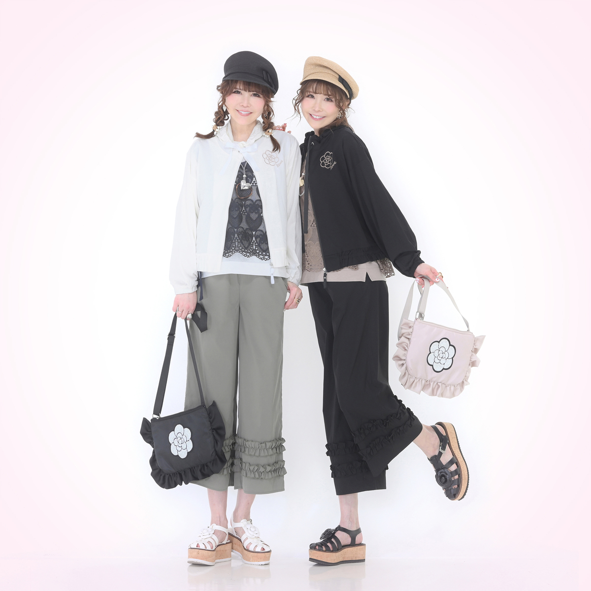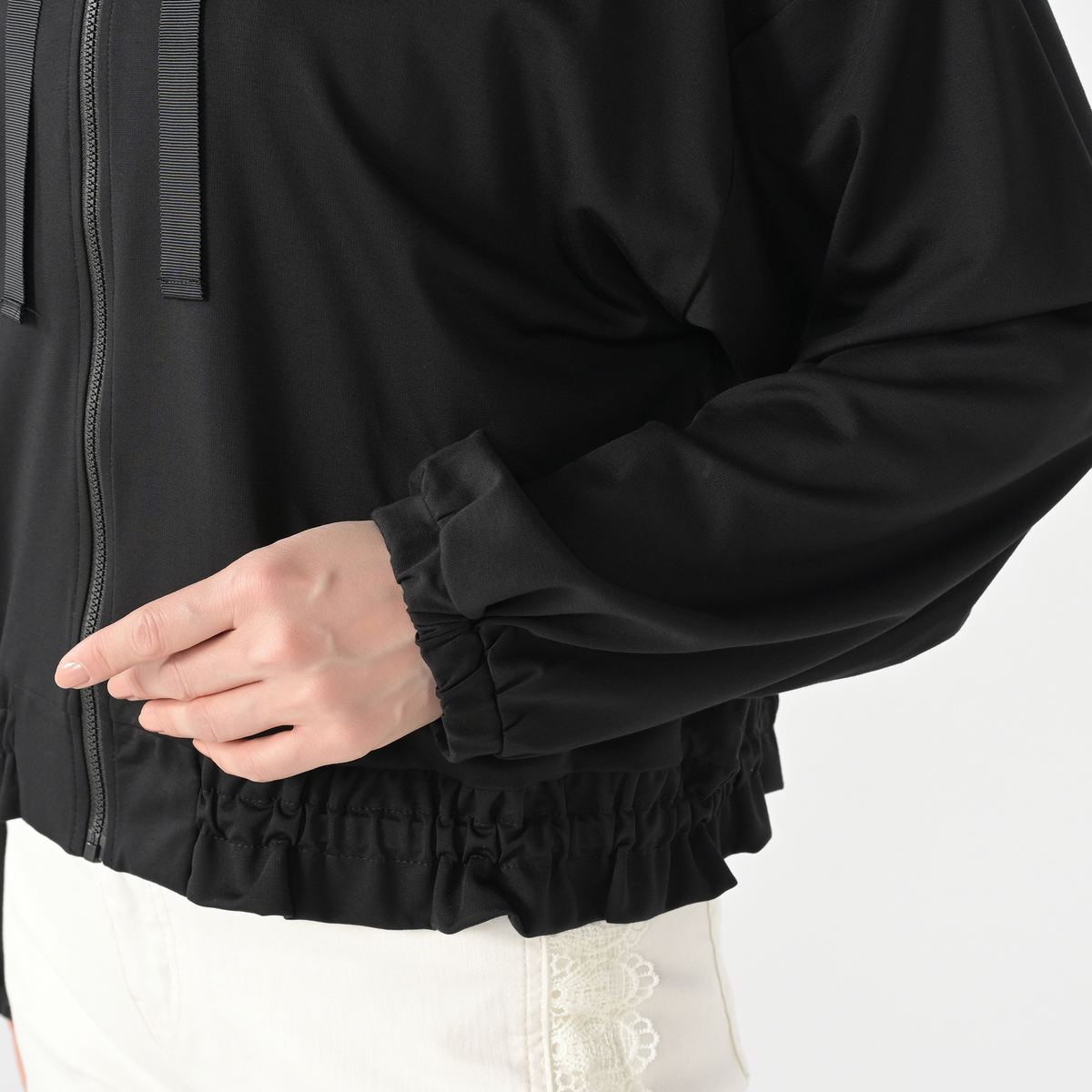 裾の細ゴムでふんわりと控えめなフリル風に仕立て、ファスナースライダーにはグログランテープの持ち手とラインストーンのカシメを施し、こだわりのアクセントになっています。両脇には実用的なポケット付きです