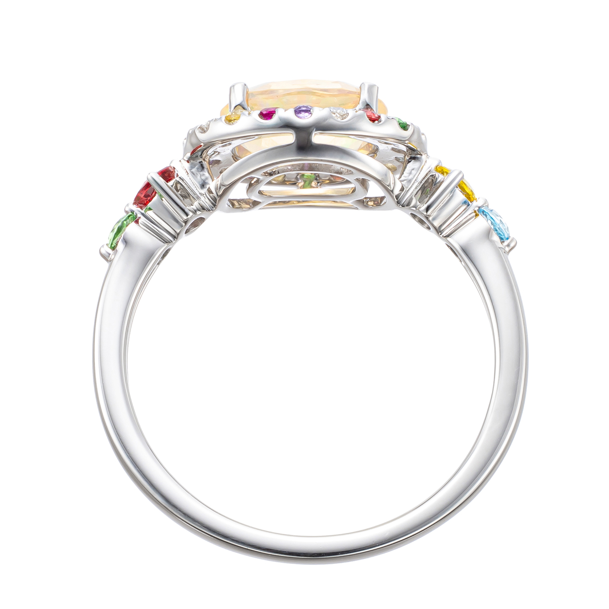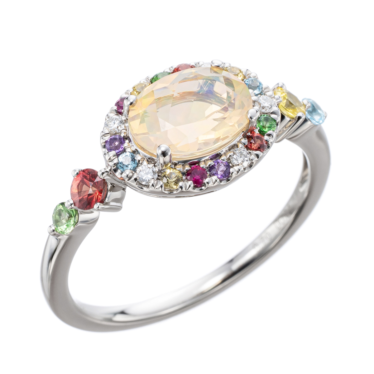 優しい透明感の中に、虹色が浮遊しているような幻想的なオパールをセンターに、選び抜いた7色の色石とダイヤモンドが彩る、豊かな色彩と煌めきのジュエリーです