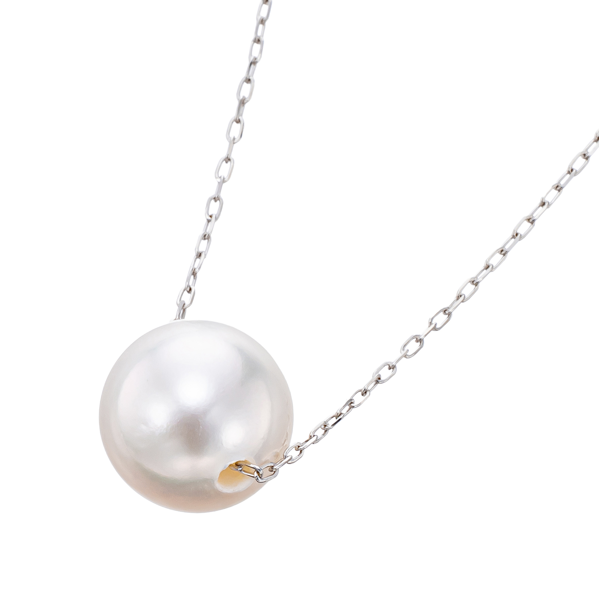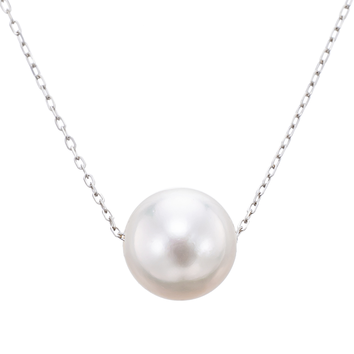 上品な輝きを放つ、9.0mmUPのアコヤ真珠を使用したスルーペンダント。18Kホワイトゴールドの繊細なチェーンが真珠の美しさを引き立て、胸元を印象的に飾ります