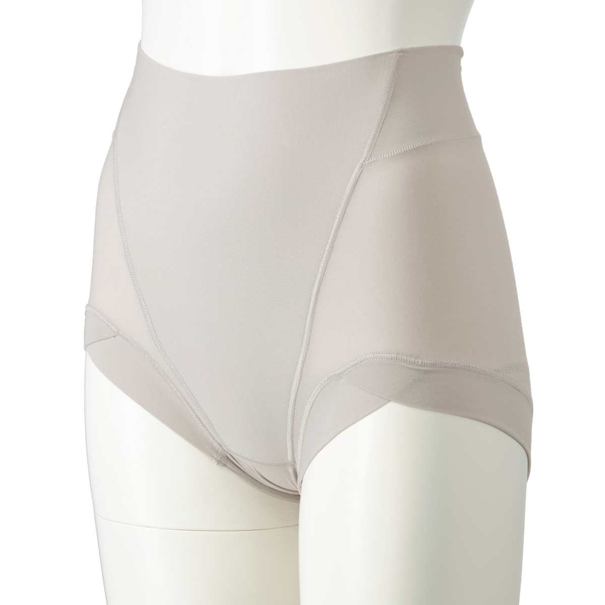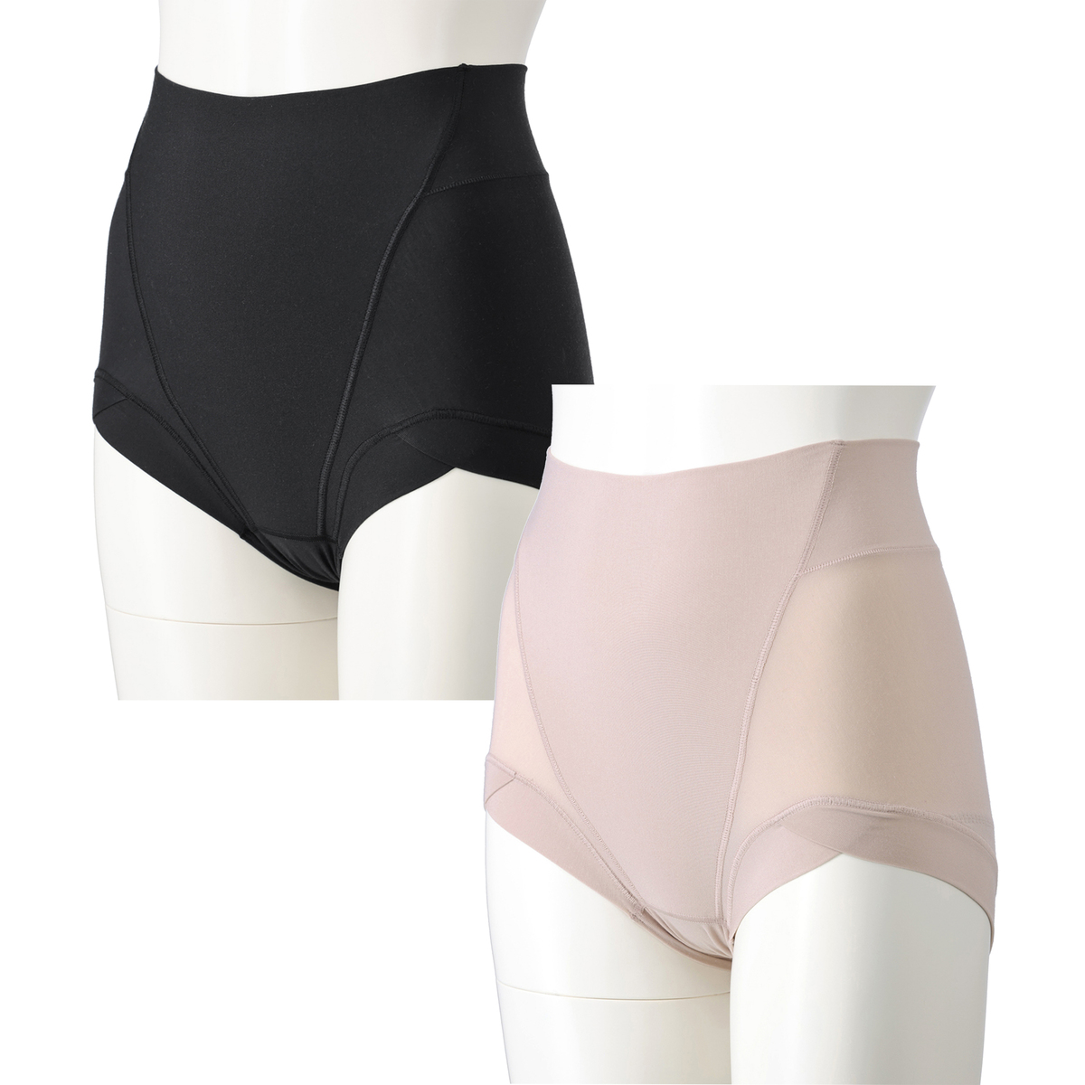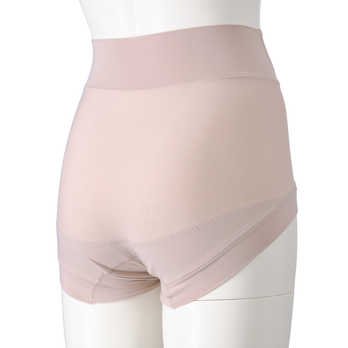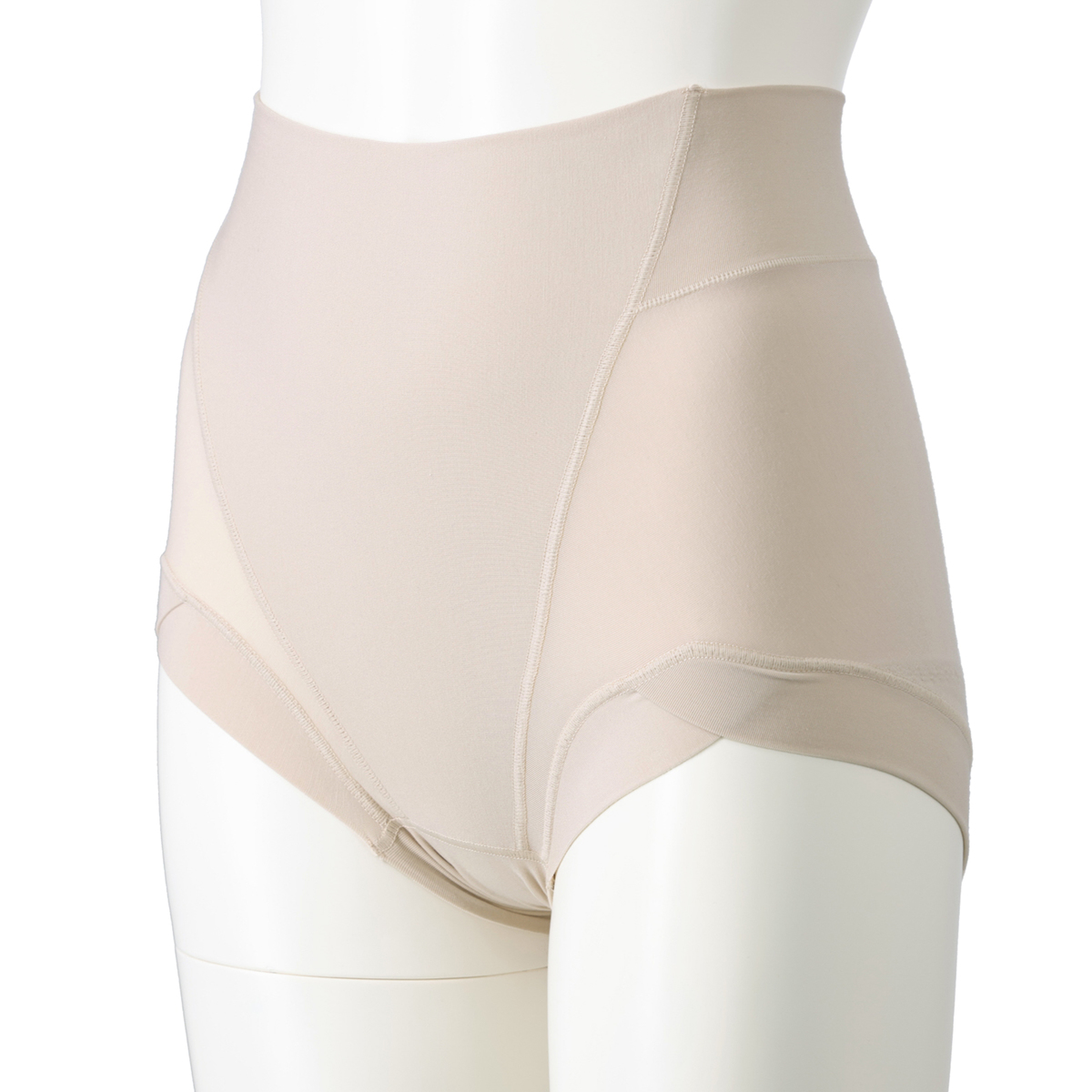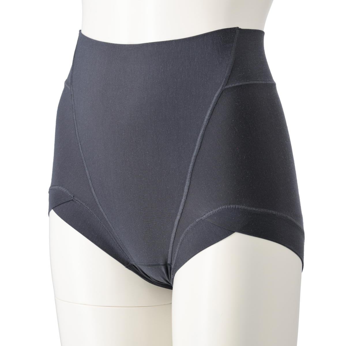 ハイウエスト設計と幅広パネルが腰まわりをすっぽりカバーし、段差を作りにくい仕様です。フロントは二重生地でお腹を押さえ、すっきりとしたシルエットを演出。そけい部はクロス設計で圧迫感を軽減し、テープレスで食い込みにくい優しい着用感です