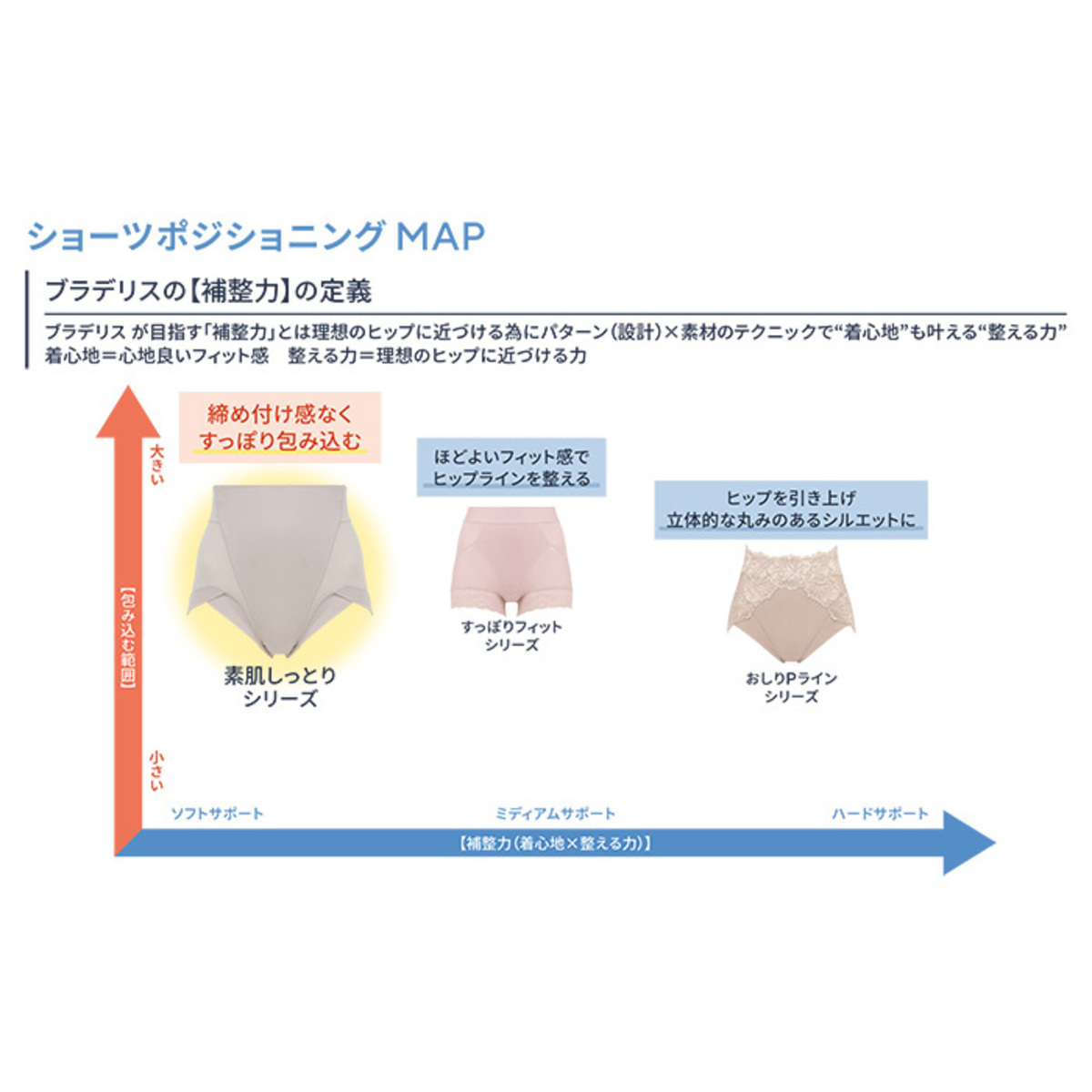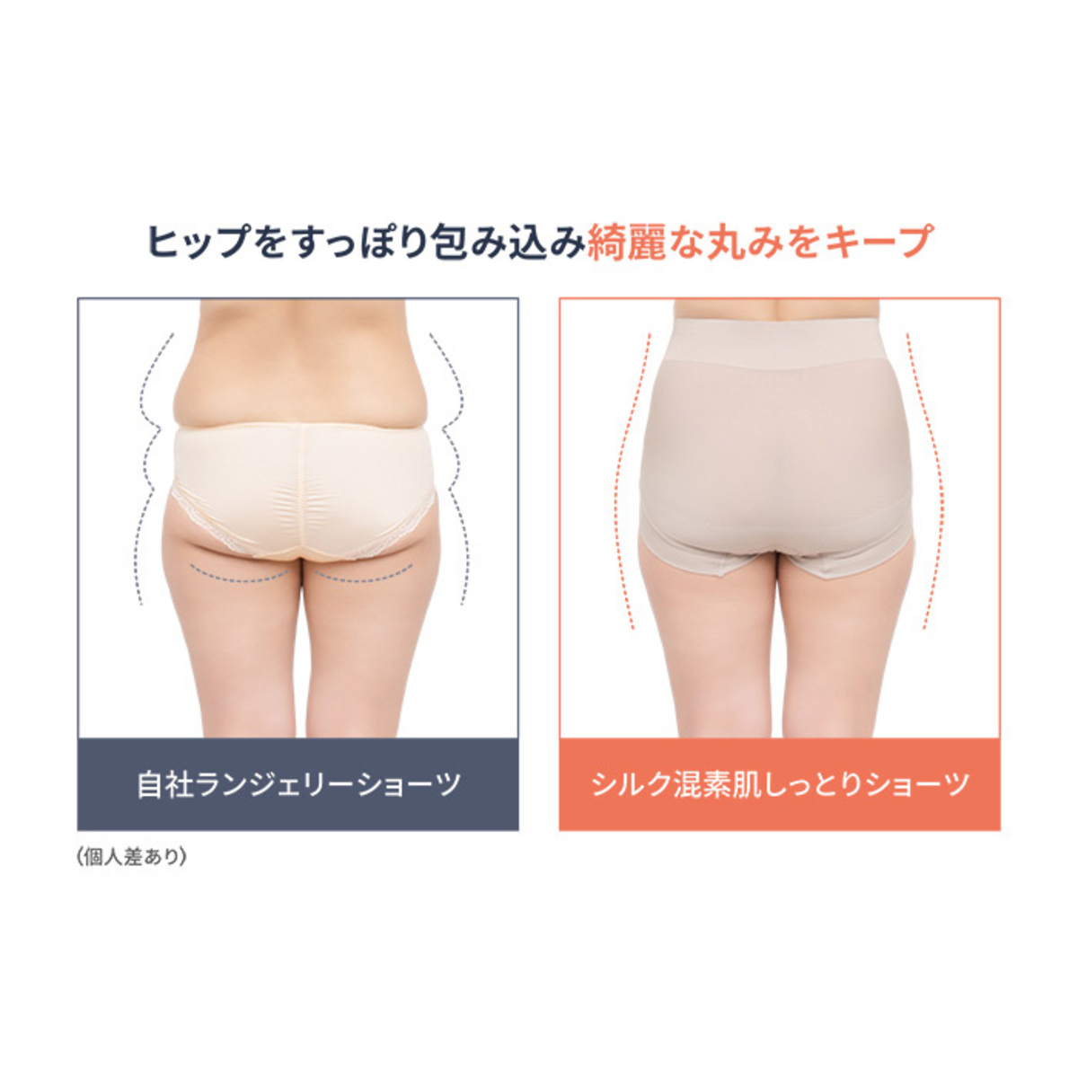 一枚仕立てのヒップ部分は、広がったおしりを集めてすっぽりと包み込み、心地よくフィット。ヒップ下部内側の下垂防止パネルが、お尻のお肉をすくい上げ、丸みをキープします