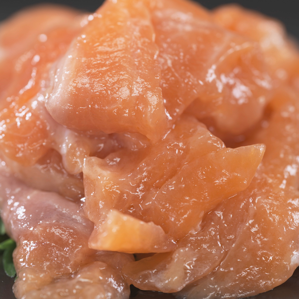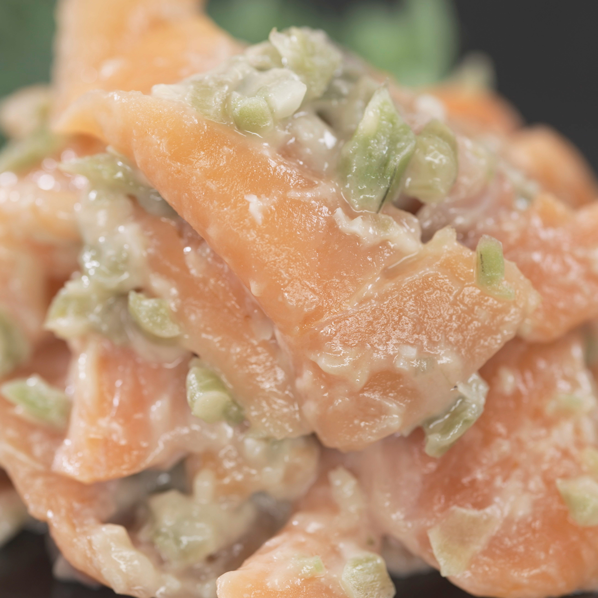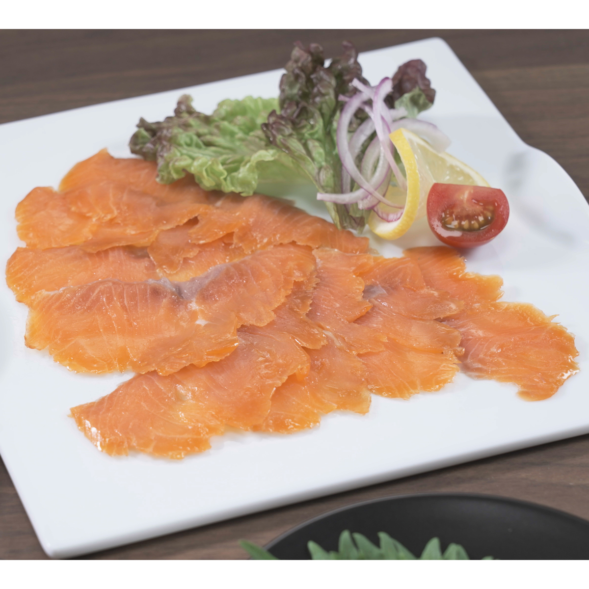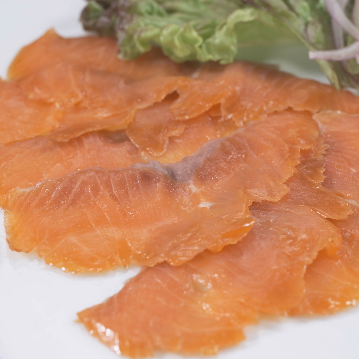 目利きが選んだ贅沢なサーモンセット。塩麹和え、昆布しょうゆ漬け、粗切りわさび和えには、生で食べられるサーモンを使用しました。スモークサーモンスライスは食塩のみで味付けし、塩水漬け込みと冷燻製法で仕上げることで、しっとりとした肉質ともっちり食感を実現。解凍するだけで、素材の旨みを存分にお楽しみいただけます