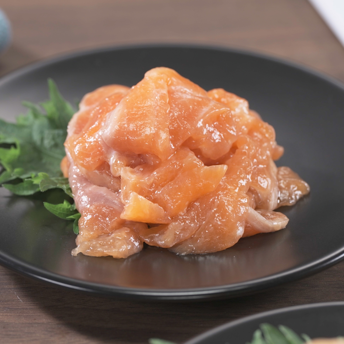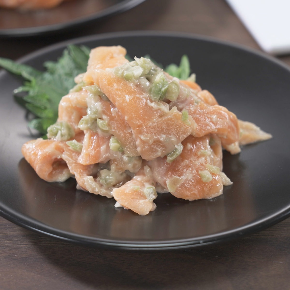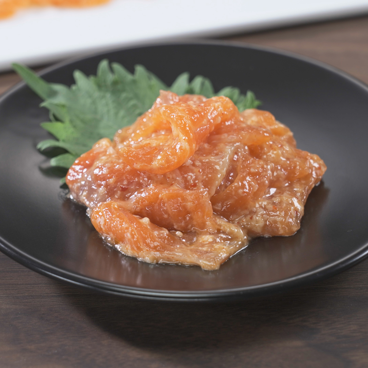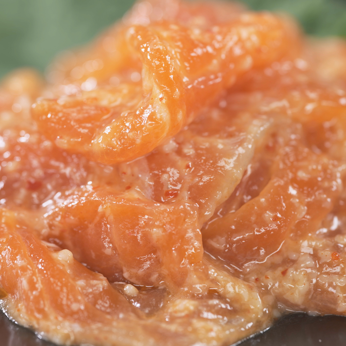 目利きが選んだ贅沢なサーモンセット。塩麹和え、昆布しょうゆ漬け、粗切りわさび和えには、生で食べられるサーモンを使用しました。スモークサーモンスライスは食塩のみで味付けし、塩水漬け込みと冷燻製法で仕上げることで、しっとりとした肉質ともっちり食感を実現。解凍するだけで、素材の旨みを存分にお楽しみいただけます