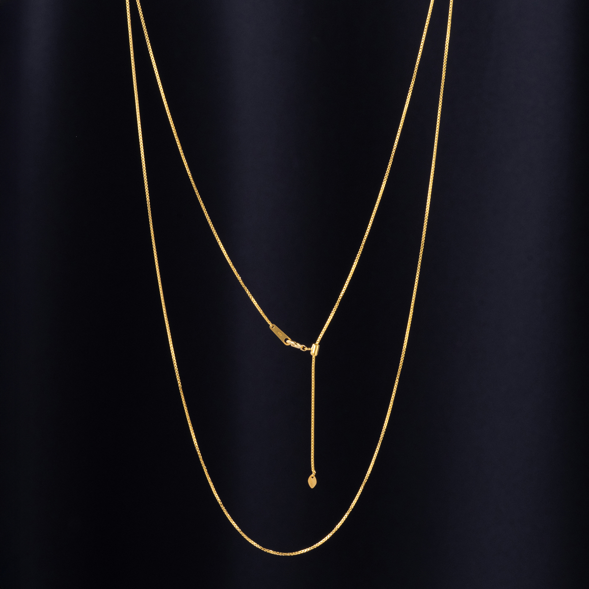 スライド式アジャスター付きで長さを自在に調整でき、好みや装いに合わせた着け方ができます。上品さと華やかさの両方を一本で楽しめ、日常にも特別な装いにも映える純金チェーンです