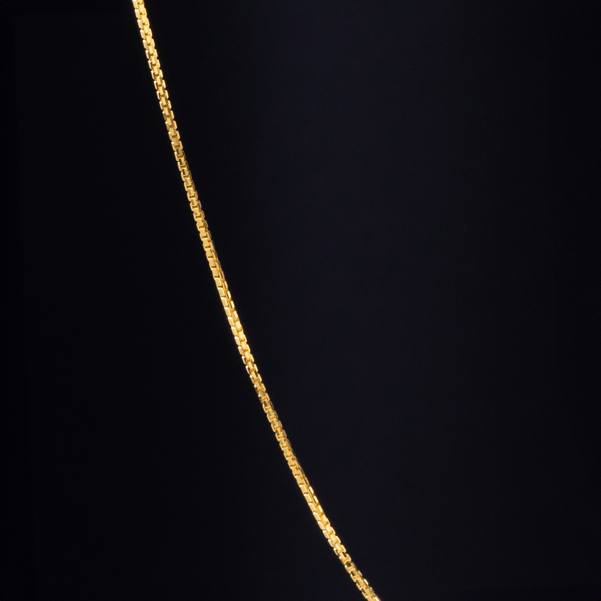 強いきらめきを放つ純金ネックレス。定番として知られるベネチアンチェーンにVカットを施し、通常の4面・8面よりも多い16面カットに仕上げました。光を受ける角度が増えることで、首元に連続した輝きが生まれます