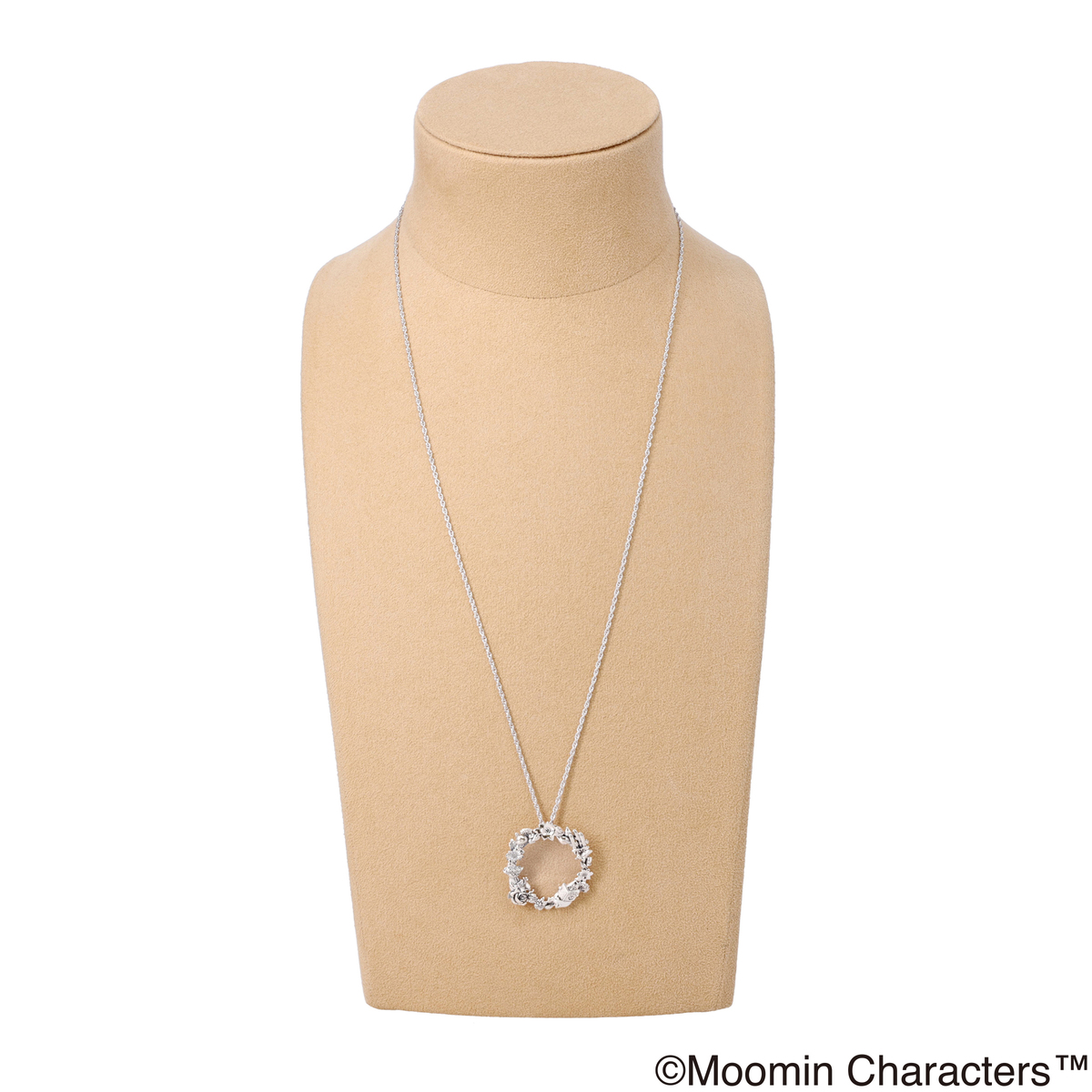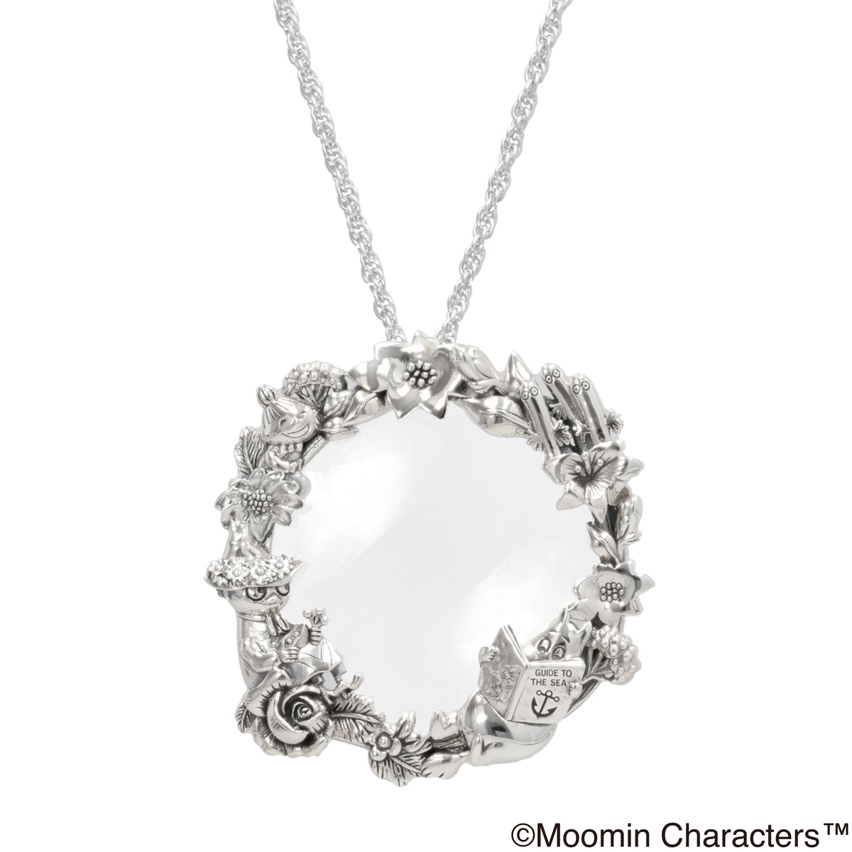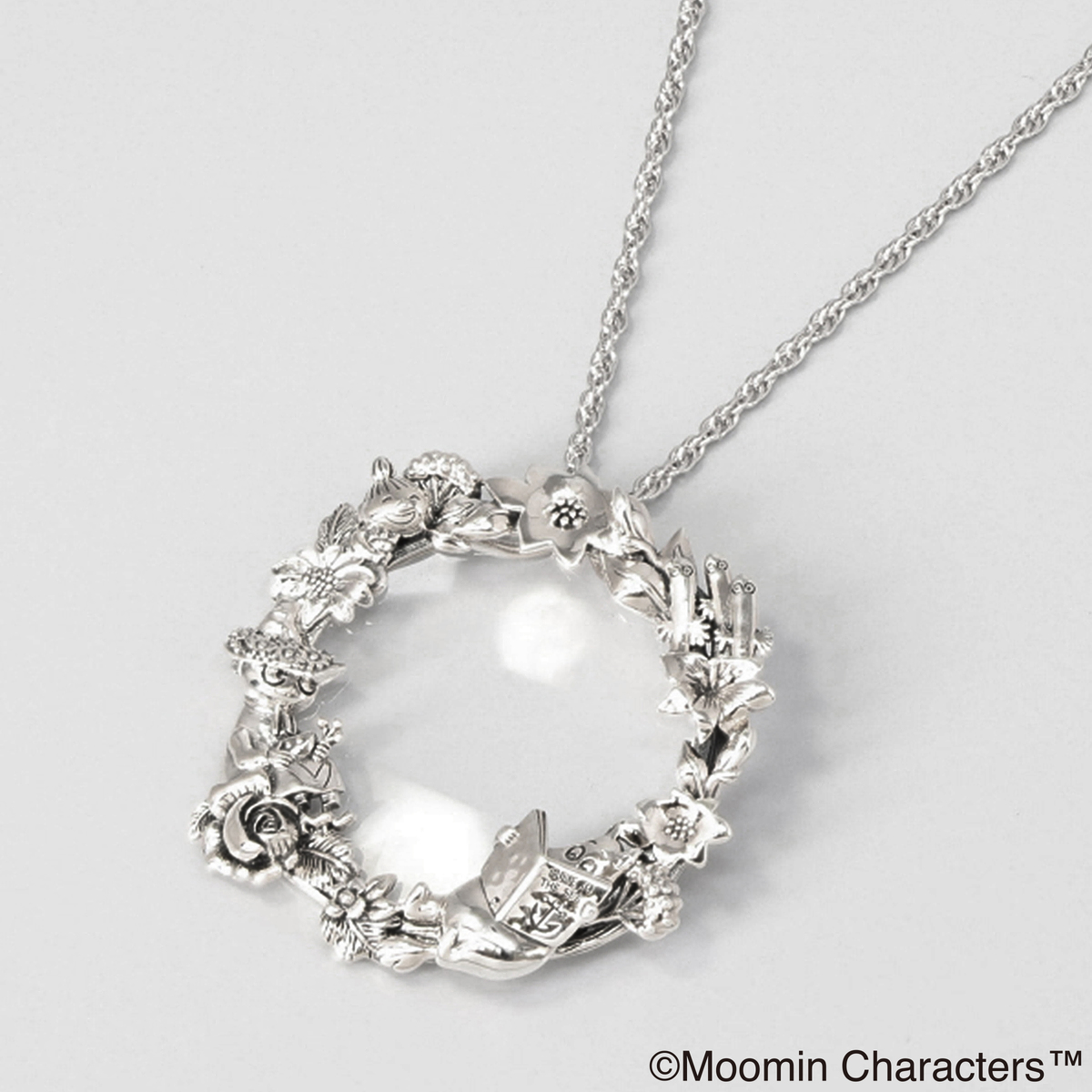 ムーミンと仲間たち、美しい草花をあしらったリース状のルーペペンダント。草花の中でムーミンたちが思い思いに楽しんでいる様子が描かれたデザインです
