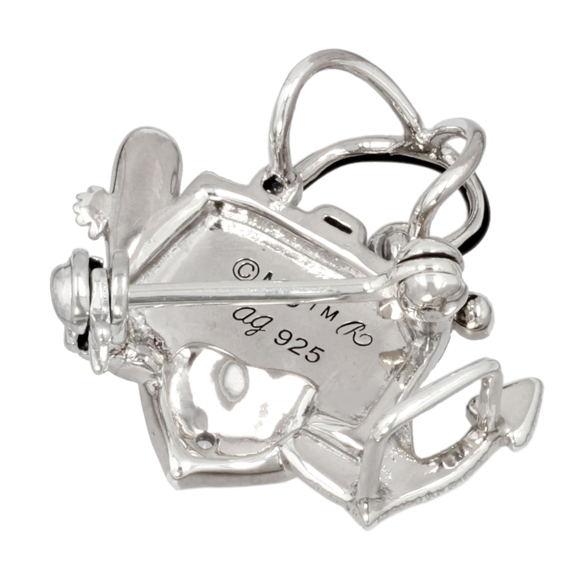 黒エナメルとホワイトトパーズが煌めくデザイン。かわいさに寄りすぎず、大人の装いにも自然となじむバランスです。地金はシルバーで、アンティーク仕上げが落ち着いた深みを演出。普段使いしやすく、専用ケース付きなので贈り物にもおすすめです