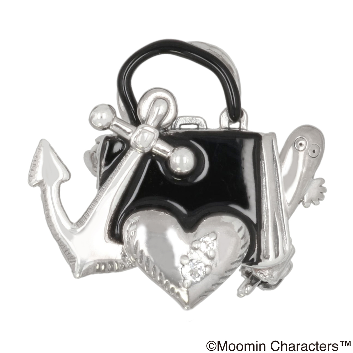 冒険の仲間たちと共に、ムーミンパパは船「海のオーケストラ号」に乗って旅を続け、さらに冒険の途中でたくさんの出来事に遭遇する様子が描かれています。そして、ついにムーミンパパはムーミンママと出会います。出会いのきっかけとなったムーミンママのバッグをモチーフに黒エナメル仕上げで、ニョロニョロと錨とハートがぎゅっと集まった、とてもかわいらしいブローチです