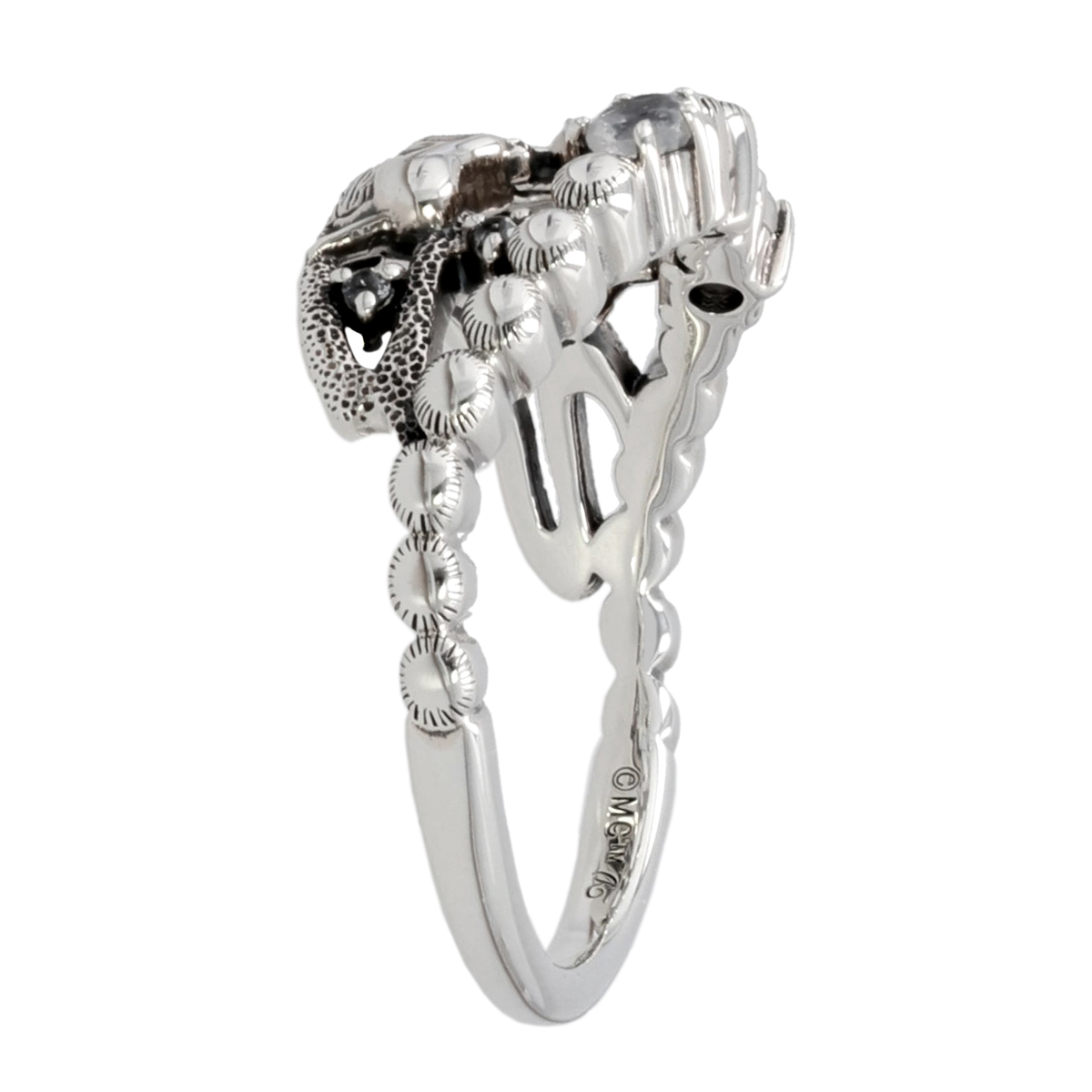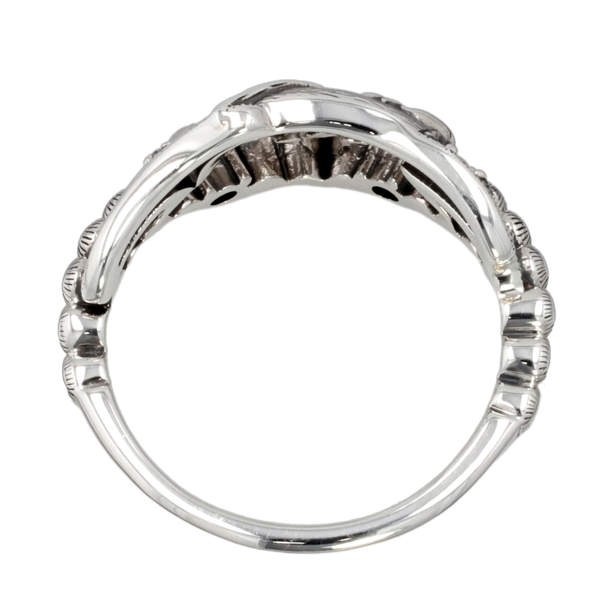 素材: [フェルスパー] ラウンドシェイプ・カボションカット 爪留め/接着 2石 [ホワイトトパーズ] ラウンドカット 爪留め・接着 3石 最大幅(約) 9.5mm 最小幅(約) 1.5mm 総重量(約) 3.1g [地金] シルバー925 [仕上げ] アンティーク仕上げ ■素材の大きさ・形・色合い、製品のサイズは1点1点多少異なります ■専用ケース付 【タイ製】