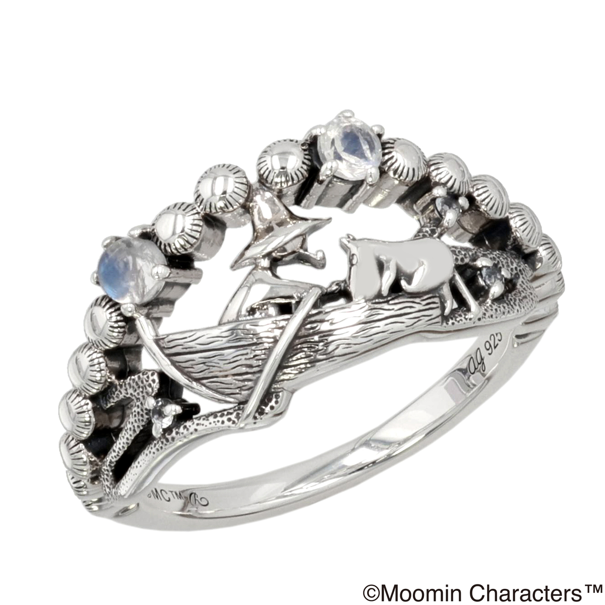 ムーミン谷へ大きな洪水が押し寄せ、ムーミン一家と仲間たちは離れ離れに。いろいろな事件が起き、ムーミンは警察から追われることに。そこへ助けにきたスナフキンのボートによじ登るムーミンを描いた、シックかつかわいらしいデザインのリングです