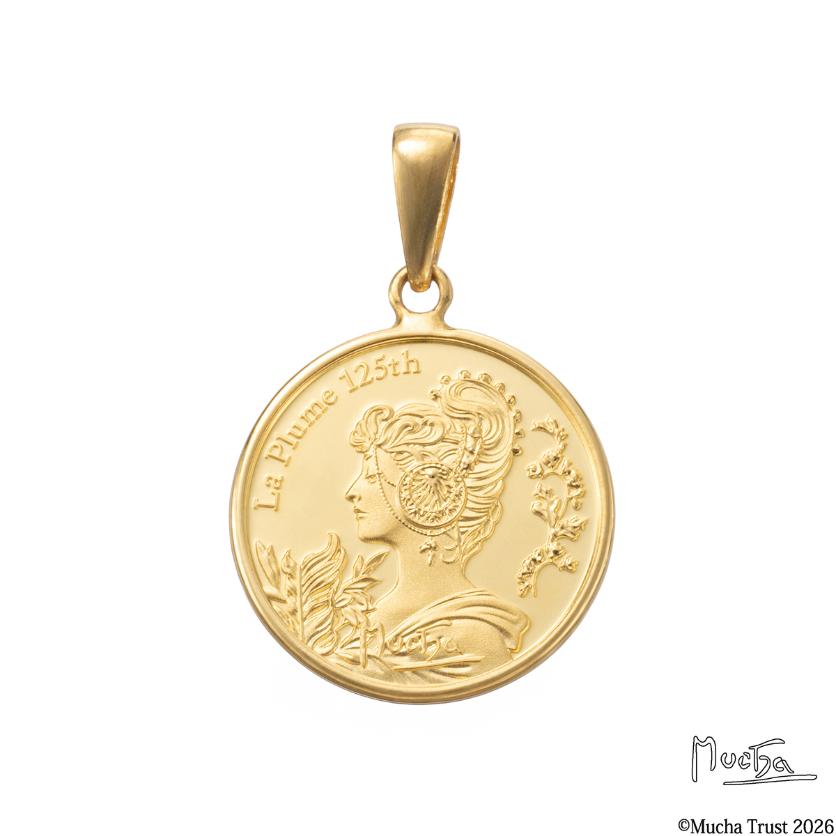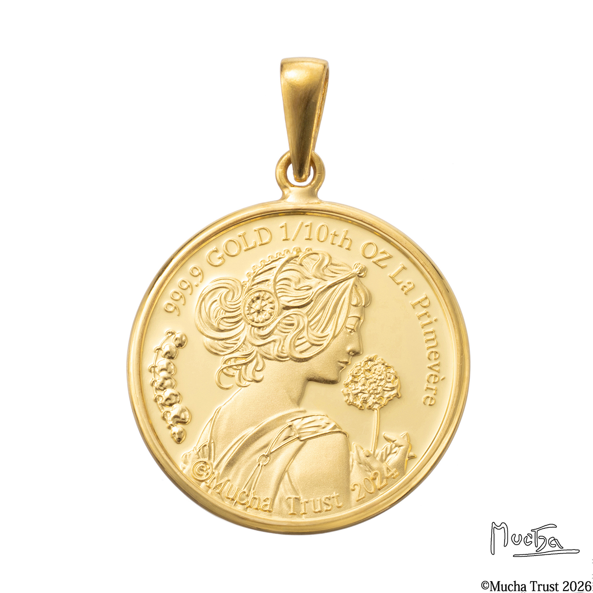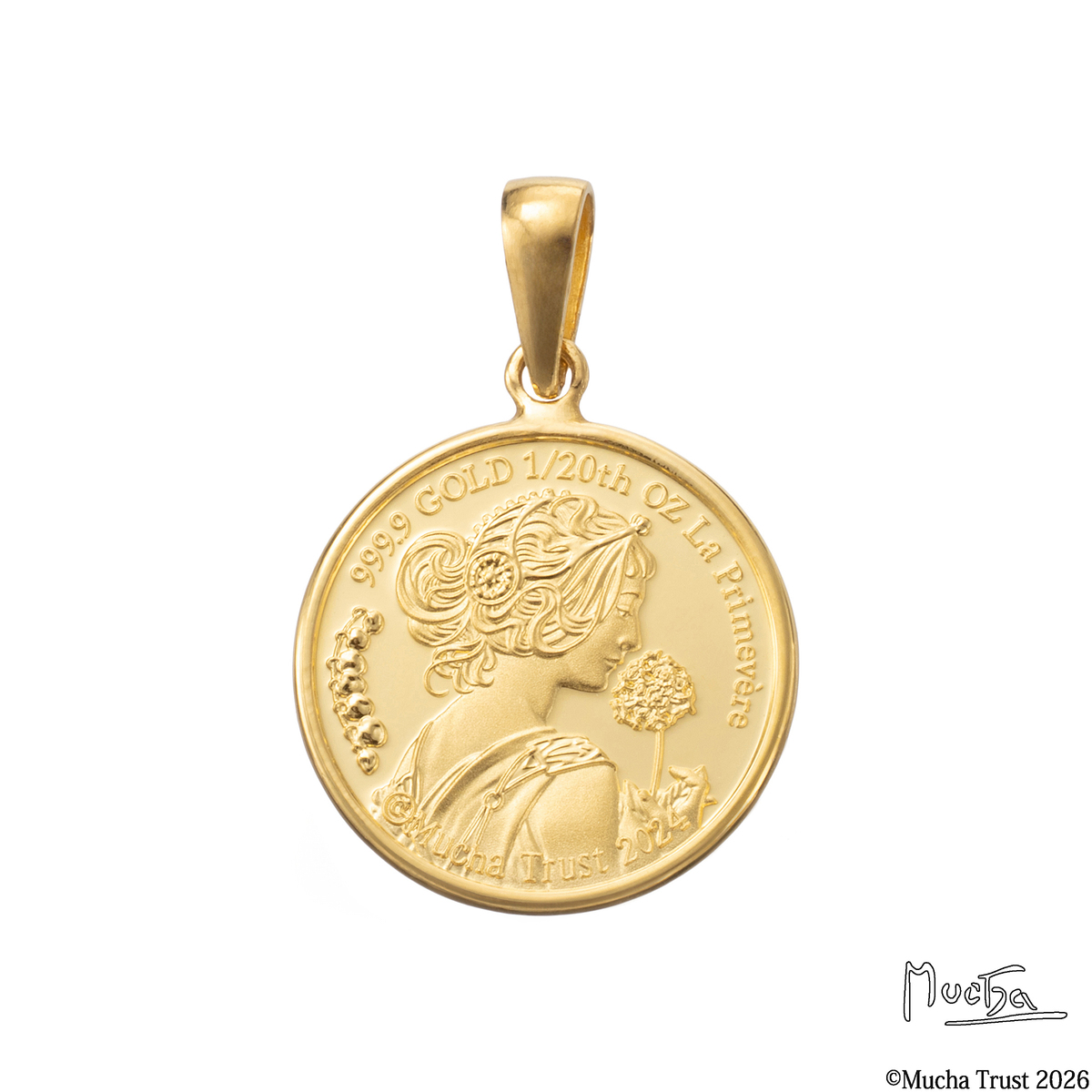 アール・ヌーヴォーを代表する画家の一人、アルフォンス・ミュシャの美しい作品『桜草と羽根』をモチーフにしたメダルを使用したペンダントヘッドです。ミュシャ財団より許諾された著作権使用契約を使用した正規ライセンス商品。ミュシャの芸術を価値ある純金の輝きとともに胸元でお楽しみください