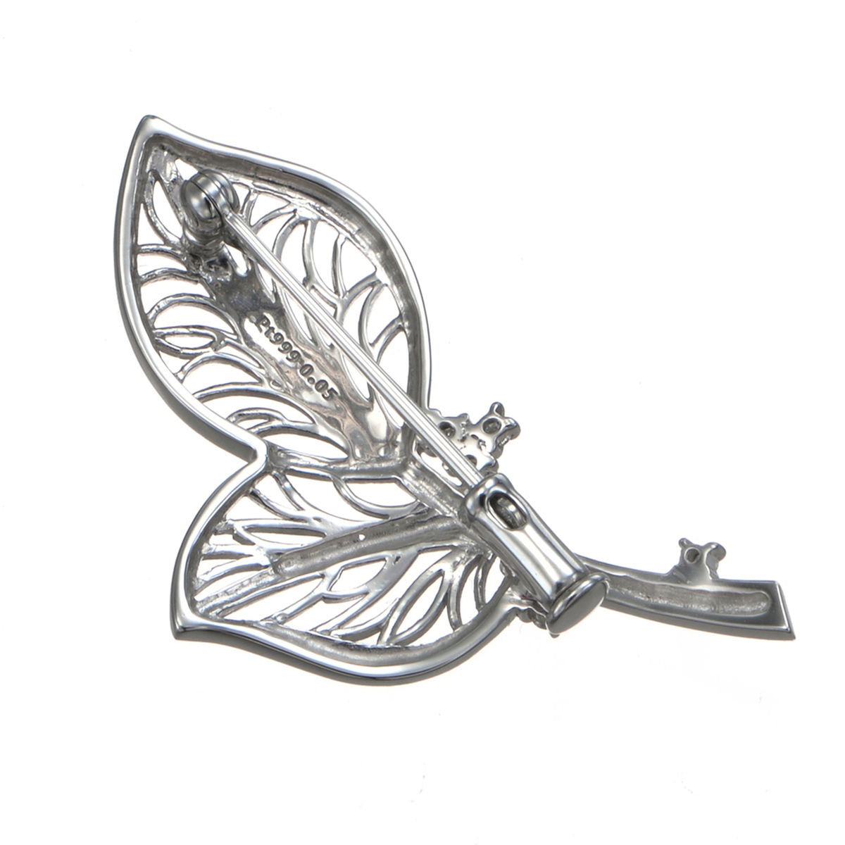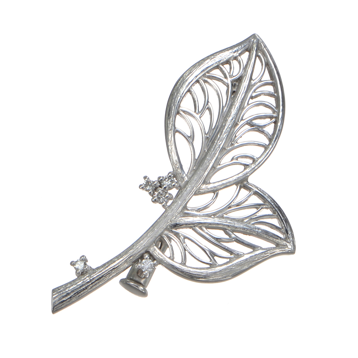リーフデザインのデザインブローチ。繊細な葉の模様を細かなテクスチャーで表現しました。アクセントに施したダイヤモンドが葉に朝露が滴るような煌めきを与えます