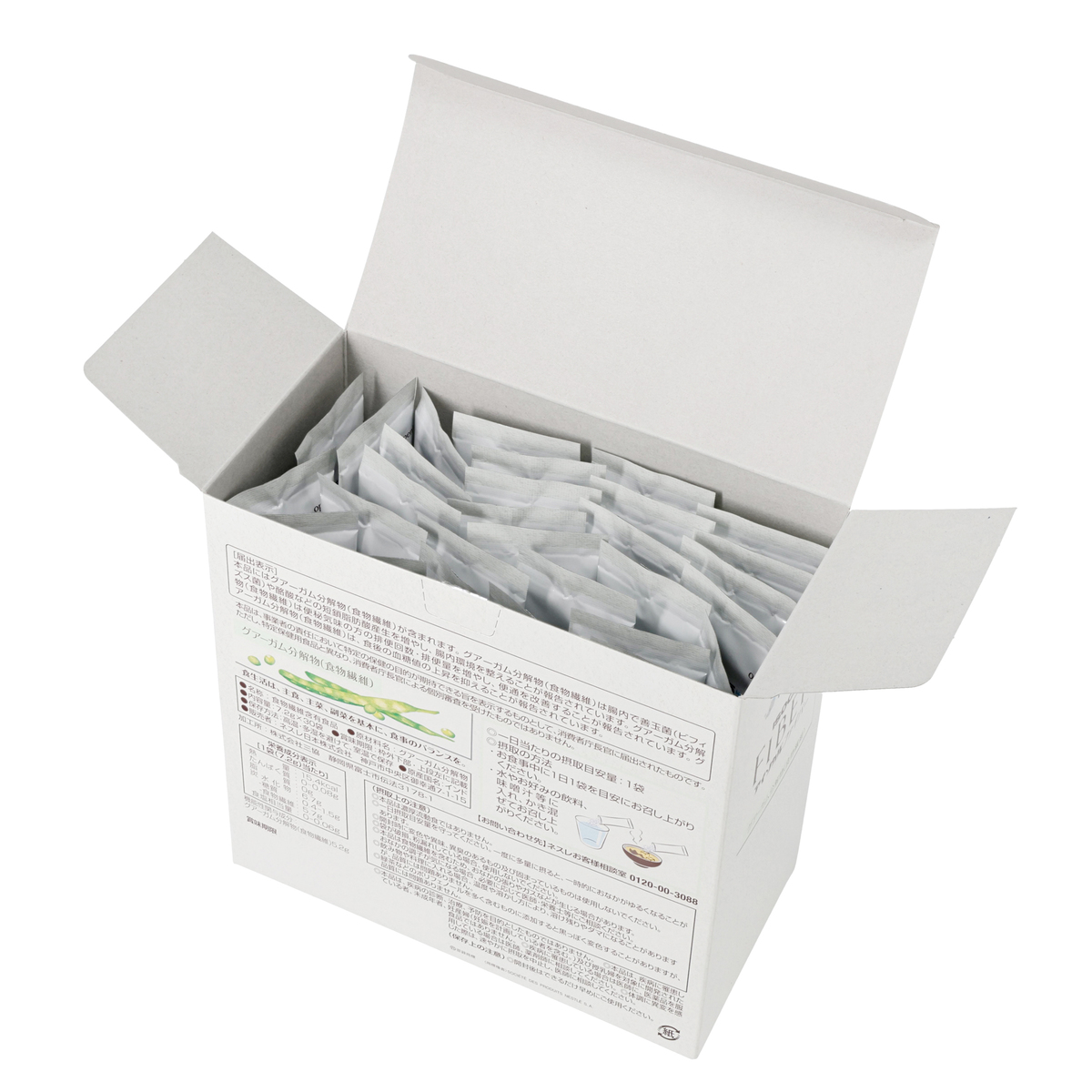 [アレルギー物質特定原材料8品目] なし [目安量] 1日1袋 [保存方法] 高温・多湿を避けて、室温で保存 <機能性表示食品> [届出番号] I116 [機能性関与成分] グアーガム分解物(食物繊維):5.2g [届出表示] 本品にはグアーガム分解物(食物繊維)が含まれます。グアーガム分解物(食物繊維)は腸内で善玉菌(ビフィズス菌)や酪酸などの短鎖脂肪酸産生を増やし、腸内環境を整えることが報告されています。グアーガム分解物(食物繊維)は便秘気味の方の排便回数・排便量を増やし、便通を改善することが報告されています。グアーガム分解物(食物繊維)は、食後の血糖値の上昇を抑えることが報告されています [栄養成分表示] [1袋(7.2g)当たり] 熱量:15.4kcal、たんぱく質:0-0.08g、脂質:0g、炭水化物:6.7g(糖質:0.4-1.5g、食物繊維:5.7g)、食塩相当量:0-0.06g 機能性関与成分: グアーガム分解物(食物繊維):5.2g [お召し上がり方] お食事中に1日1袋を目安にお召し上がりください。水やお好みの飲料、味噌汁等に入れ、かき混ぜてお召し上がりください [原産国] インド [注意事項] ※本品は、疾病の診断、治療、予防を目的をしたものではありません ※本品は、疾病に罹患している者、未成年者、妊産婦(妊娠を計画している者を含む)及び授乳婦を対象に開発された食品ではありません ※疾病に罹患している場合は医師に、医薬品を服用している場合は医師、薬剤師に相談してください ※体調に異変を感じた際は、速やかに摂取を中止し、医師に相談してください ※本品は、事業者の責任において特定の保健の目的が期待できる旨を表示するものとして、消費者庁長官に届出されたものです。ただし、特定保健用食品と異なり、消費者庁長官による個別審査を受けたものではありません ※食生活は、主食、主菜、副菜を基本に、食事のバランスを ※本品は濃厚流動食ではありません ※一日摂取目安量を守ってください。一度に多量に摂ると、一時的におなかがゆるくなることがあります ※開封時に変色や異味、異臭のあるもの及び固まっているものは使用しないでください ※袋が破損、粉漏れしている場合、使用しないでください ※本品は食物繊維を含むため、おなかの張りやガスなどが生じる場合があります。おなかの調子が気になる場合、必要に応じて医師・栄養士等にご相談ください ※飲み物や料理に入れる場合、温度や溶かし方により、溶け残りやダマになることがありますが、品質には問題ありません ※緑茶などのポリフェノールを多く含むものに添加すると黒っぽく変色することがありますが、品質には問題ありません [原材料] グアーガム分解物