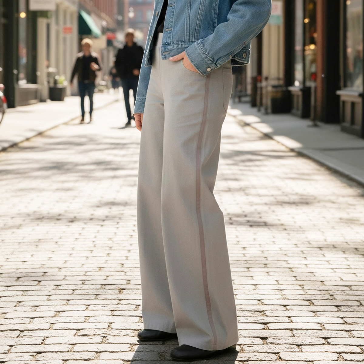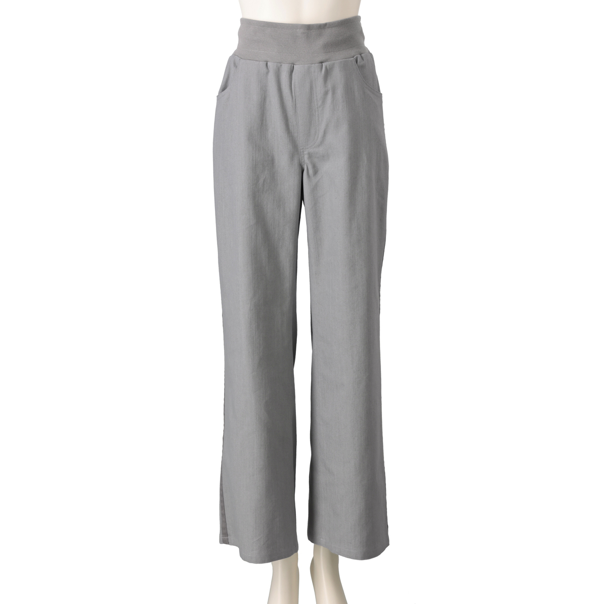 ウエストにリブを使用したワイドパンツ。見ための可愛さを演出し、おなか周りに締め付けを感じにくく。綿混のスラブ生地は、柔らかい風合いにするために生地洗いに。コーディネートしやすい優しい色合いです