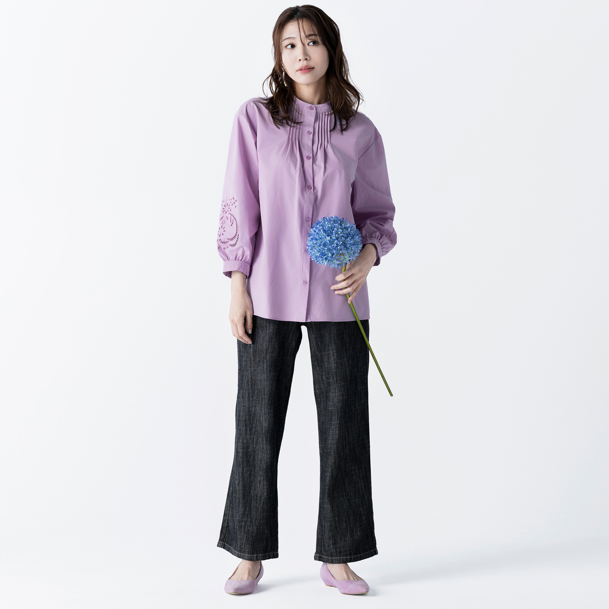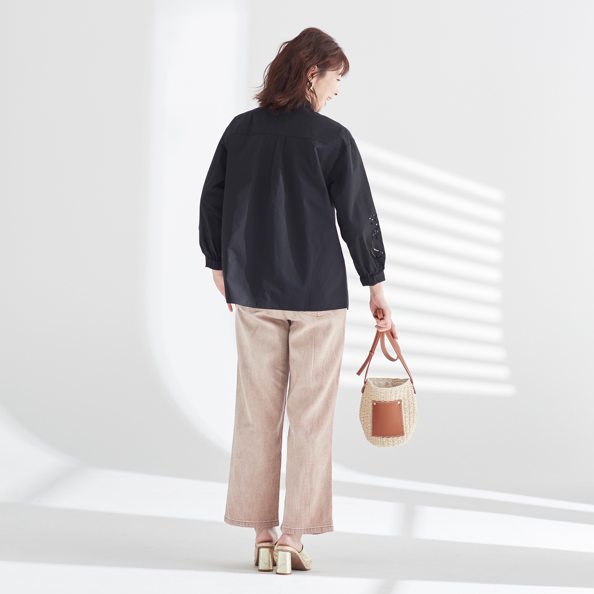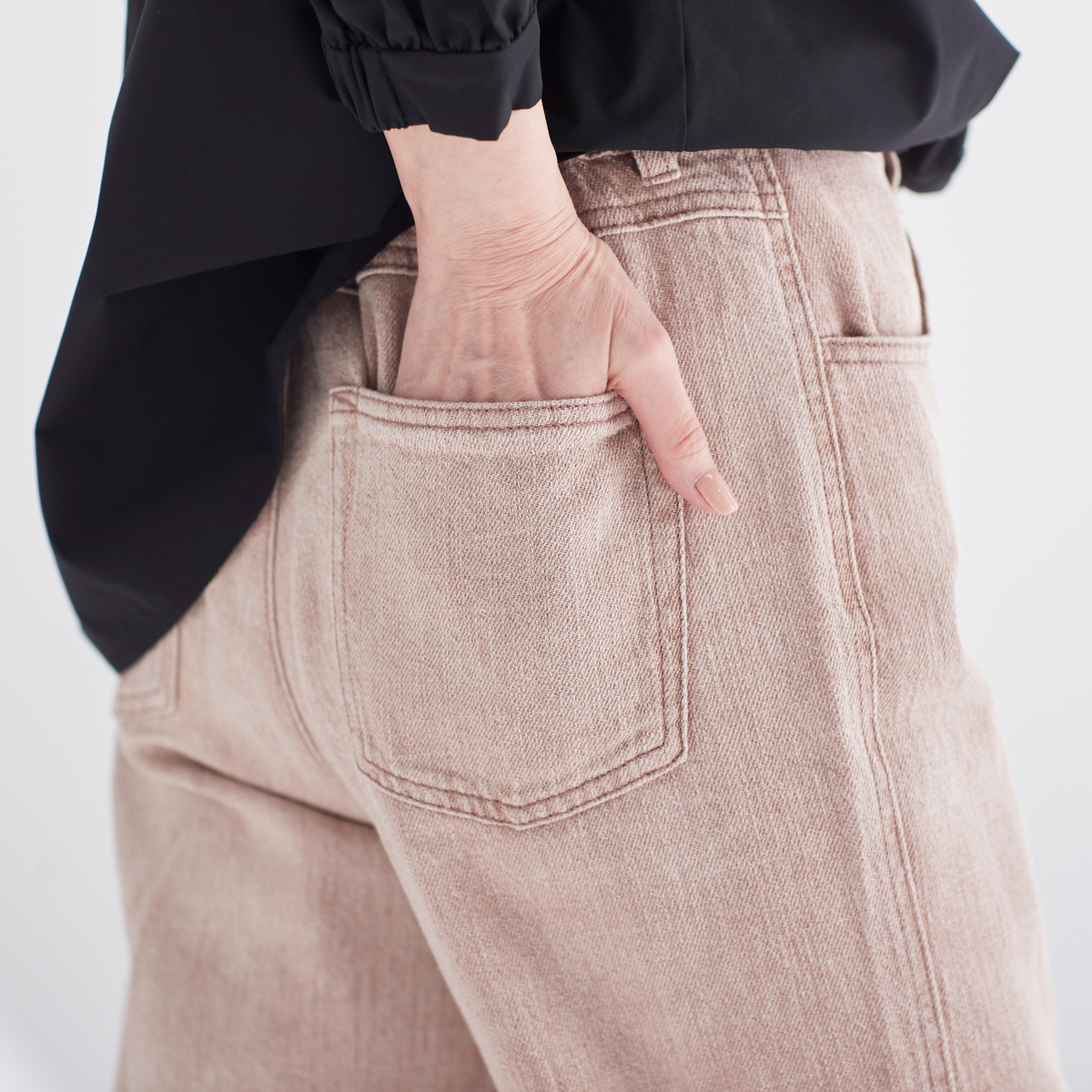 程良くゆとりのあるストレートシルエットで、股上は深めに仕上げました。フロントはファスナー開き仕様で着脱しやすくなっています