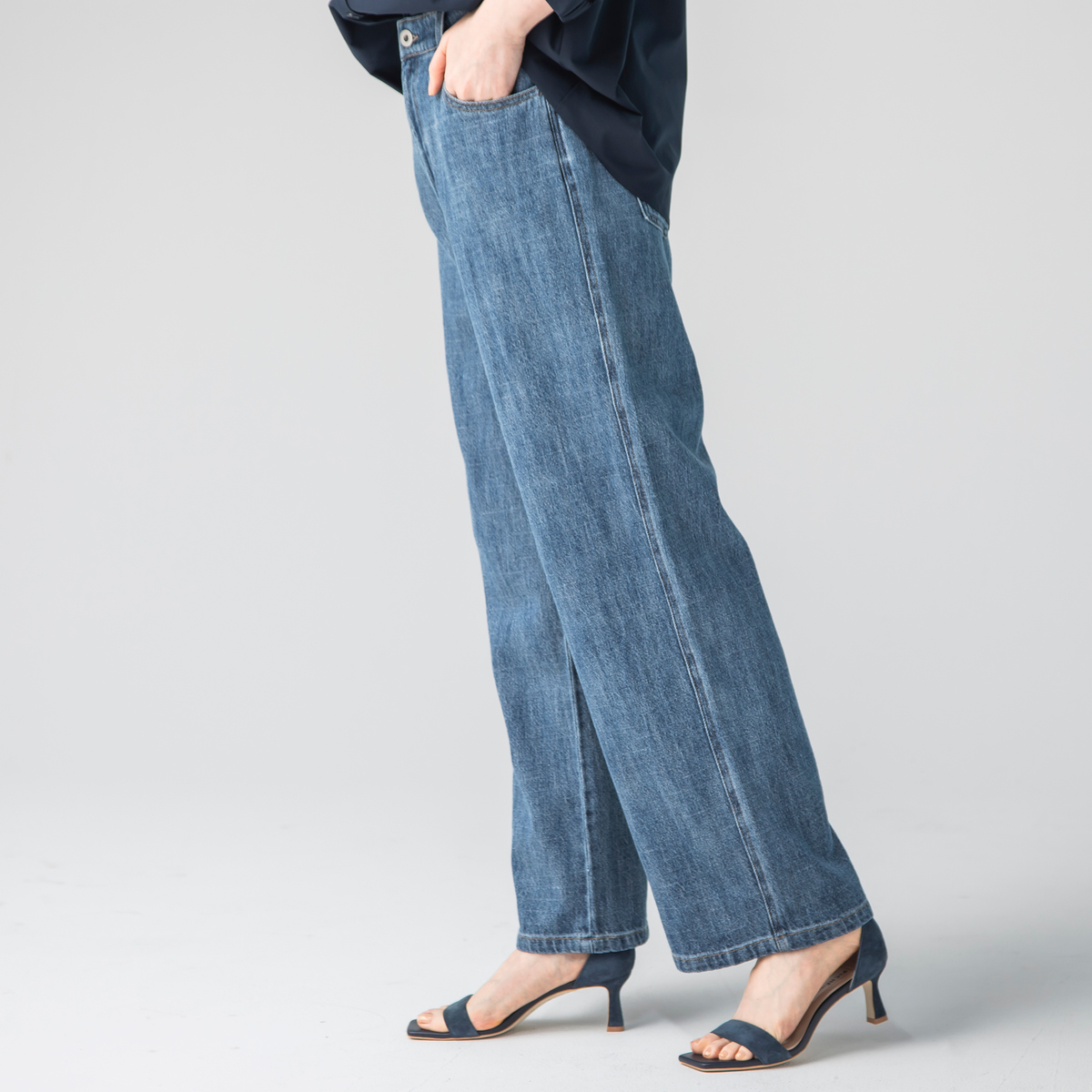 甘織りデニムを使用したストレートパンツ。糸の撚りを甘く織る事で生地に膨らみがあり、柔らかくごわつき感の少ない素材です