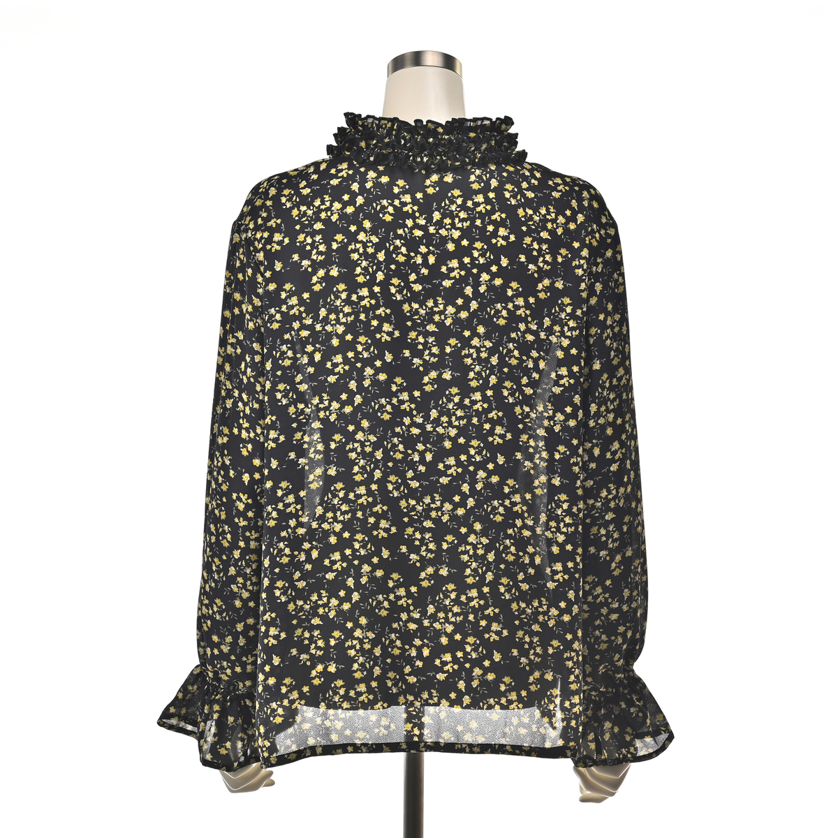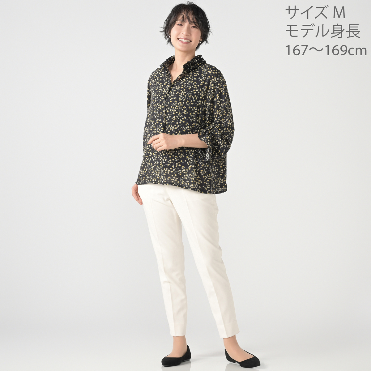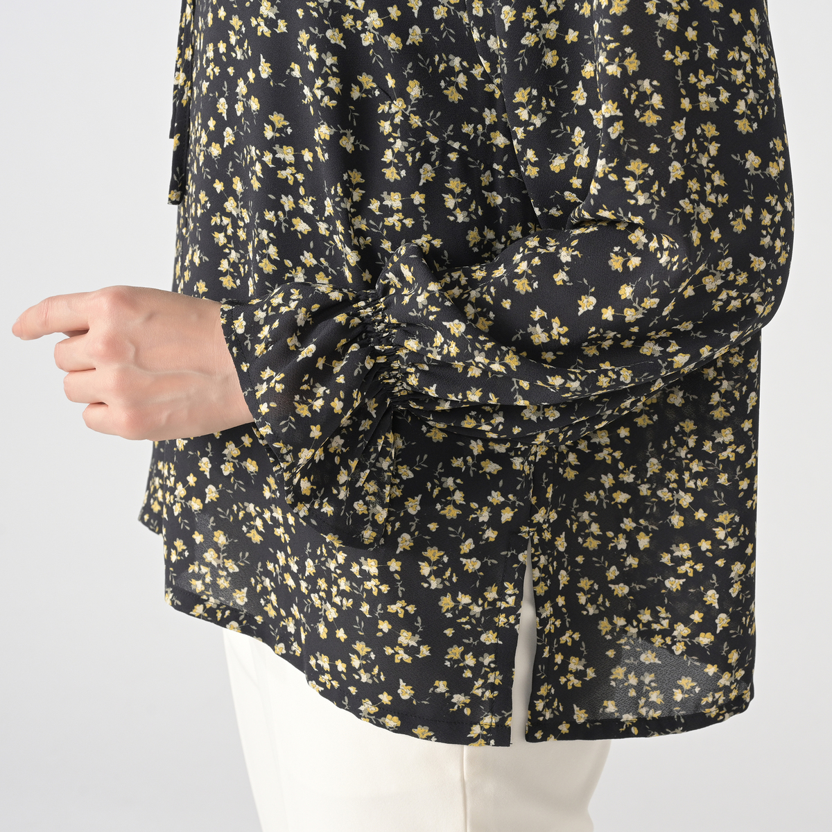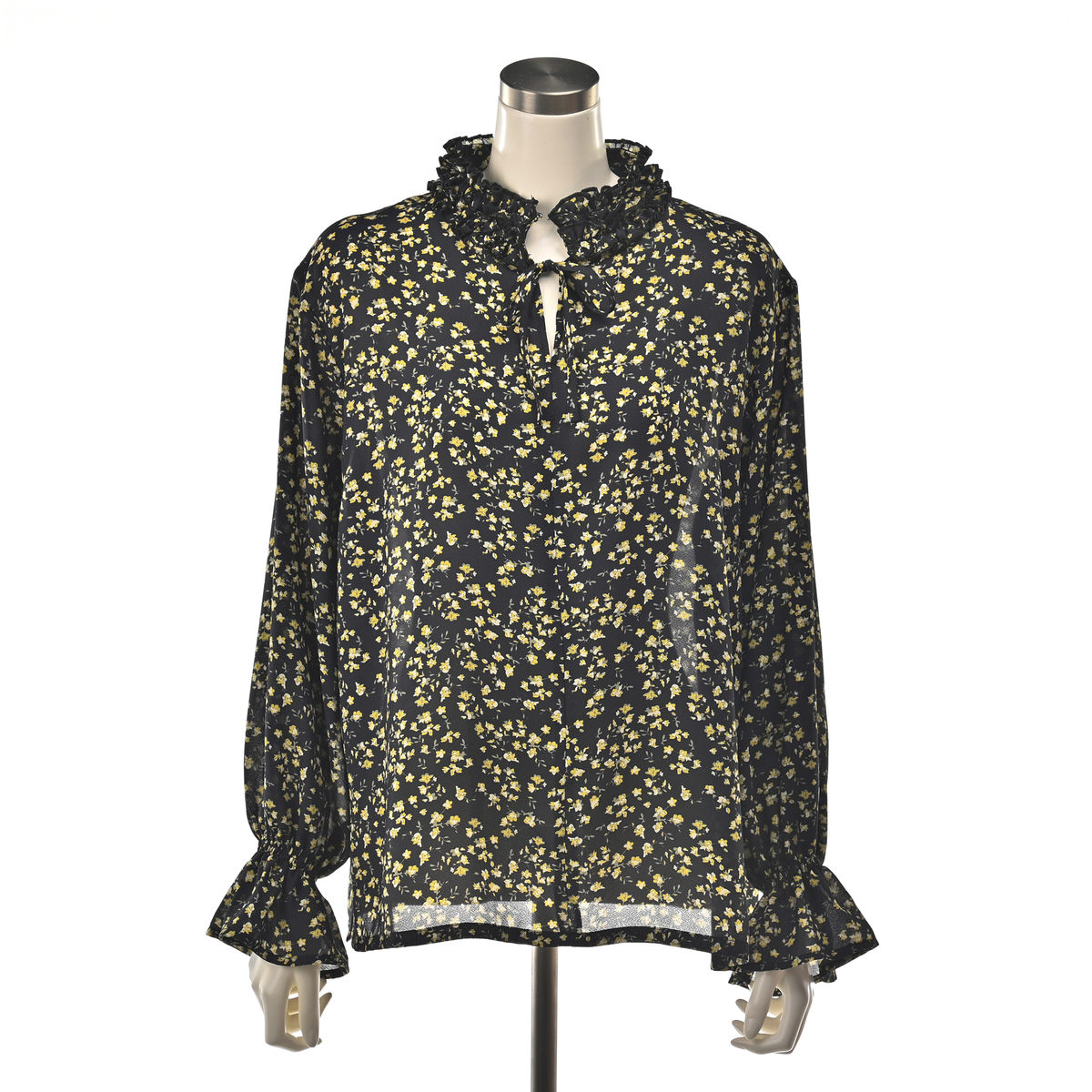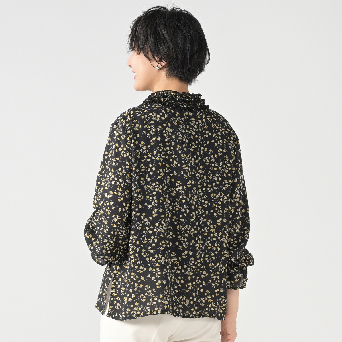 シフォンジョーゼットに小花柄をプリントしたフリルカラーブラウスです。首元のリボンは結んでフリルスタンドカラーに、ほどけばスキッパータイプとしても着用できるデザイン。やわらかな素材が軽やかさと上品さを演出します