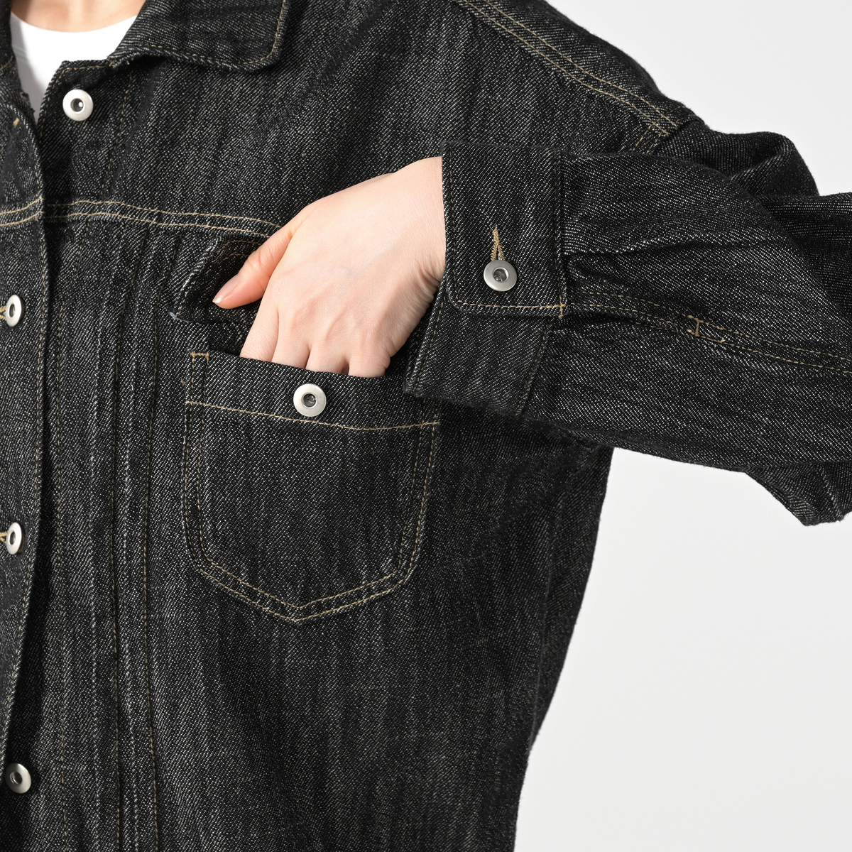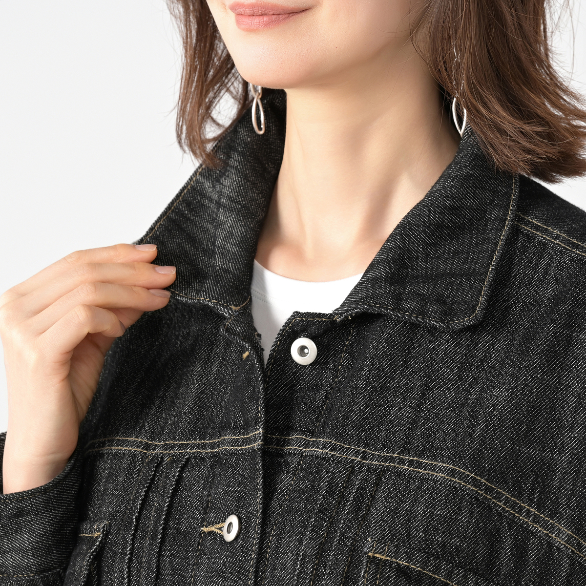 ウエストを絞らないストレートラインを、ゆったりとしたボックスシルエットでお作りしました。前立てのボタン、胸ポケット、ヨーク切替えなど、定番ディテールを踏襲した、幅広い年齢層に受け入れられやすいデザインです。前中心部分のピンタックが縦ラインを強調しています