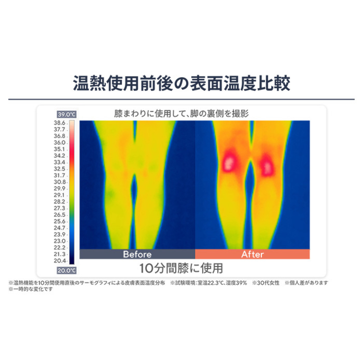 [商品内容] ・本体 ・ツボ押しアタッチメント大2個・小2個 ・充電用ケーブル ※ACアダプターは付属しておりません。 [サイズ(約)] 幅93×奥行5×高さ26cm [使用可能サイズ] ひざ周囲:30〜52cm ふくらはぎ周囲:27〜52cm 足サイズ:20〜29cm [重量]約630g [充電時間] 約120分充電で約80分使用可能 [定格時間]10分 [材質] コントローラー:ABS、PP ベルト:ポリエステル、ナイロン、PVC [使用方法] ソファーに座るなど着座の状態で使用します 膝、ふくらはぎ、足など使用したい部位にベルト内側にあるタグの位置を確認して両脚にベルトを巻き付け面ファスナーをとめて着用します コントローラーの電源ボタンを約2秒長押しして電源を入れ、モード、エアー強度、温熱レベルを各ボタンで調整し、10分間使用します ※途中で止めたい場合は、コントローラーの電源ボタンを約2秒長押しすると電源が切れます ※ツボ押しアタッチメントはベルト内側の面ファスナー以外のお好きな箇所に接着できますが刺激を強く感じる場合もありますので必ずレベル1からお試しください ■取り扱い説明を充分にご確認の上、ご使用下さい 【中国製】 [注意事項] ※本商品は医療機器ではありません ※次のような方は使用しないでください。症状を悪化させるおそれがあります ・医師からマッサージを禁じられている方 ・例:血栓[そく(塞)栓]症、重度の動脈瘤、急性静脈瘤、各種皮膚炎、皮膚感染症[皮下組織の炎症を含む]など ・次のような医療機器用電子機器をお使いの方:ぺースメーカーなどの体内植込み型電子機器、人工心肺などの生命維持用医用電子機器、心電計などの装着型医用電子機器 ・重度の血行障害のある方 ・骨折・骨粗しょう症など骨に異常のある方 ・知覚障害や意思表示のできない方 ・飲酒中、生理中、妊娠中、出産直後、授乳中の方 ・安静を必要としている方や体調がすぐれない方 ・毛細血管拡張を起こしている方 ・自分で意思表示のできない方や身体の不自由な方 ・17歳以下のお子様 ※上記以外で身体に異常を感じる時は、いかなる場合も使用しないでください。事故、体調不良、症状を悪化させる原因になります ※次のような方は必ず医師とご相談の上ご使用ください 国で定められている指定難病を患っている方 ・悪性腫瘍のある方、心臓に障害のある方 ・急性疾患の方 ・変形性関節炎、リウマチ、痛風の方 ・有熱性疾患、感染症疾患、伝染病疾患の方 ・ねんざ、肉離れなど、急性とう(疼)痛性疾患の方 ・体温38℃以上(有熱期)の方 ・(例:急性炎症症状[けん(倦)怠感、悪寒、血圧変動などの強い時期、衰弱しているとき]) ・けんしょう(腱鞘)炎の方 ・呼吸器に障害がある方 ・糖尿病などによる高度な末梢循環障害のある方 ・脳神経に異常を感じている方(てんかんなど) ・美容整形を行っている方 ・介護を受けている方、または付き添いなしで日常生活ができない方 ・その他医師の治療を受けている方や上記以外にとくに身体の異常を感じている方 ※使用前や使用中、肌や身体に異常を感じたときは、ただちに使用を中止し、医師にご相談ください ※1回あたり10分以内でご使用ください。連続使用する場合は、1時間以上の間隔をあけ、同一部位1日2回までのご使用にとどめてください ※エアーバッグに故意に力を加えて無理やり止めないでください。事故やけがのおそれがあります
