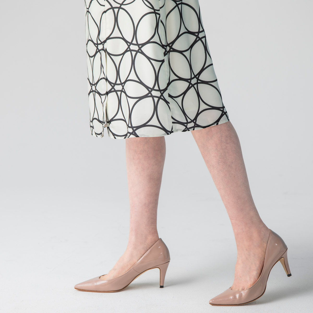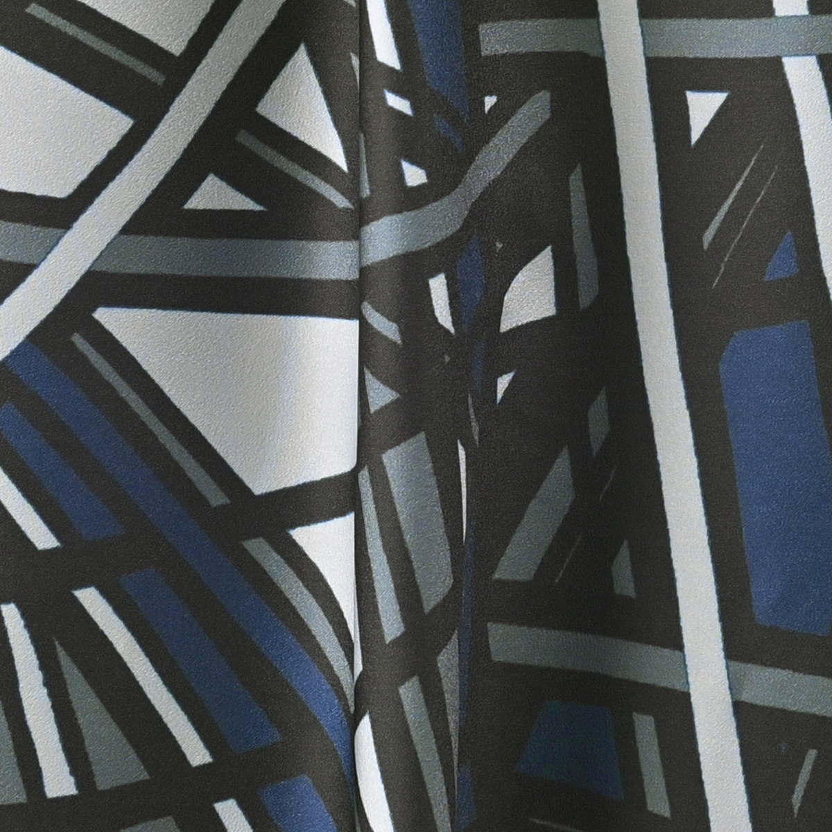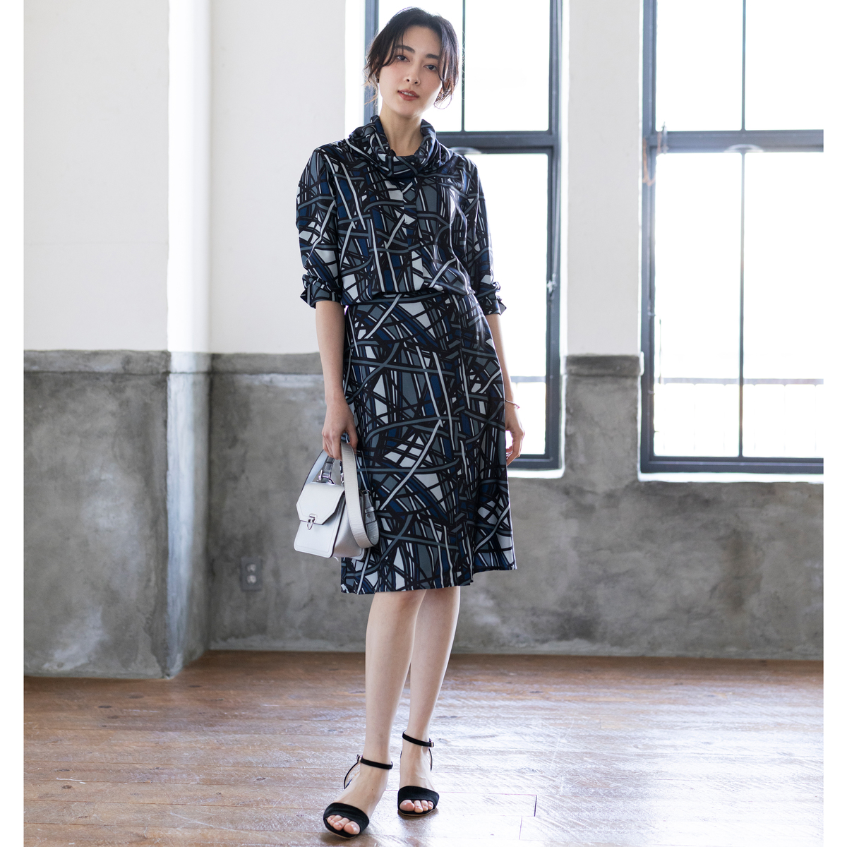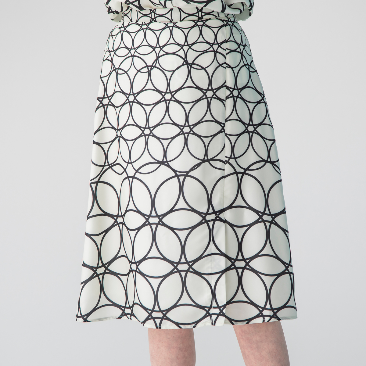サテンの微光沢と大胆な幾何プリントが華やかなスカートです。左脇にタックを入れたAラインのラップ風シルエットが動きに美しさを添え、後ろゴムウエストで心地よくフィットします